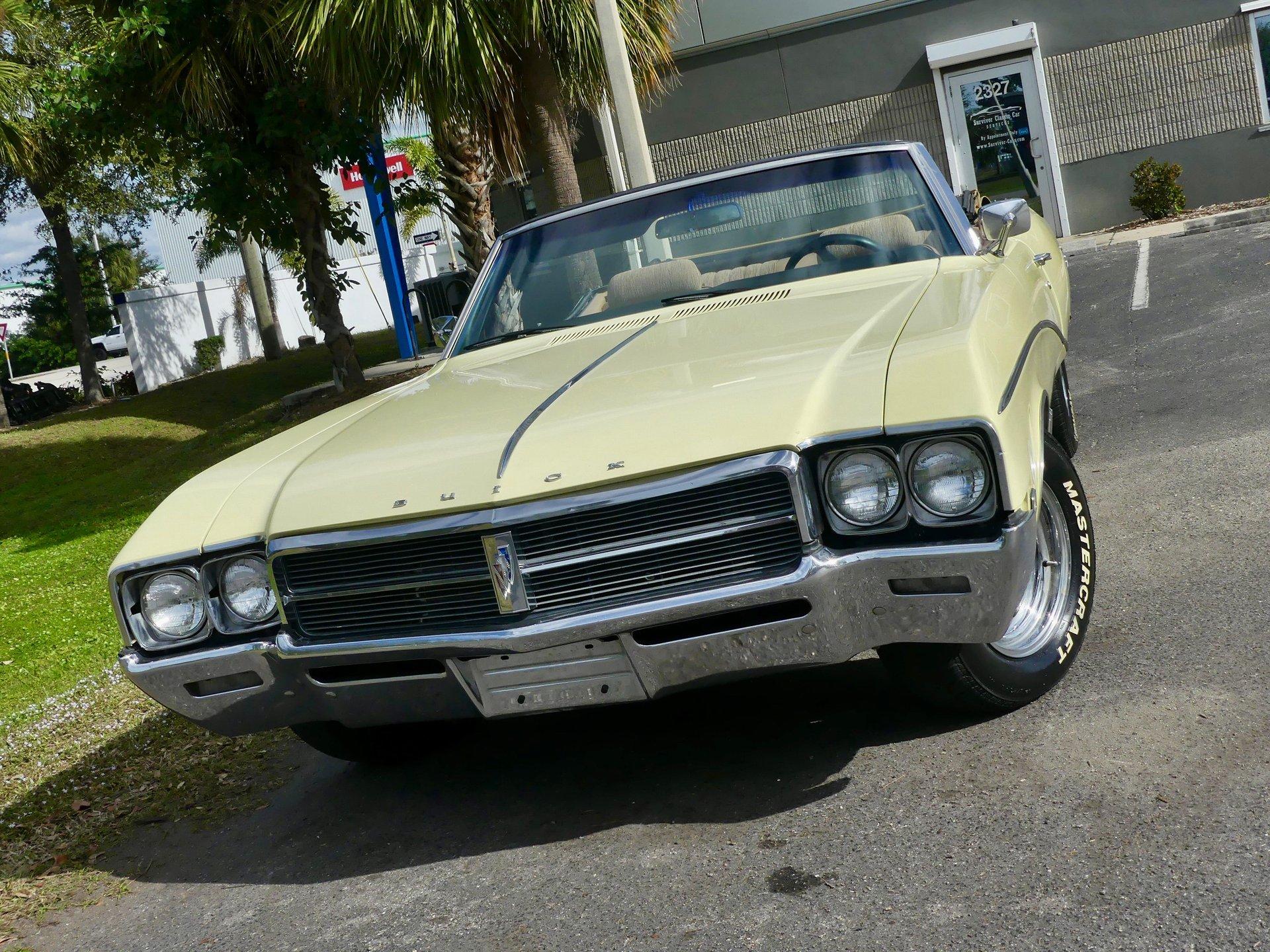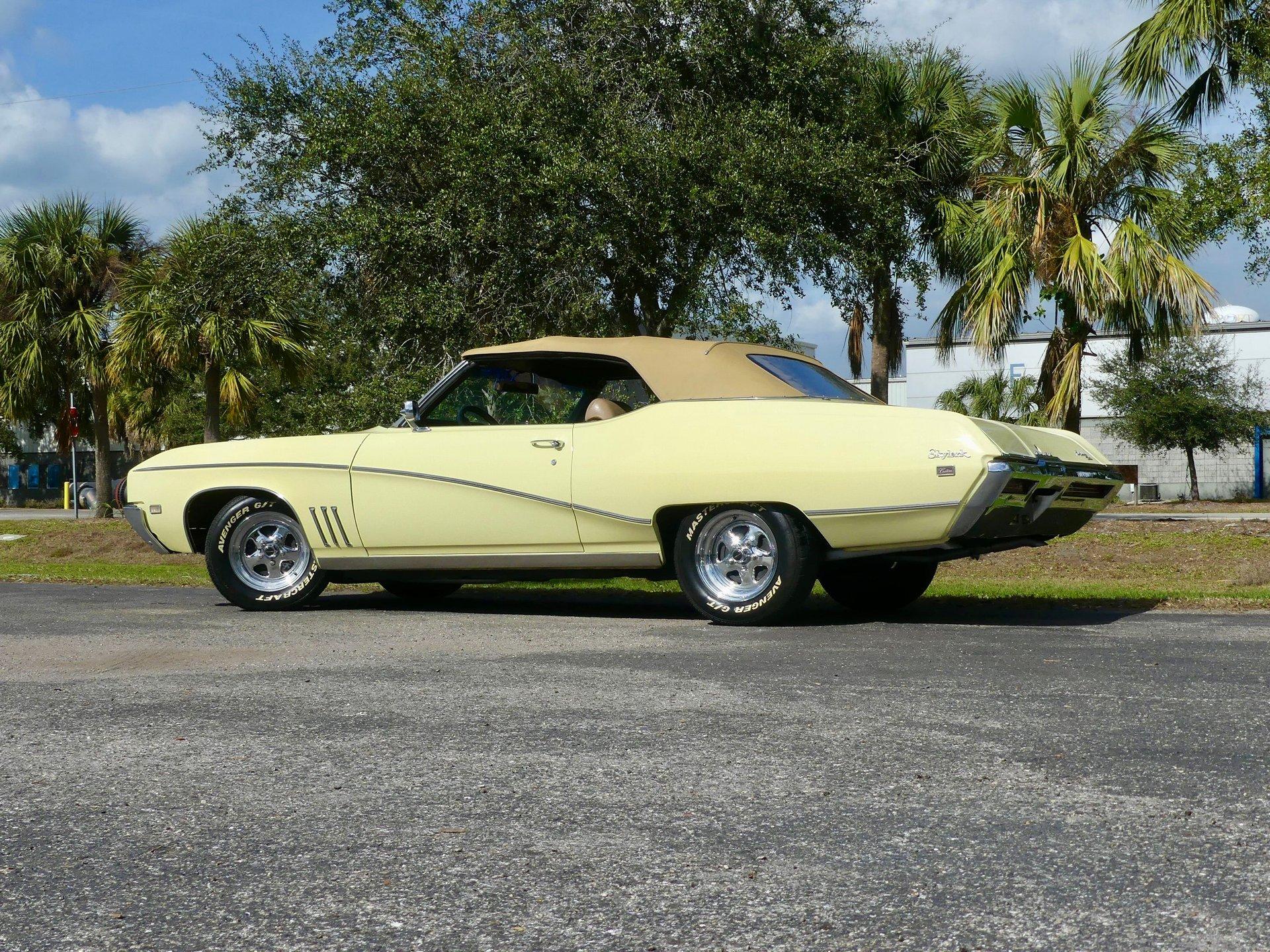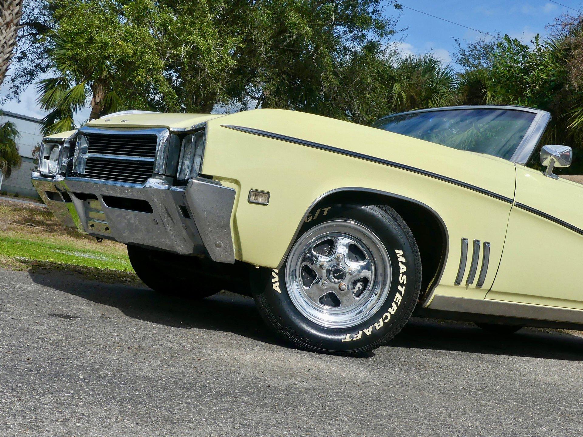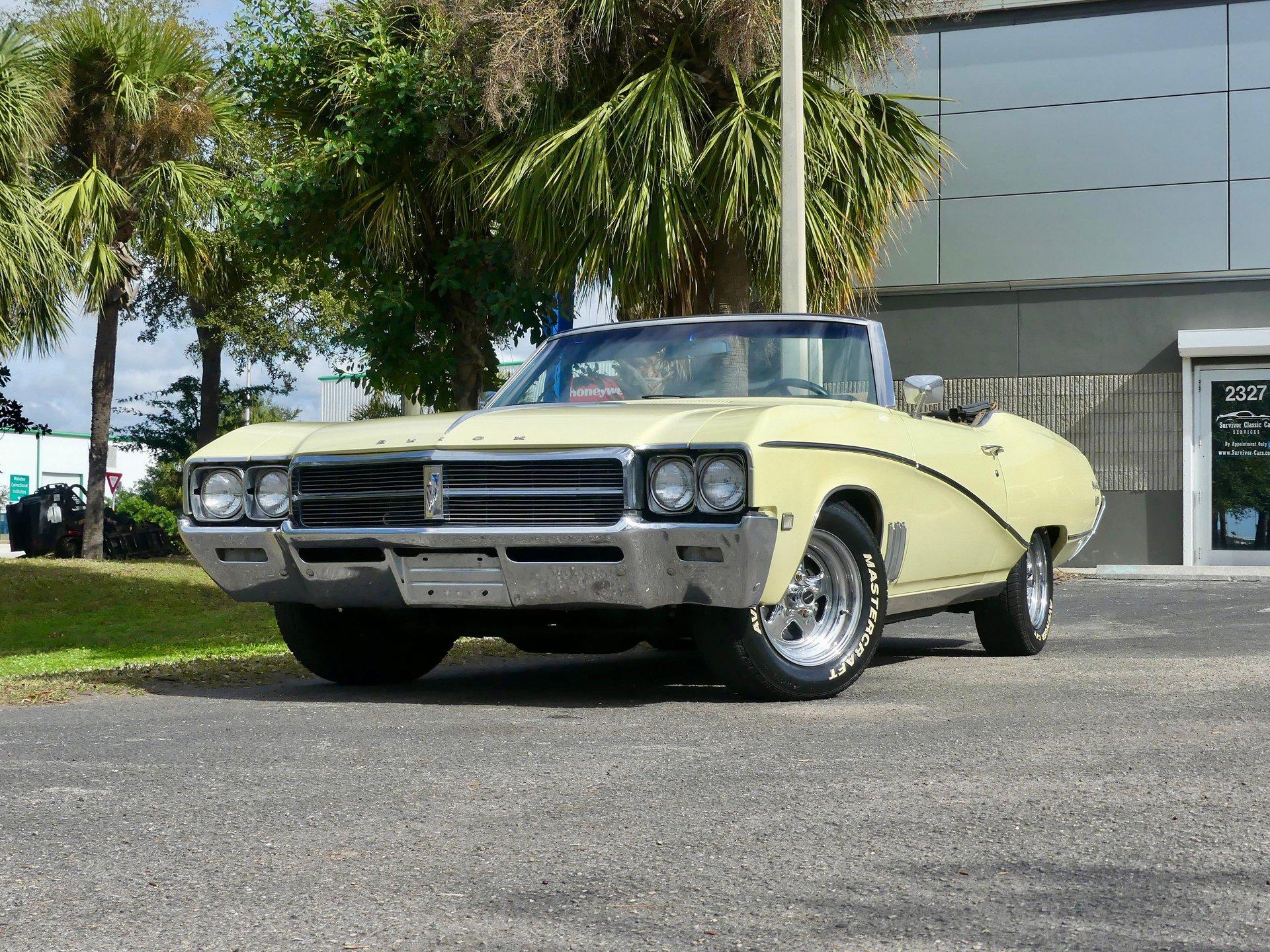 This 1969 Buick Skylark custom convertible is a muscle car, with a big block 455 CID V8 under the hood and a Turbo 400 automatic transmission. But it is also a luxury ride with power steering, power brakes, A/C, tilt steering, comfortable bucket seats, a power convertible top, and an AM/FM/CD player in the dash.