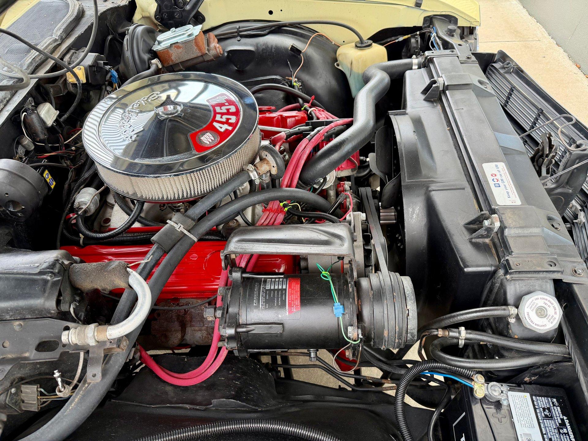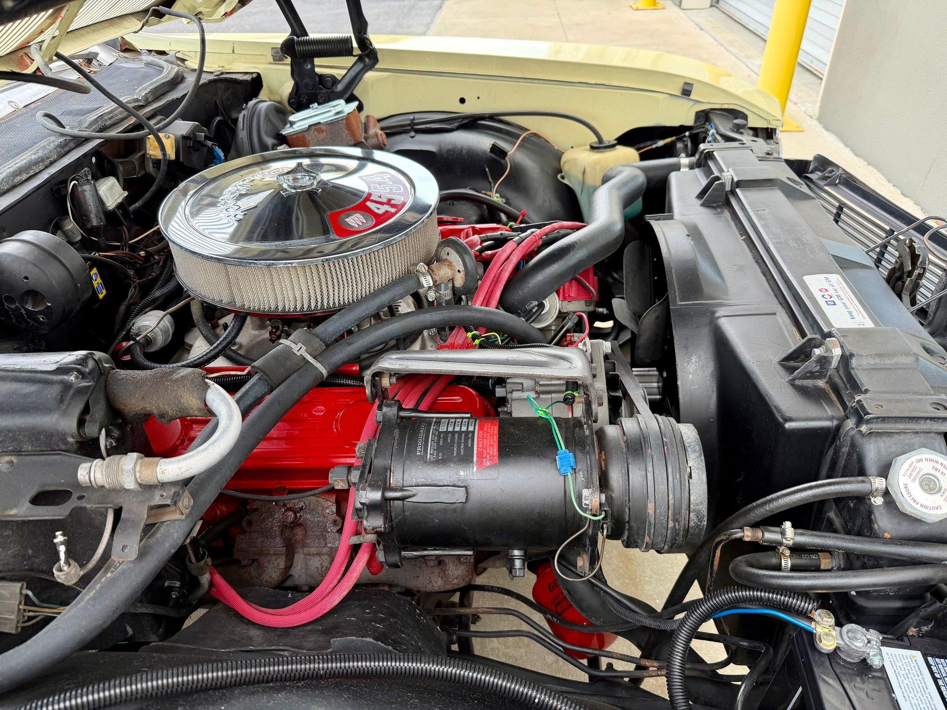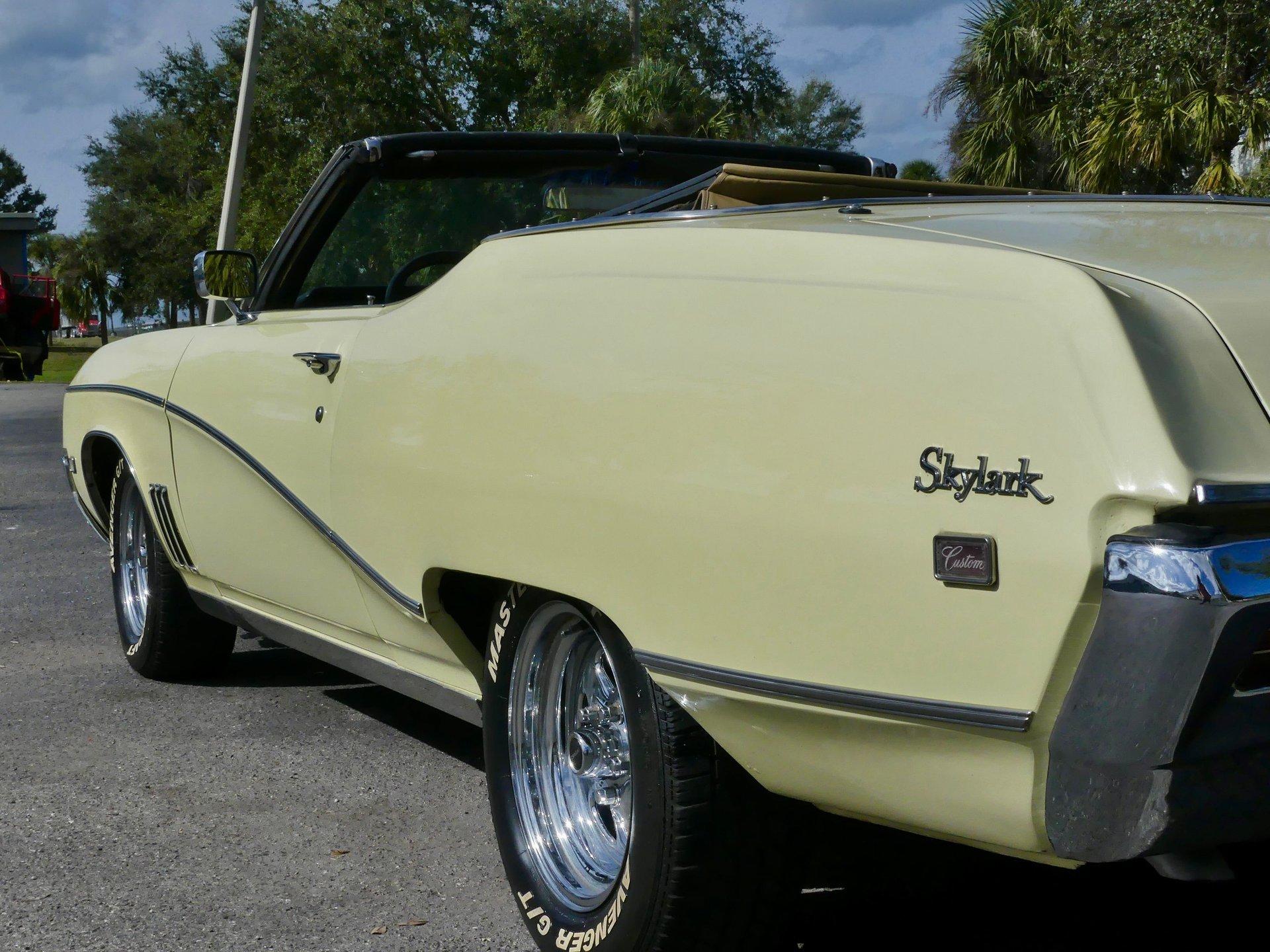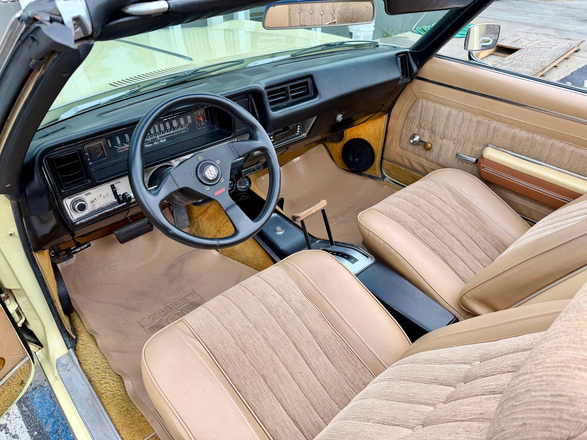 This Skylark wears the factor colors of Cameo Cream with a Buckskin convertible top and Buckskin interior. Cragar 5-spoke wheels have been added, which are always a nice upgrade. The steering wheel and radio have also been swapped for functionality and good looks. There is an upgraded intake, Edelbrock carburetor, and HEI distributor for a bit more power from the 455.