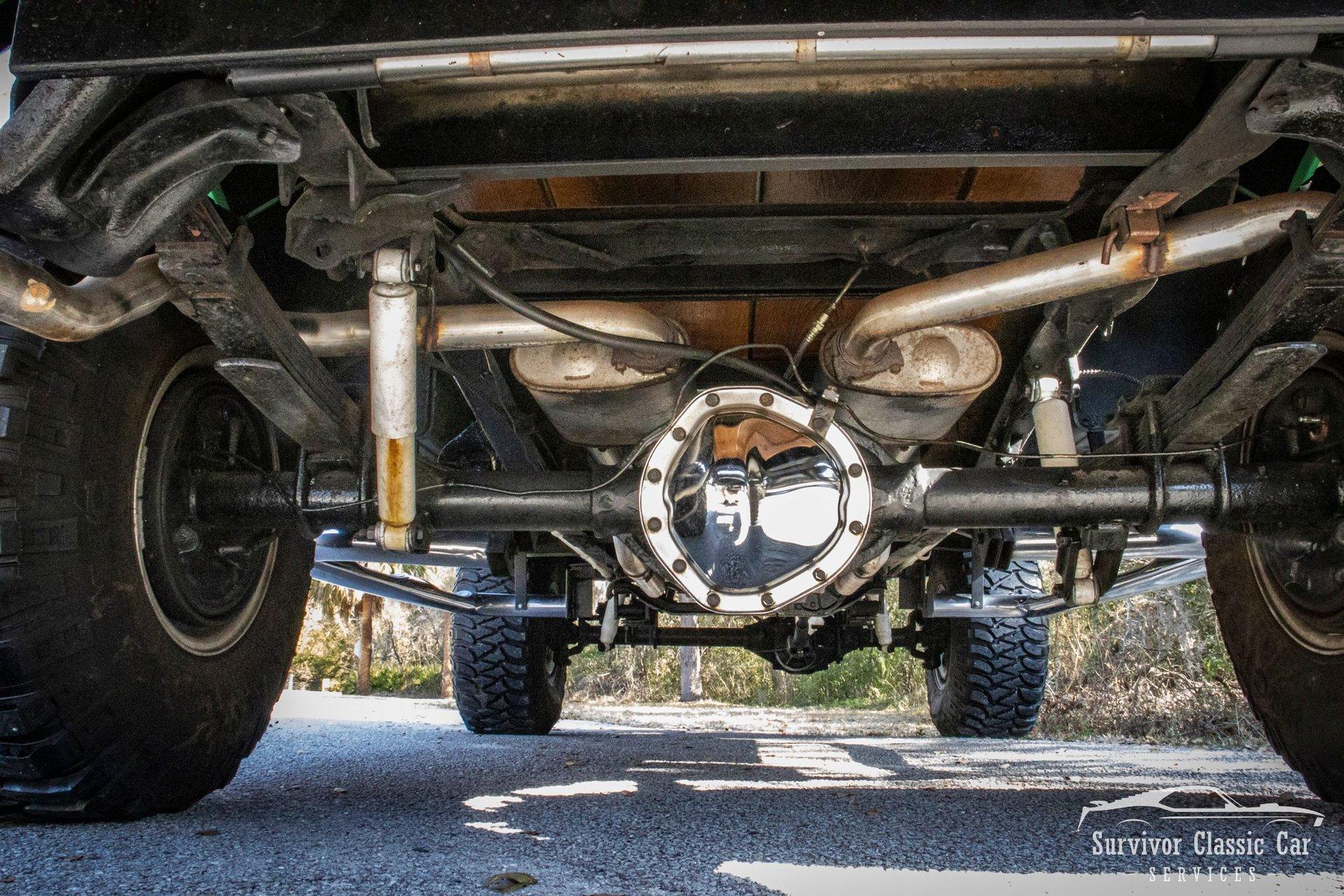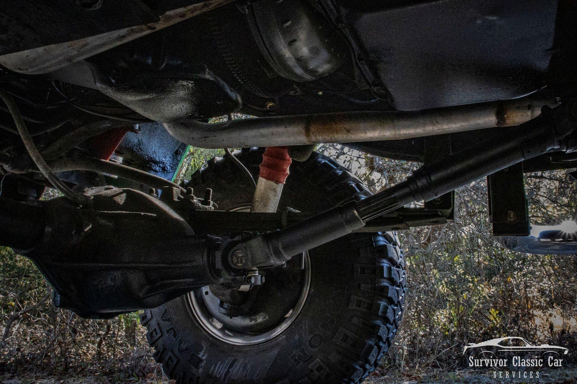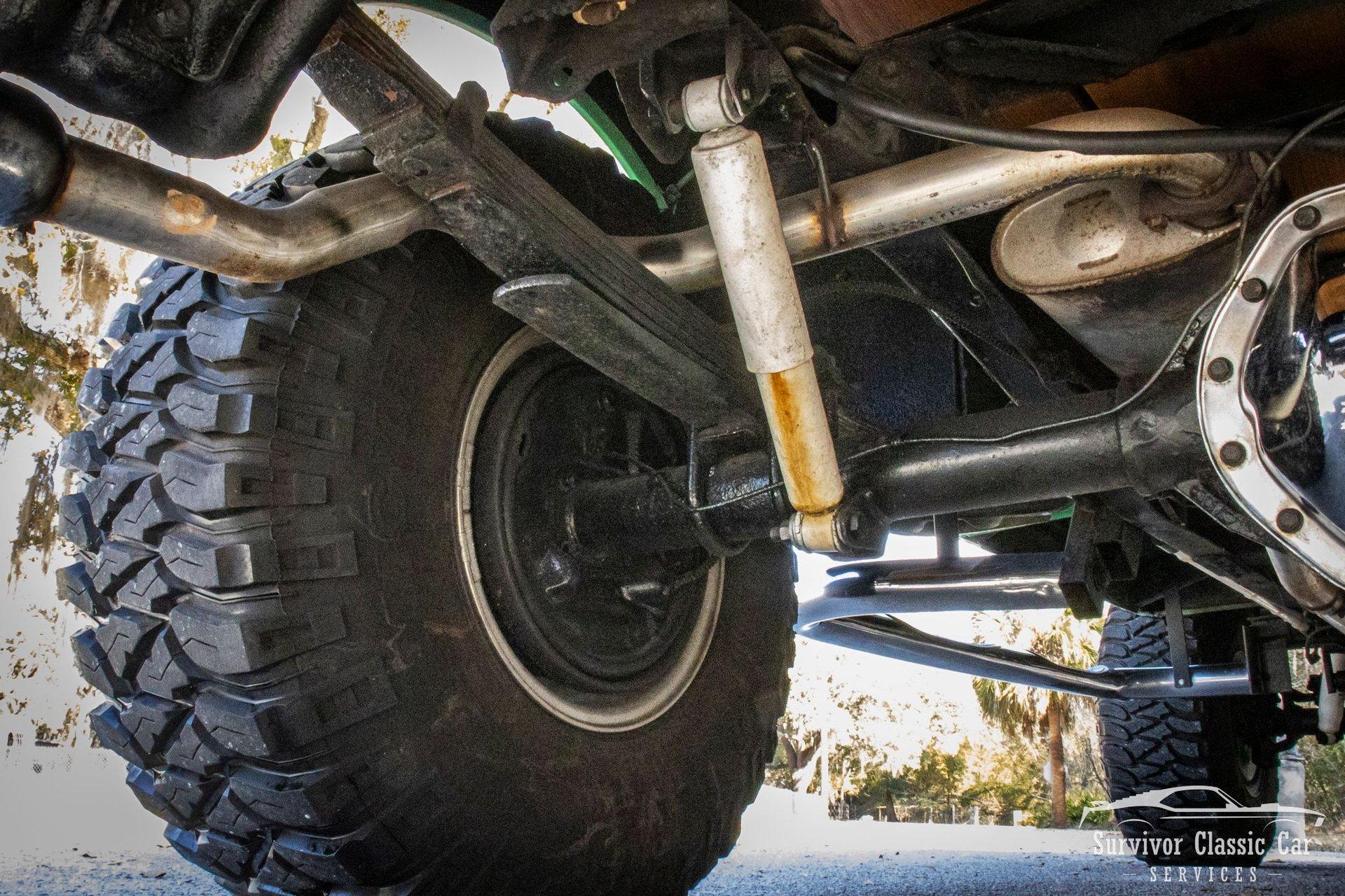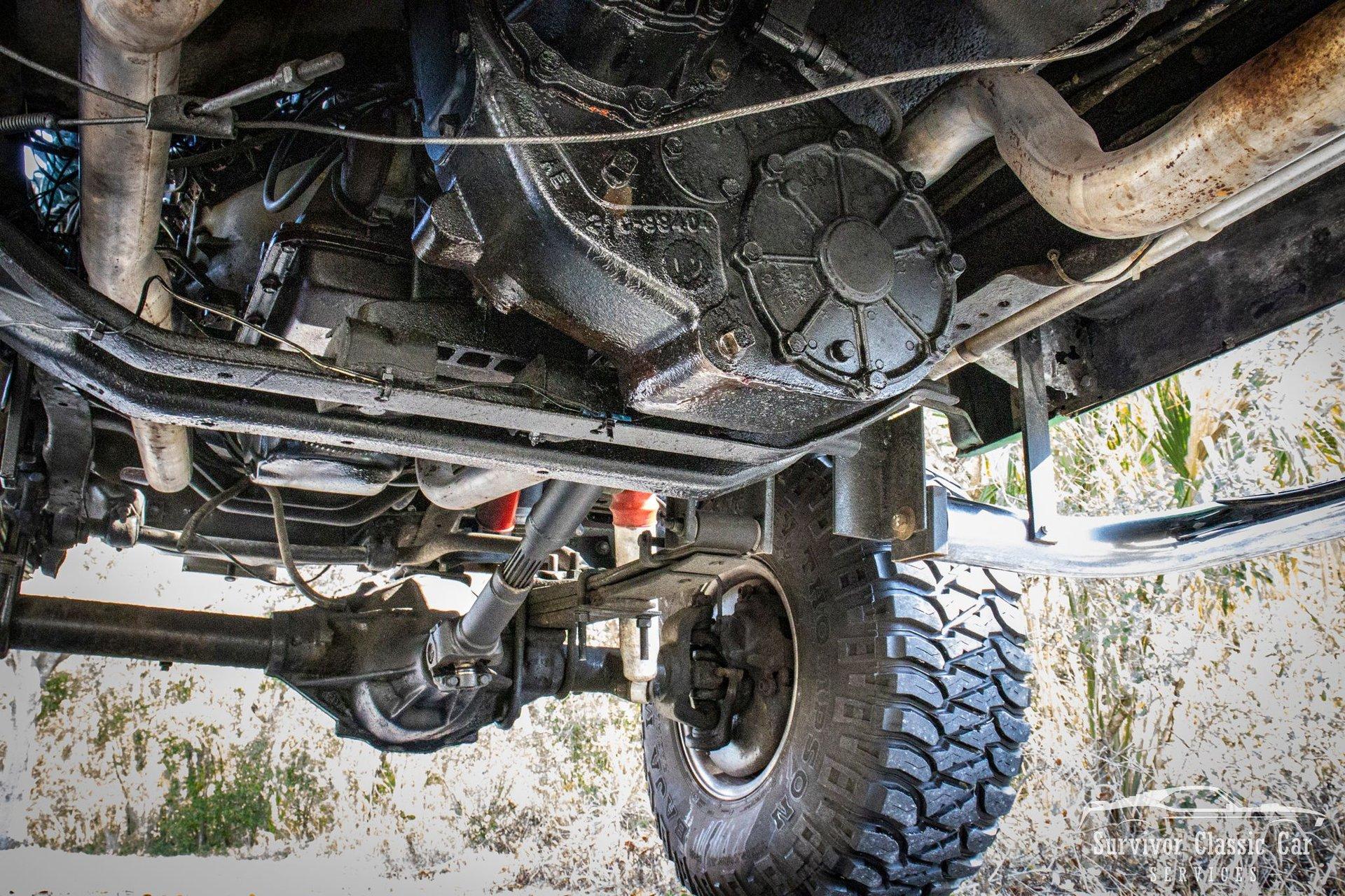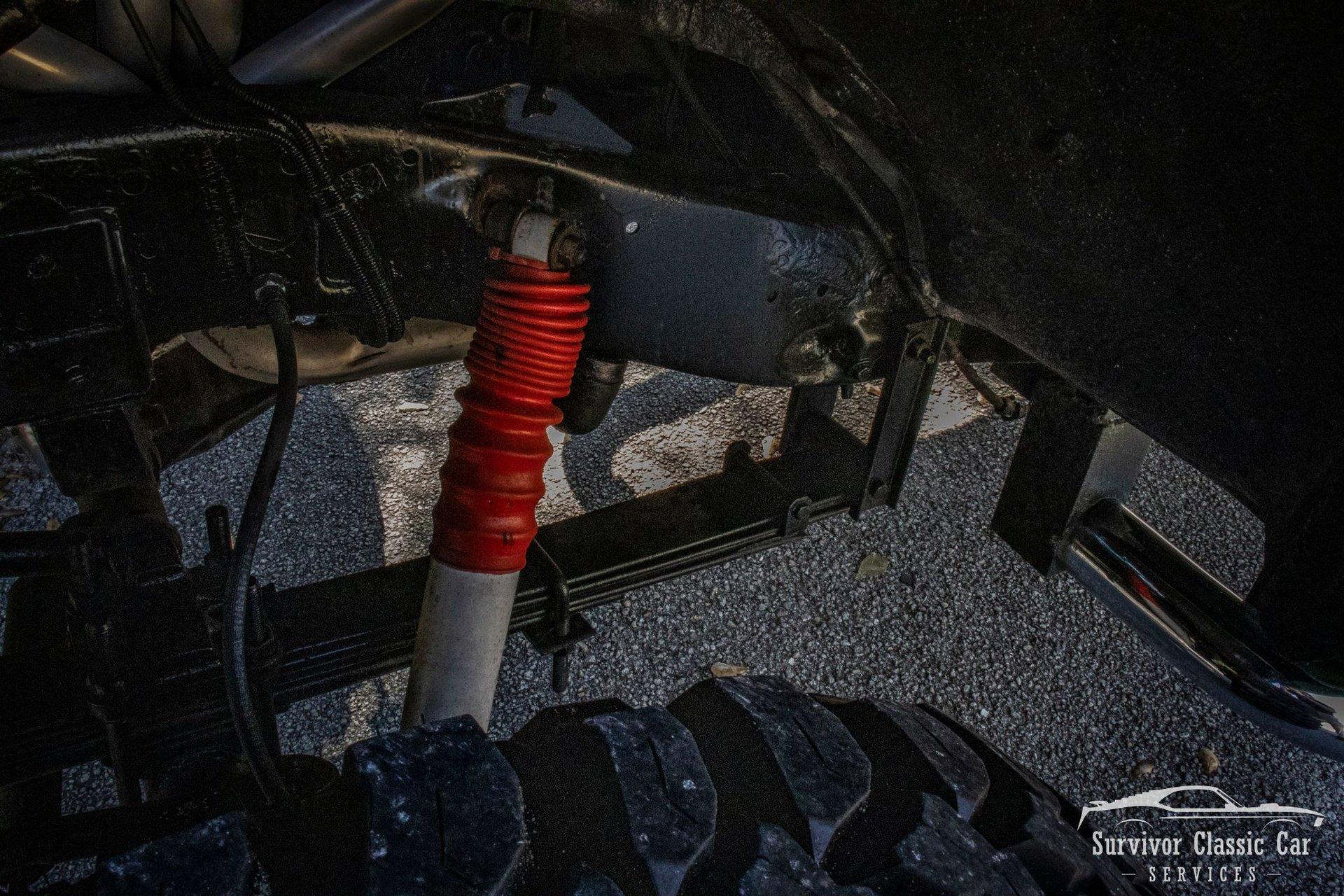 The Chassis is far from original, but still in the Chevrolet Line-Up. This Chassis is Chevrolet K10 (Believed to be from the same timeline 1971-1979 based off the C-99404 Transfer Case). Featuring Lifted Shock absorbers front & rear with leaf springs for a comfortable ride. Driving down the road, she's tracks straight and isn't to difficult to get up inside.