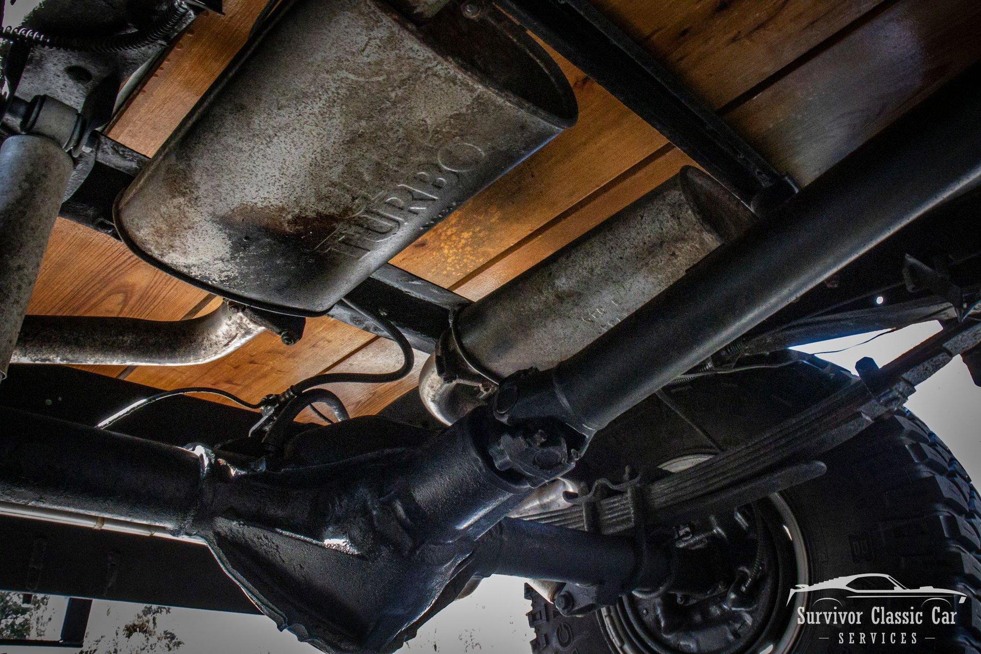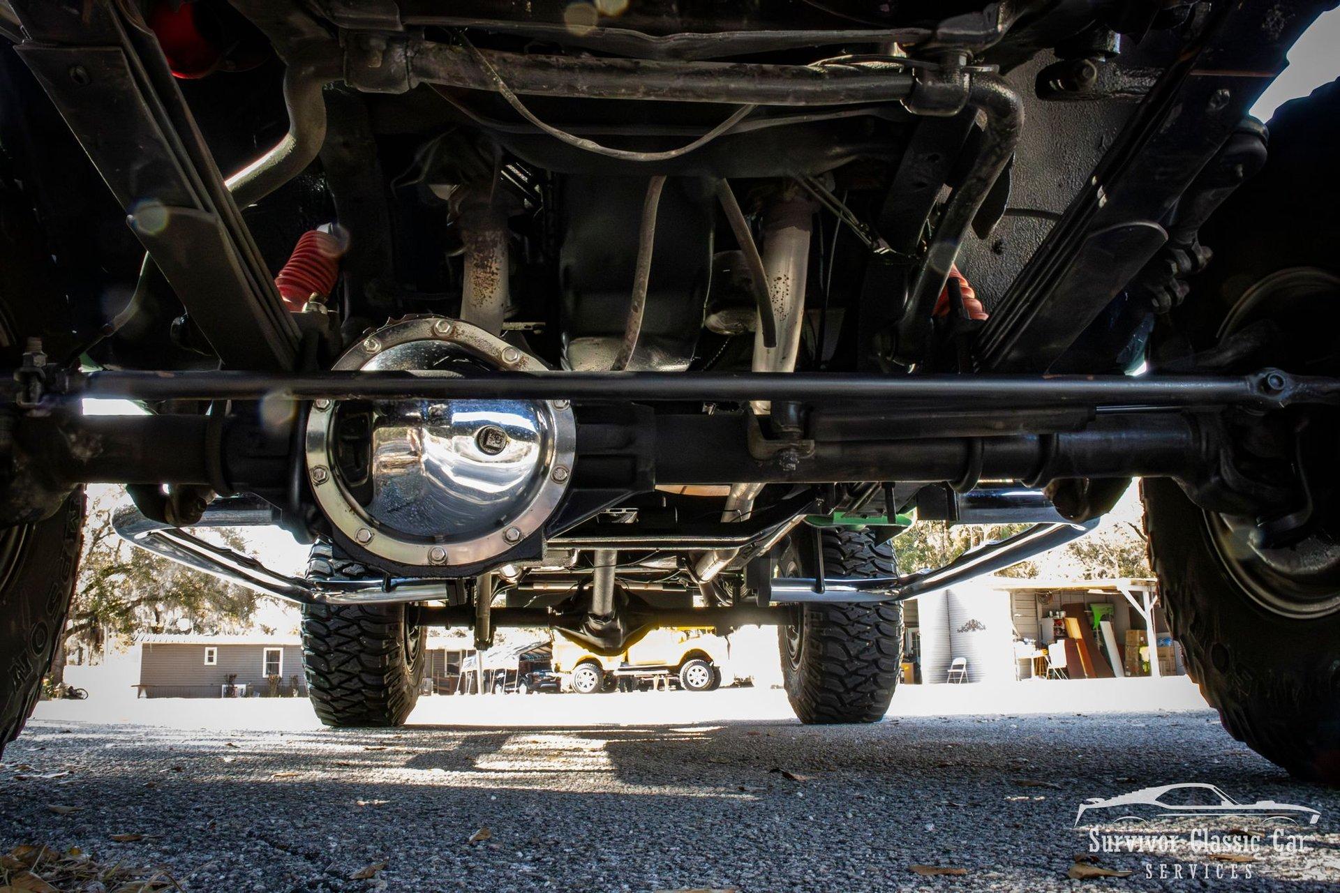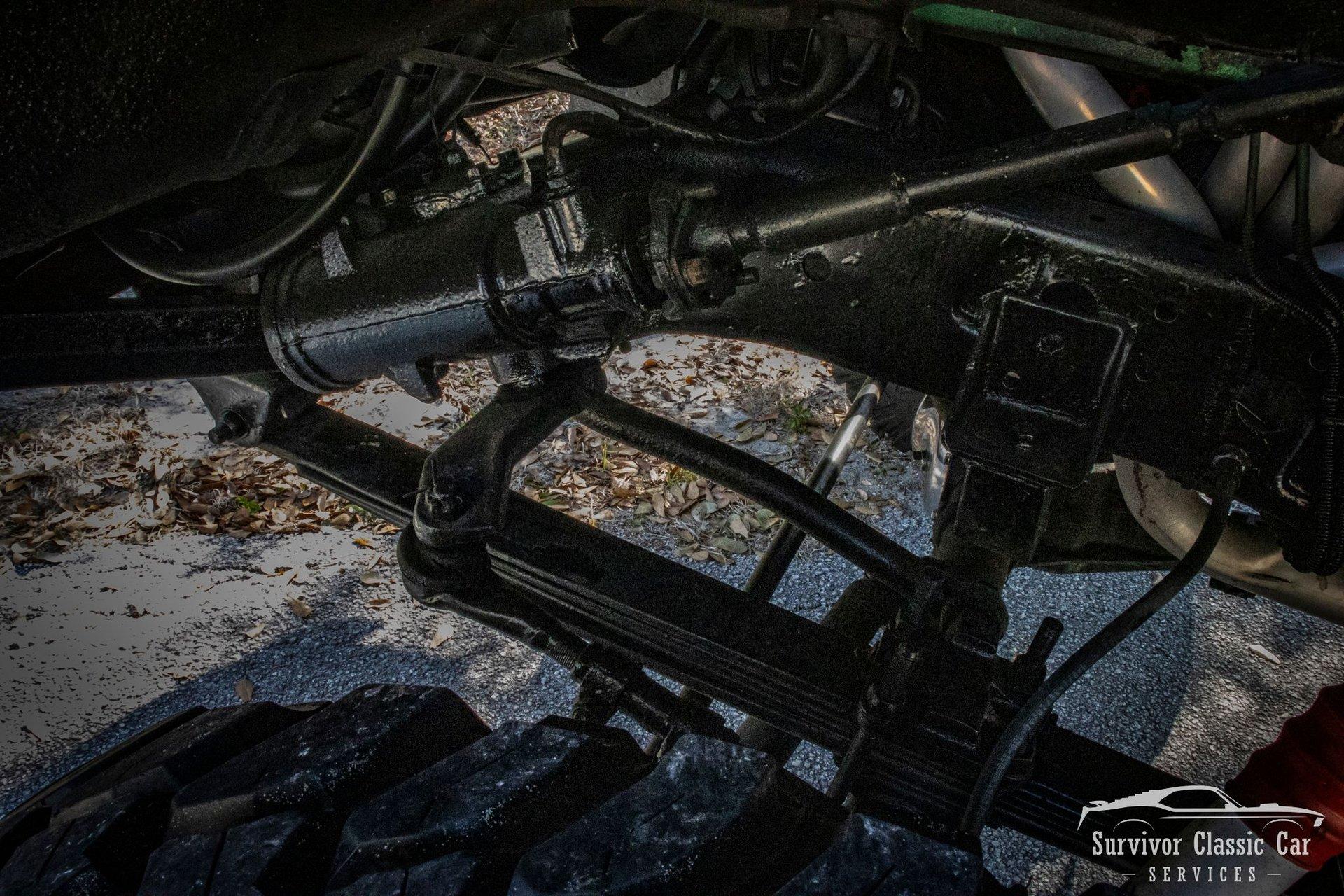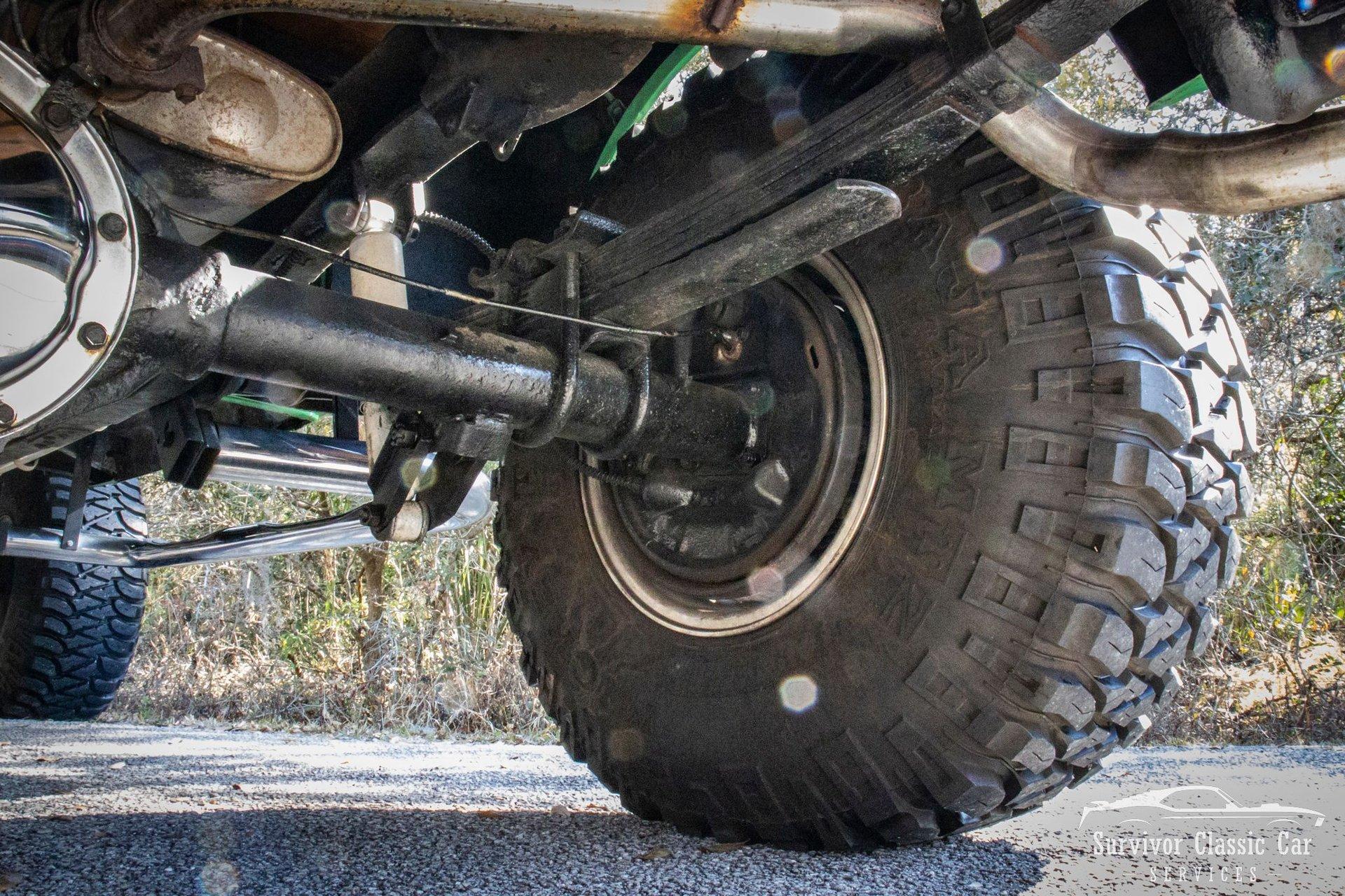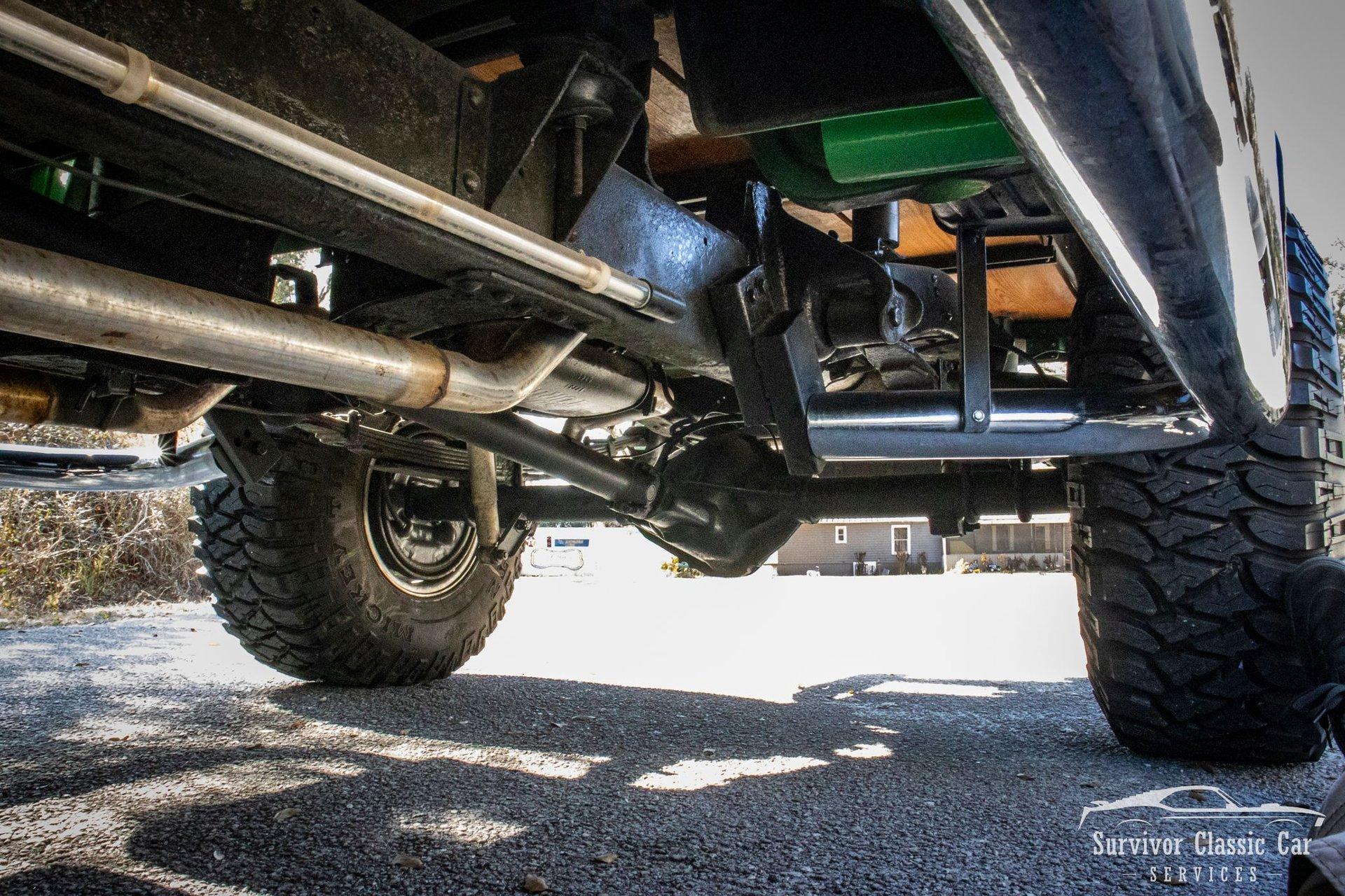 The Chassis is far from original, but still in the Chevrolet Line-Up. This Chassis is Chevrolet K10 (Believed to be from the same timeline 1971-1979 based off the C-99404 Transfer Case). Featuring Lifted Shock absorbers front & rear with leaf springs for a comfortable ride. Driving down the road, she's tracks straight and isn't to difficult to get up inside.