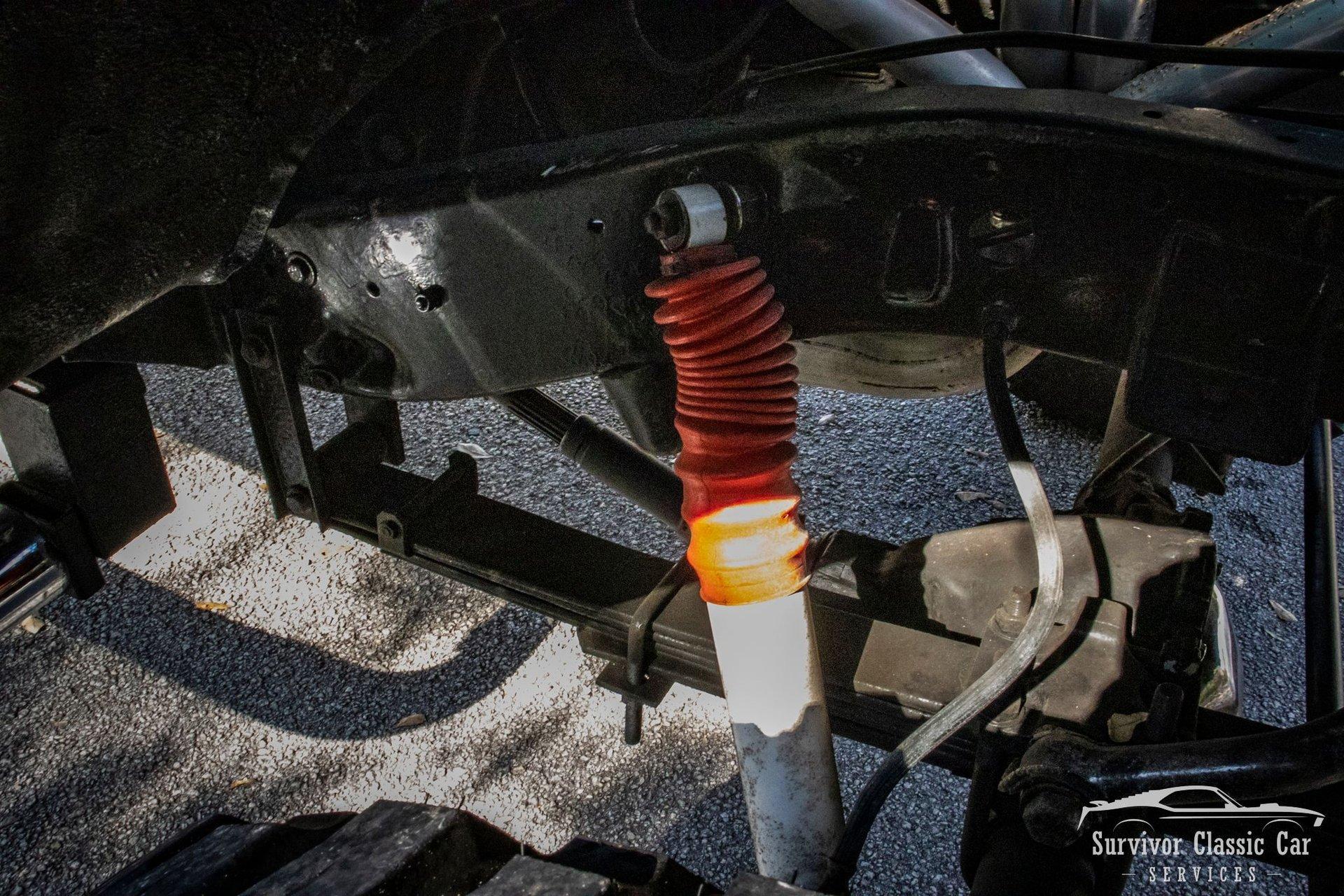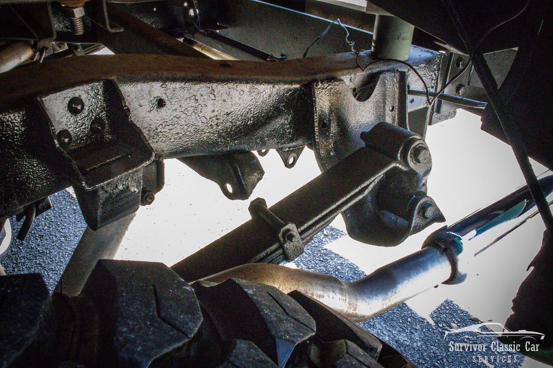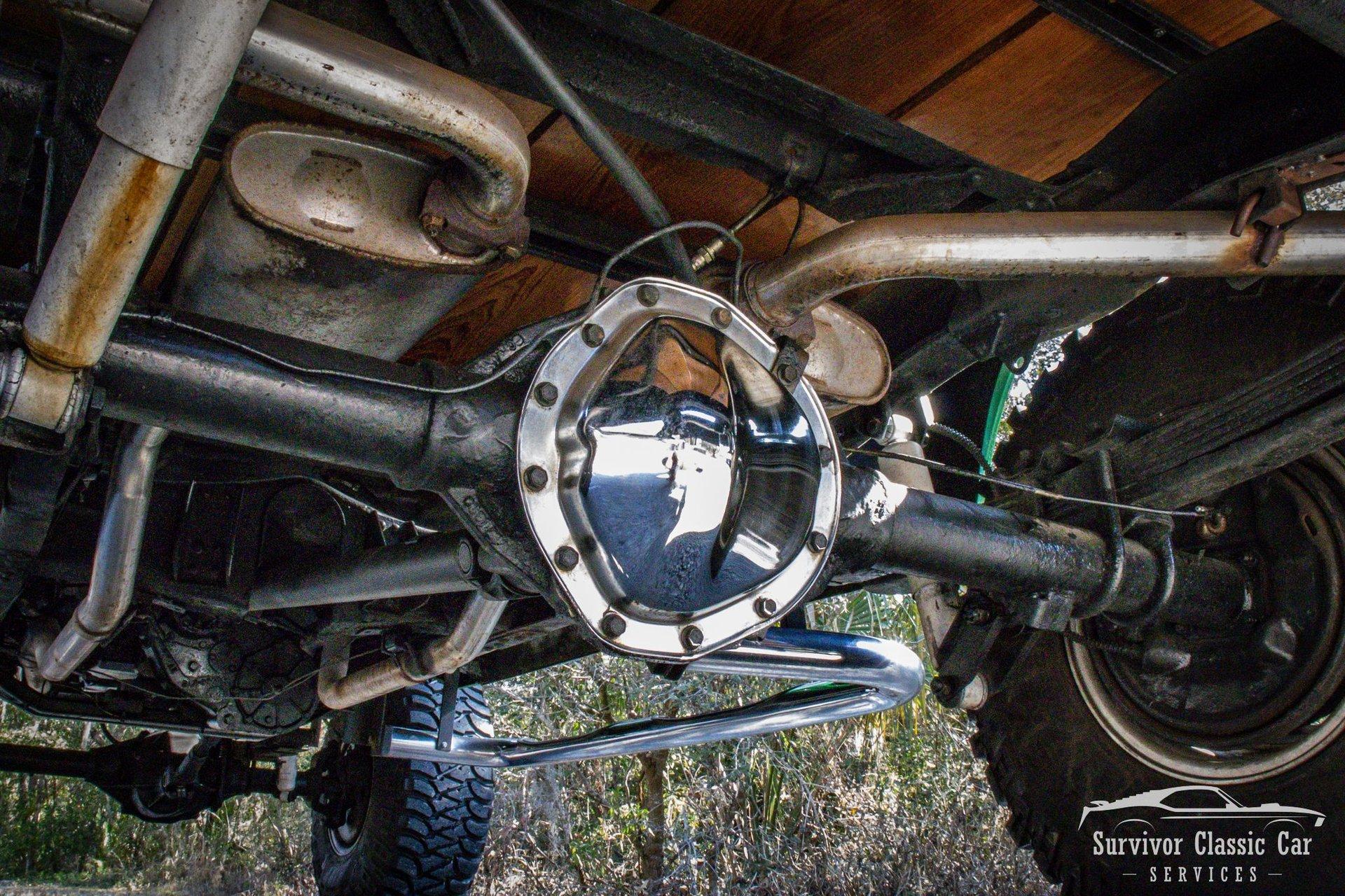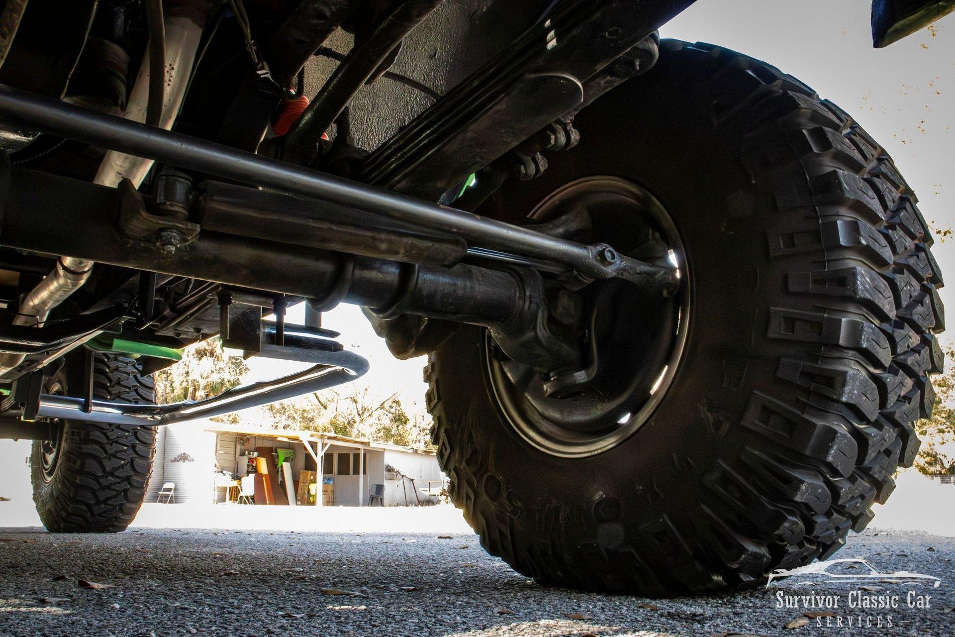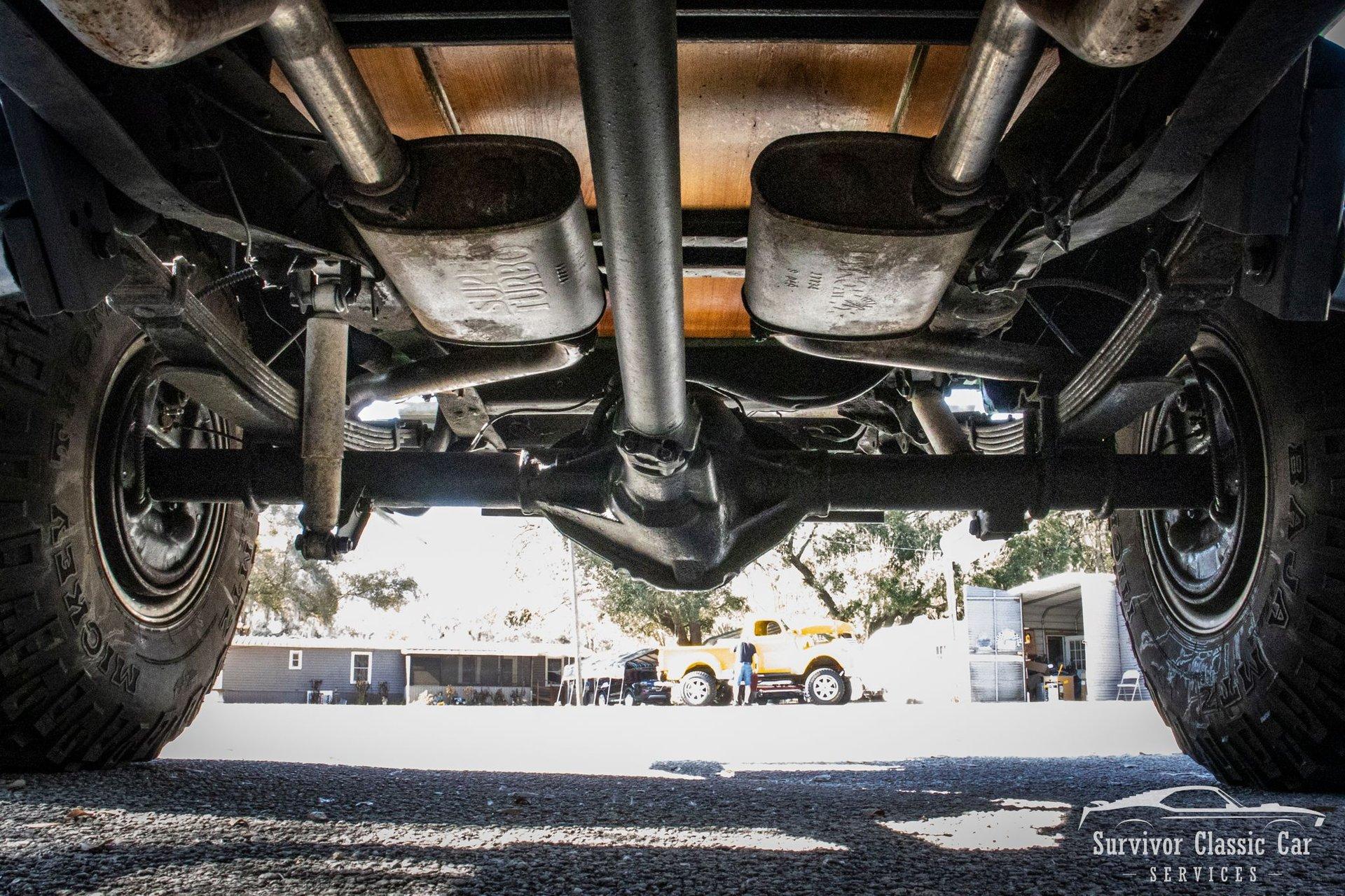 The Chassis is far from original, but still in the Chevrolet Line-Up. This Chassis is Chevrolet K10 (Believed to be from the same timeline 1971-1979 based off the C-99404 Transfer Case). Featuring Lifted Shock absorbers front & rear with leaf springs for a comfortable ride. Driving down the road, she's tracks straight and isn't to difficult to get up inside.