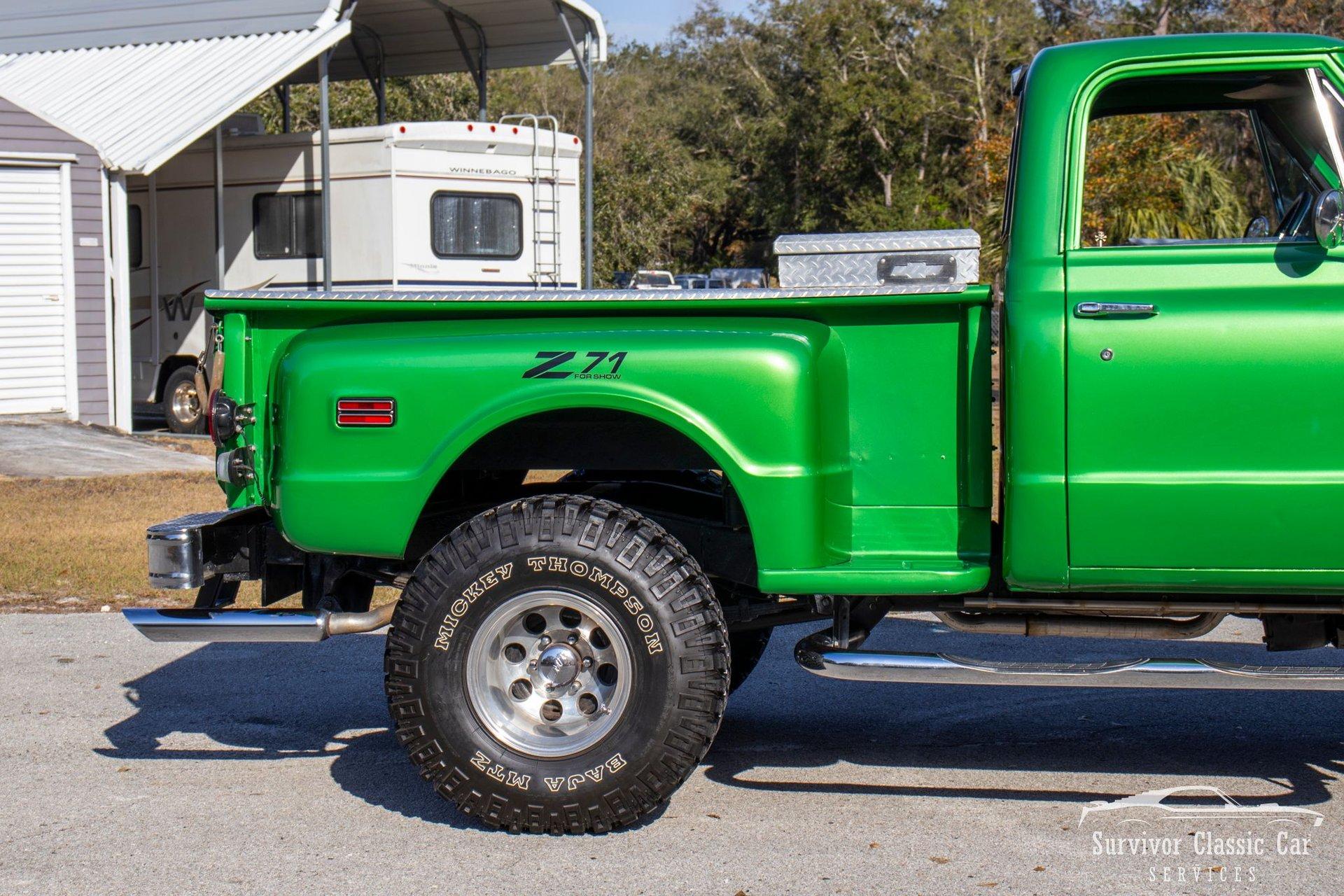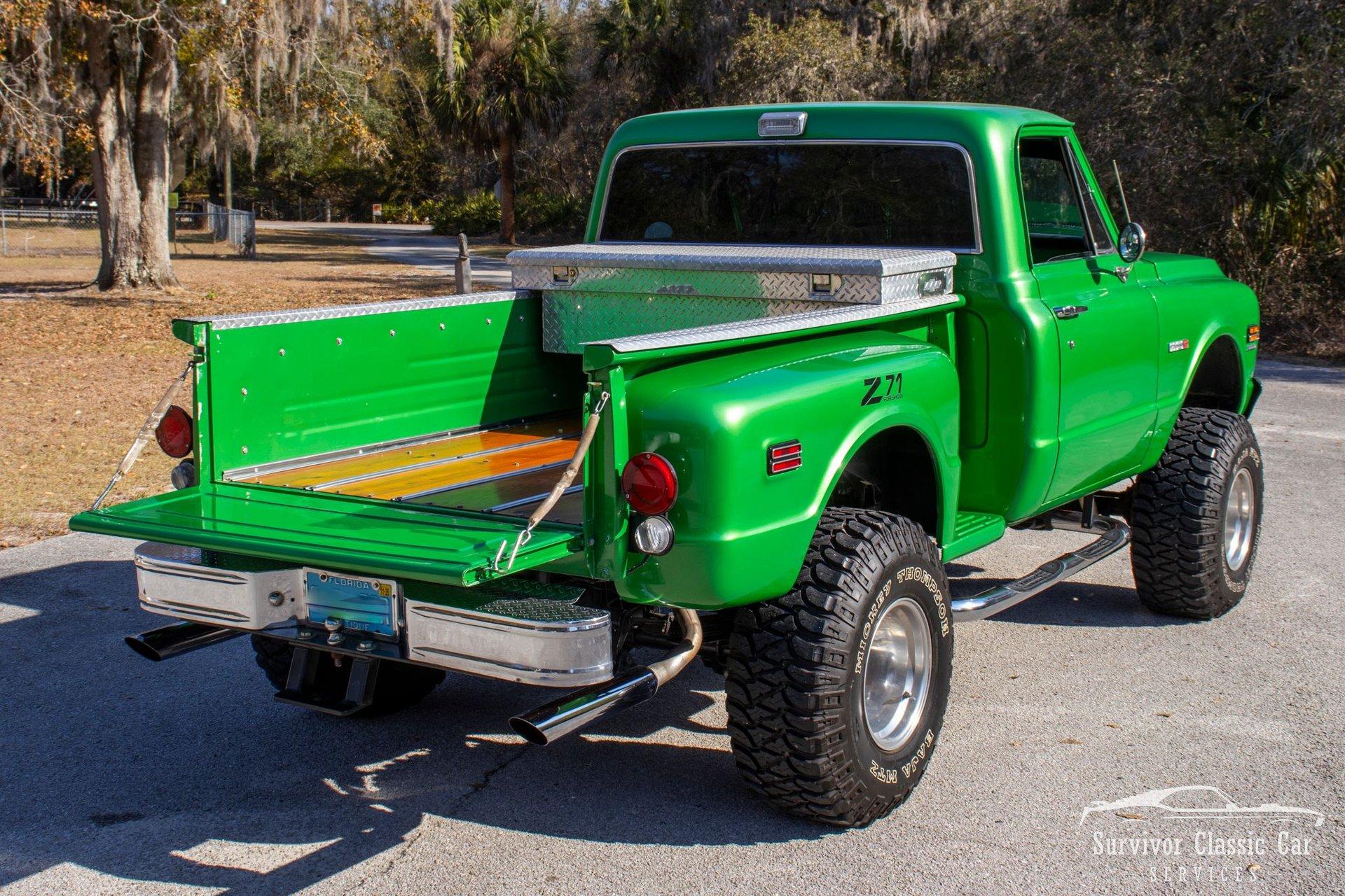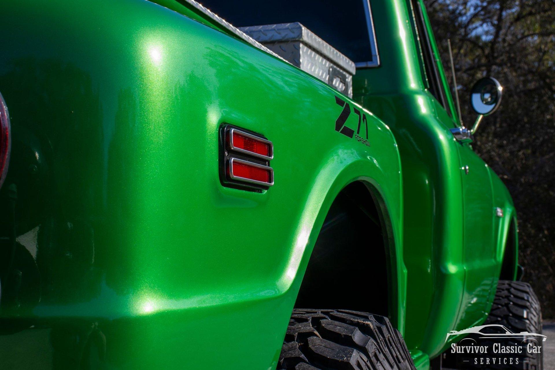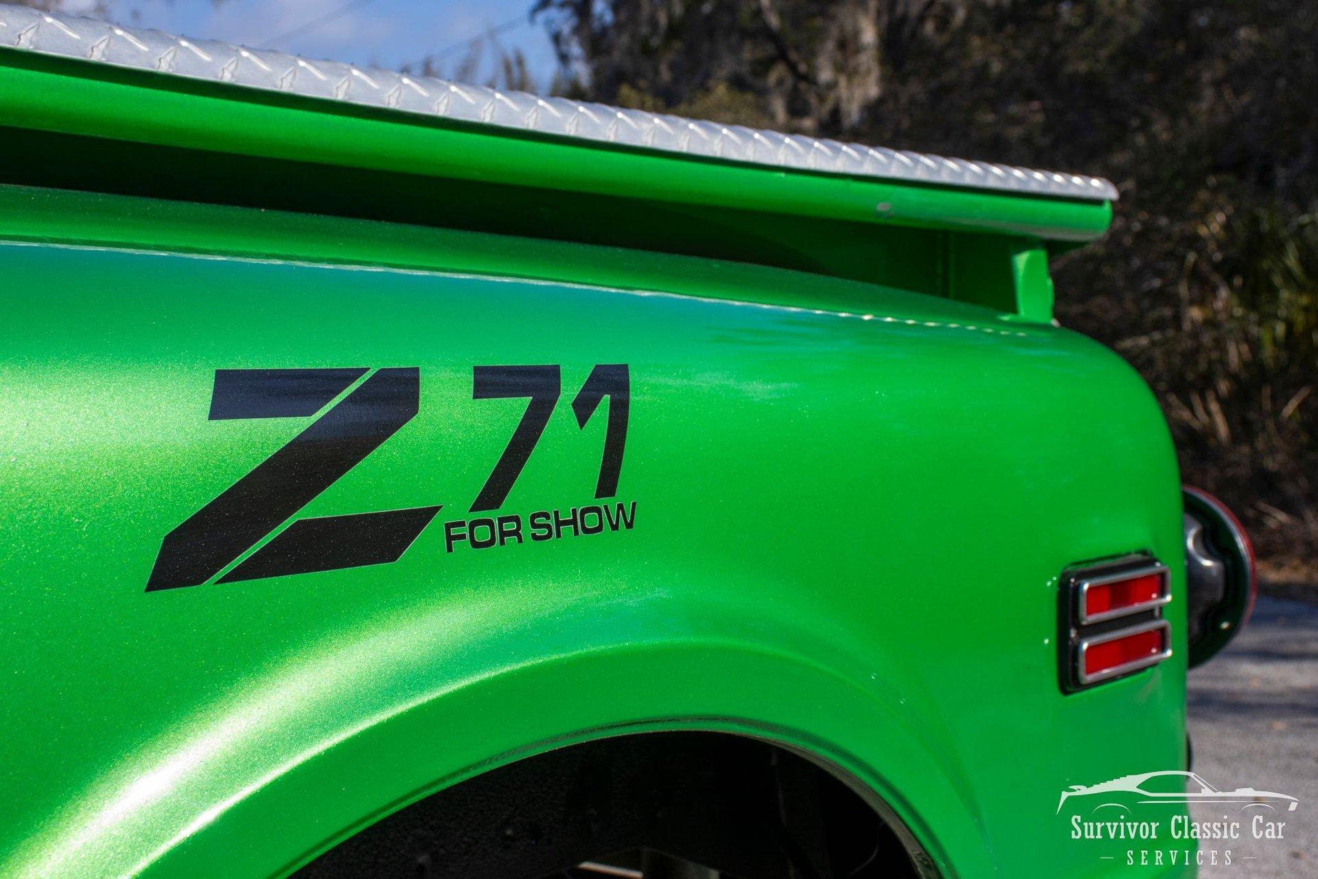 The 1971 Chevrolet C10 is a highly desirable ''Action Line'' (1967–1972) pickup, often noted for blending rugged capability with improved comfort & style. This Green is not a factory color, but one that is a beautiful color that attracts the wye. The metallic pearls float to the top of the paint and have a smooth shimmer in the sun. The Chrome Bumpers & Trim are polished to a show finish and a stunning real wood bed that ties everything together.