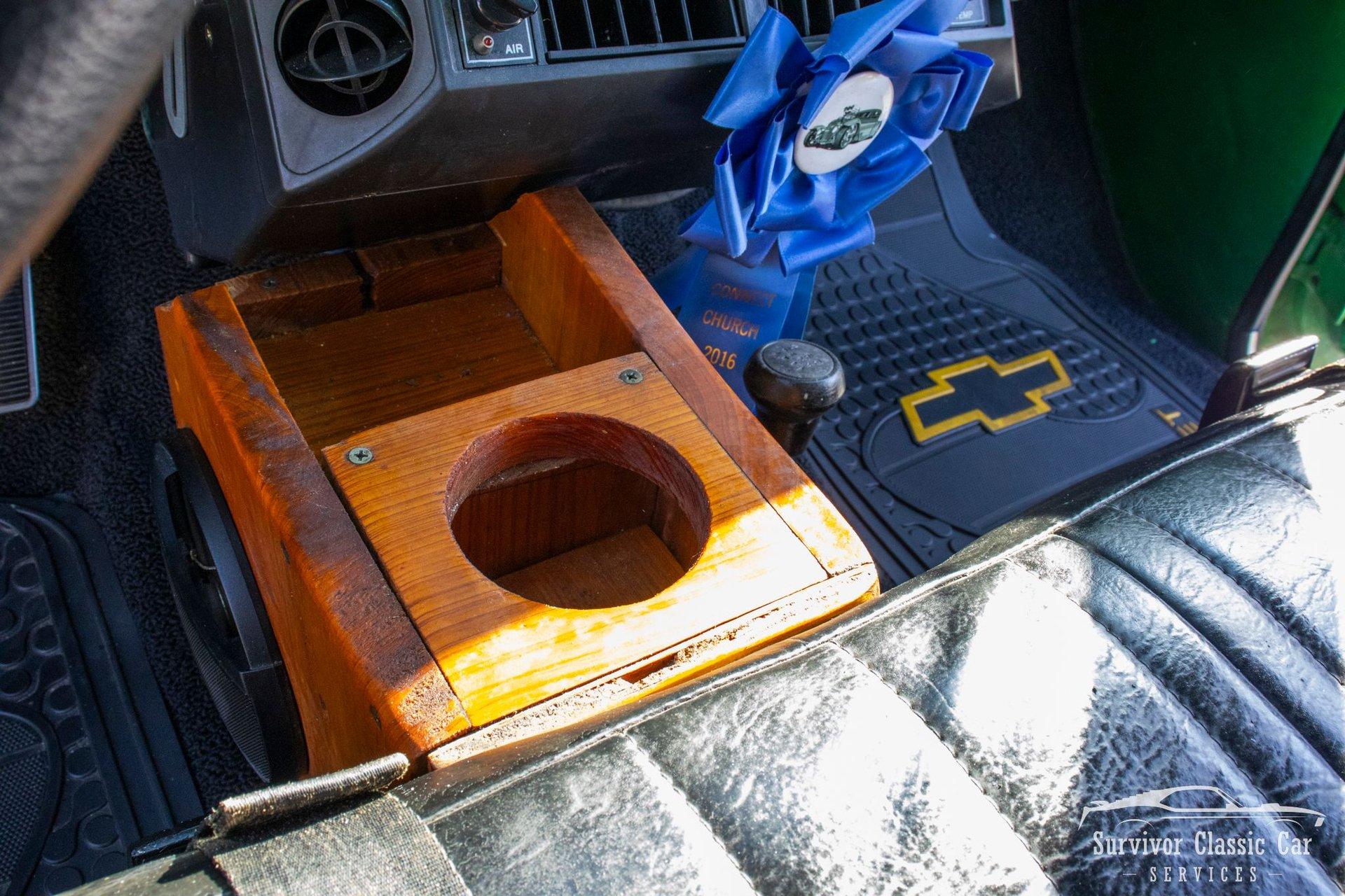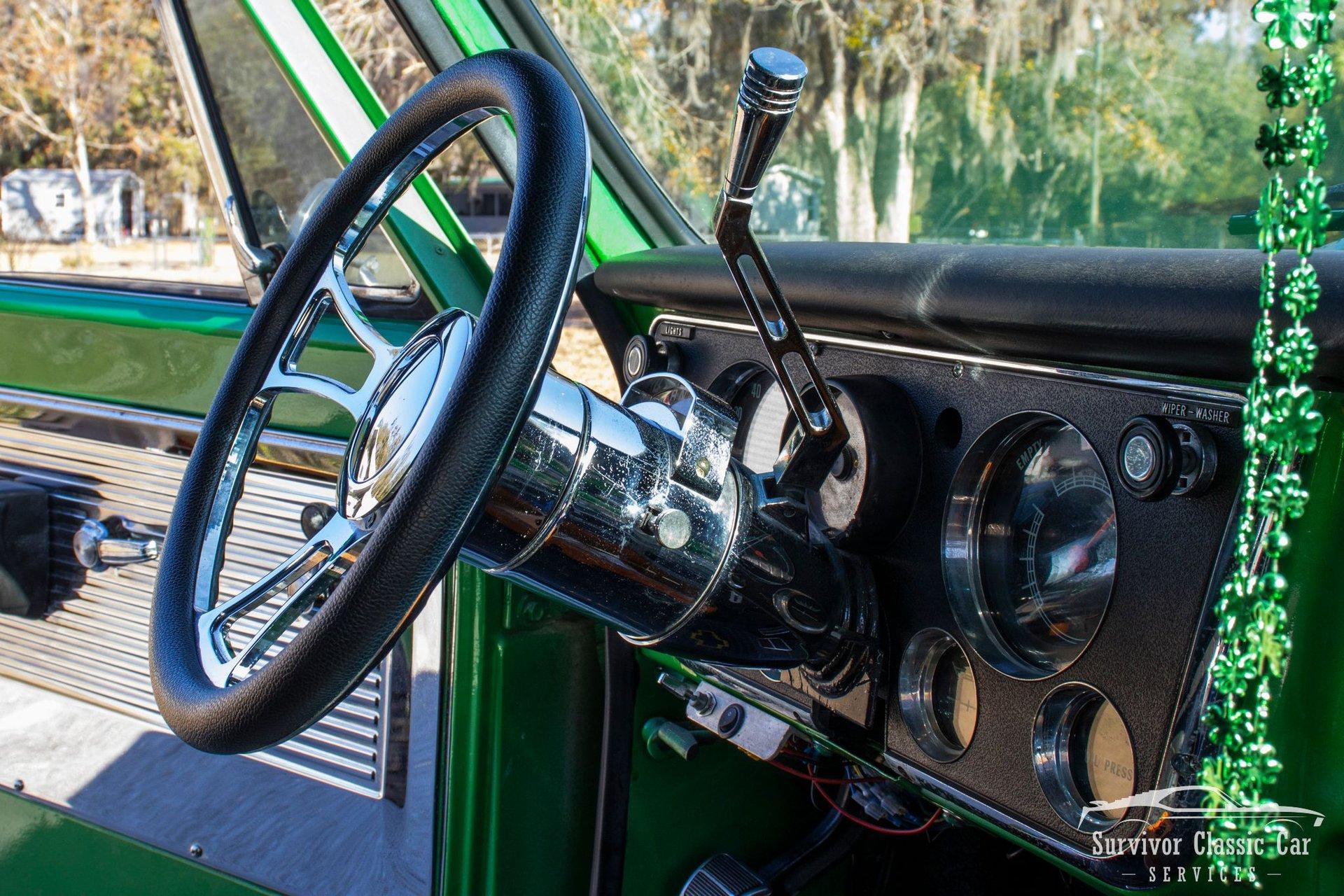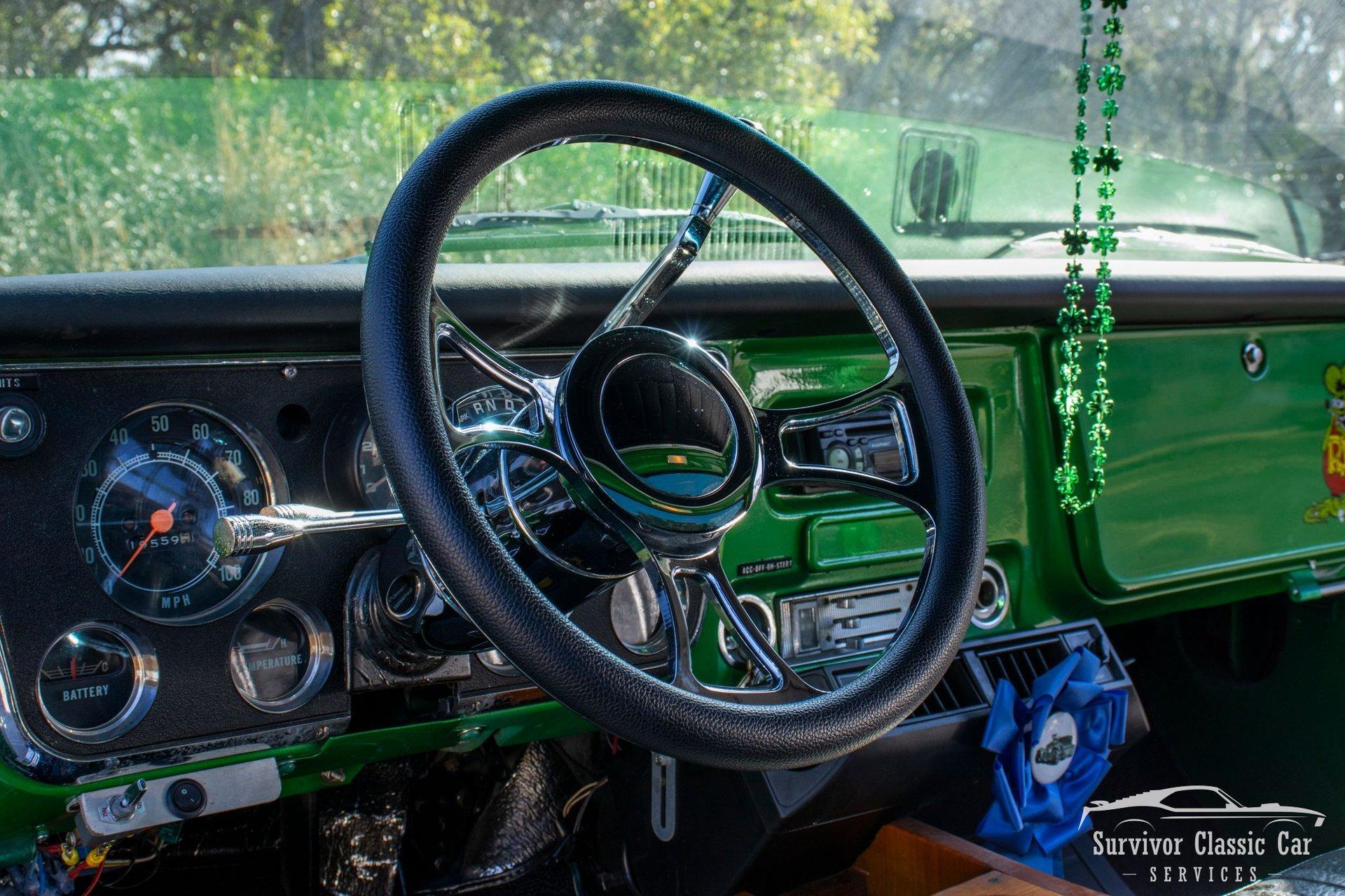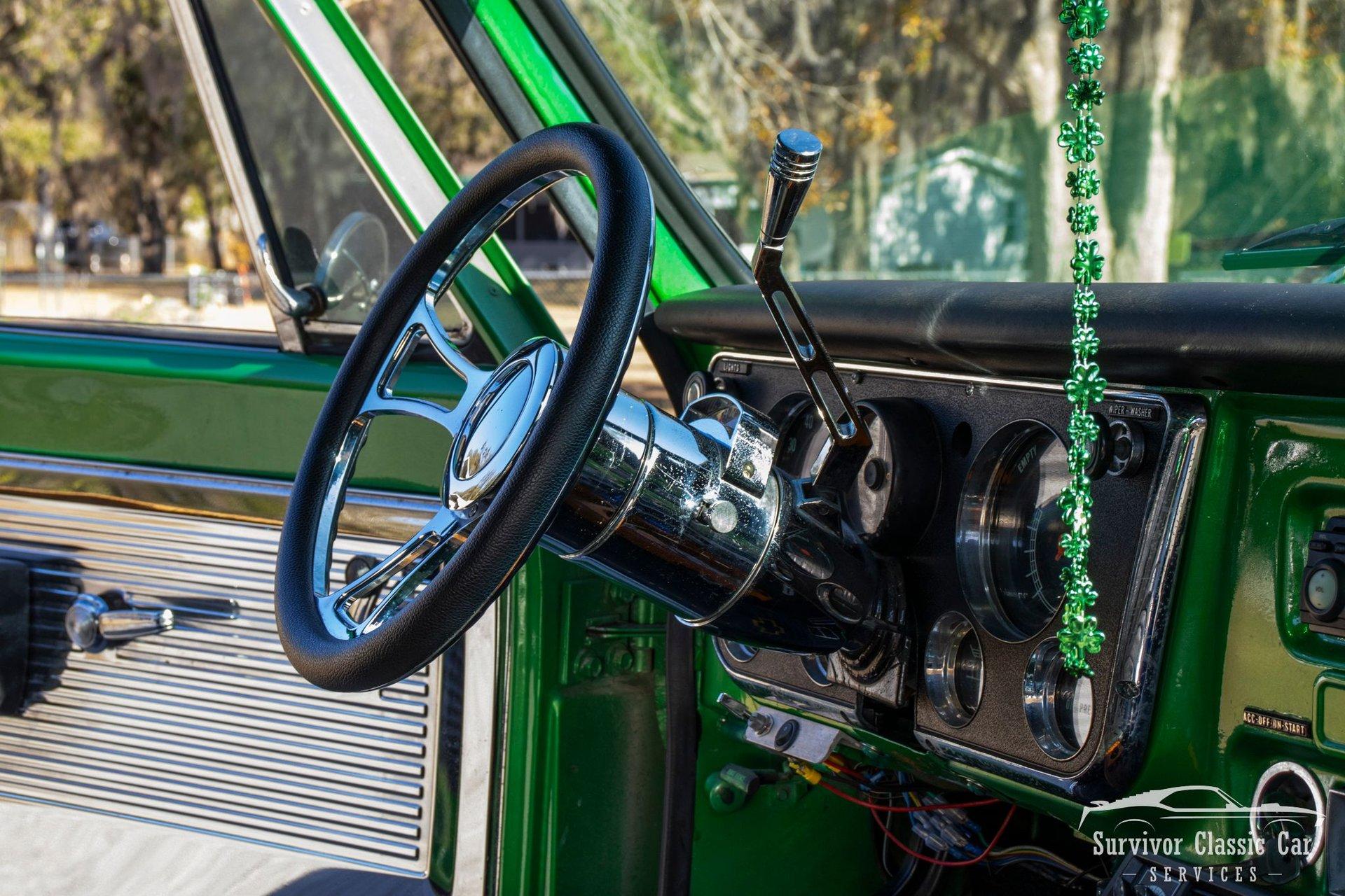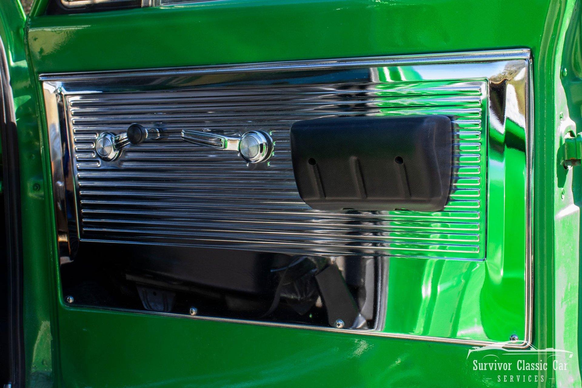 The Cabin matches the same styling as the exterior. From the Green Metallic painted dash to the Chrome Door Panels! The Steering wheel as been swapped over to a Forever Sharp Chrome 1/2-Wrapped with a Chrome Tilt Steering Column. Original Gauges for the Dash, but features a digital radio, an A/C Control Unit and a Custom handmade Wood Center Console.