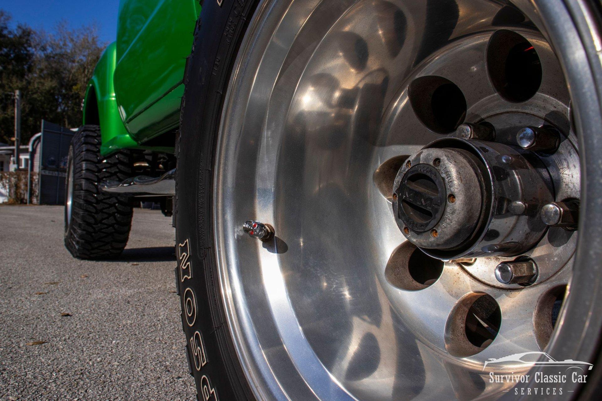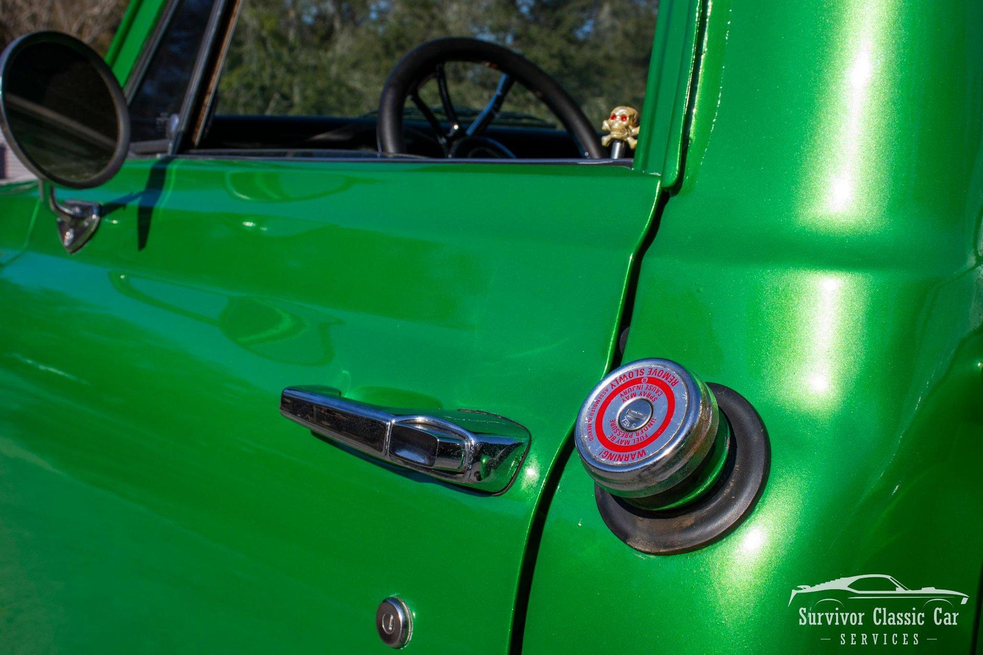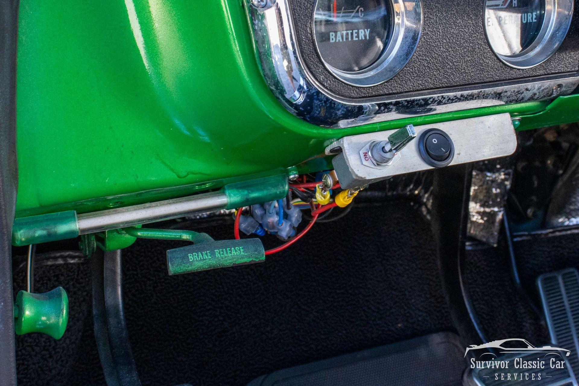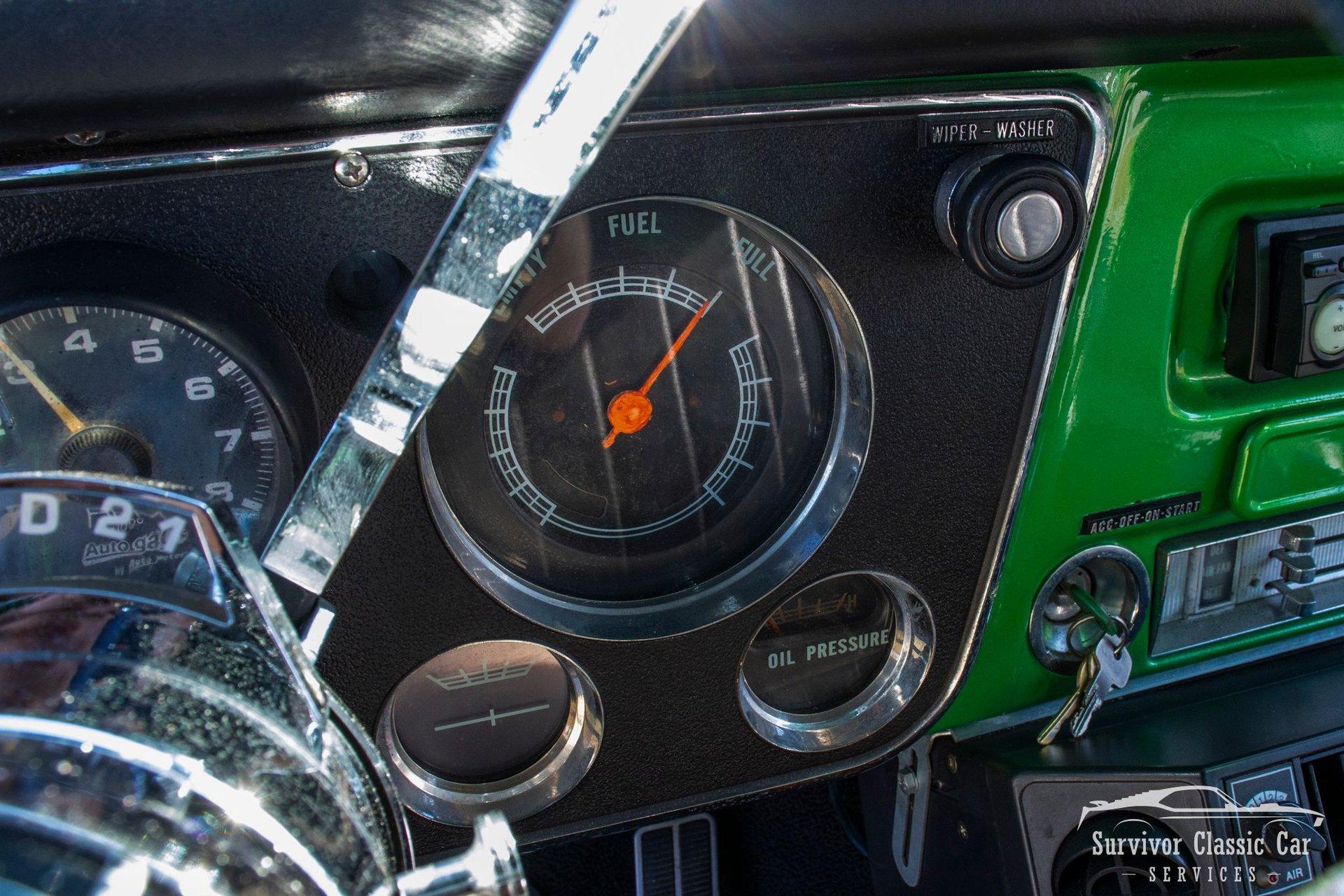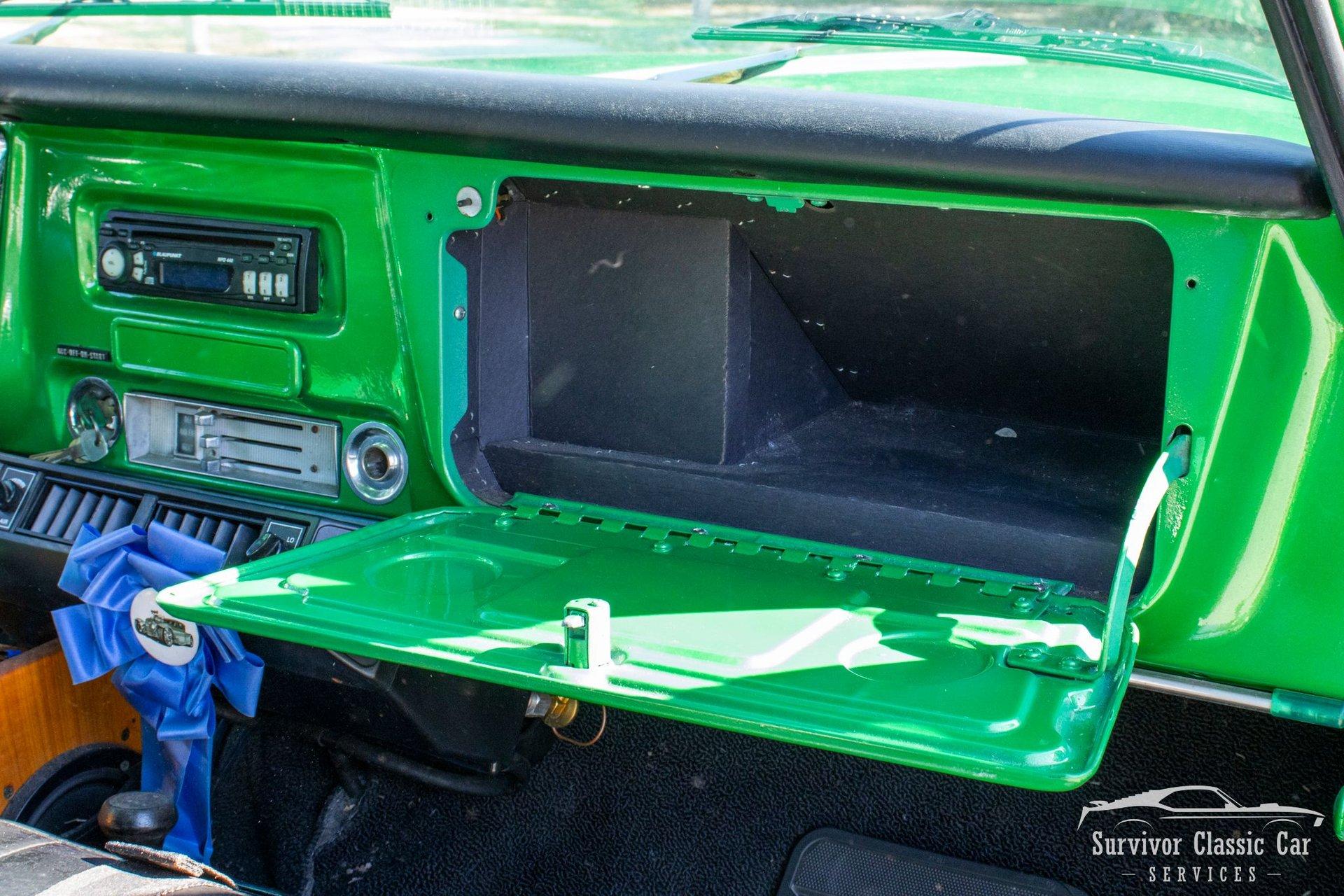 The Cabin matches the same styling as the exterior. From the Green Metallic painted dash to the Chrome Door Panels! The Steering wheel as been swapped over to a Forever Sharp Chrome 1/2-Wrapped with a Chrome Tilt Steering Column. Original Gauges for the Dash, but features a digital radio, an A/C Control Unit and a Custom handmade Wood Center Console.