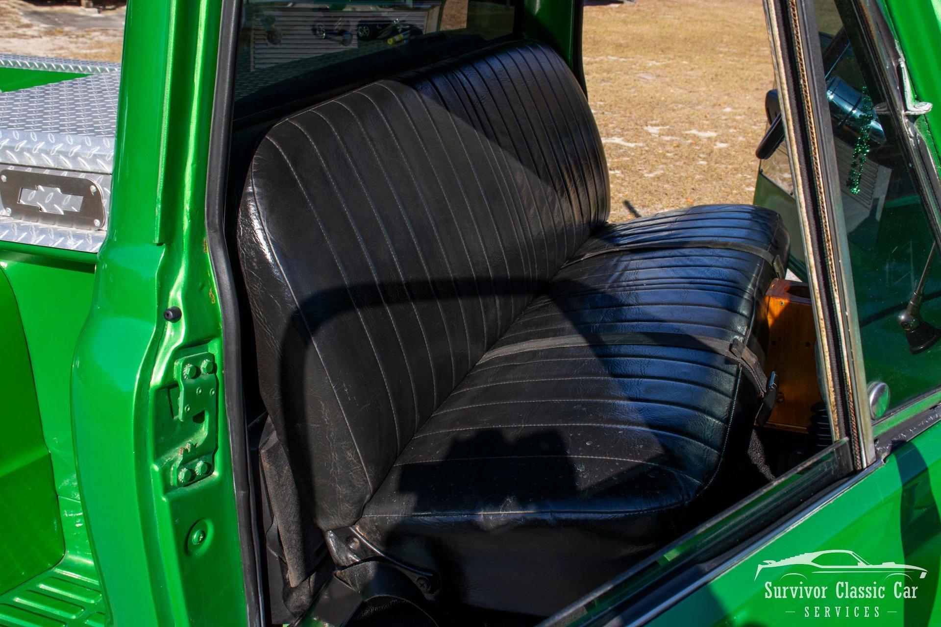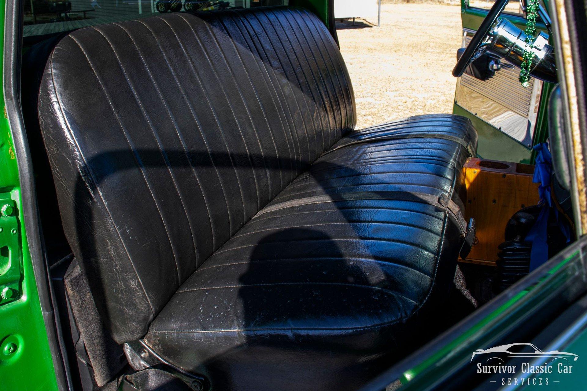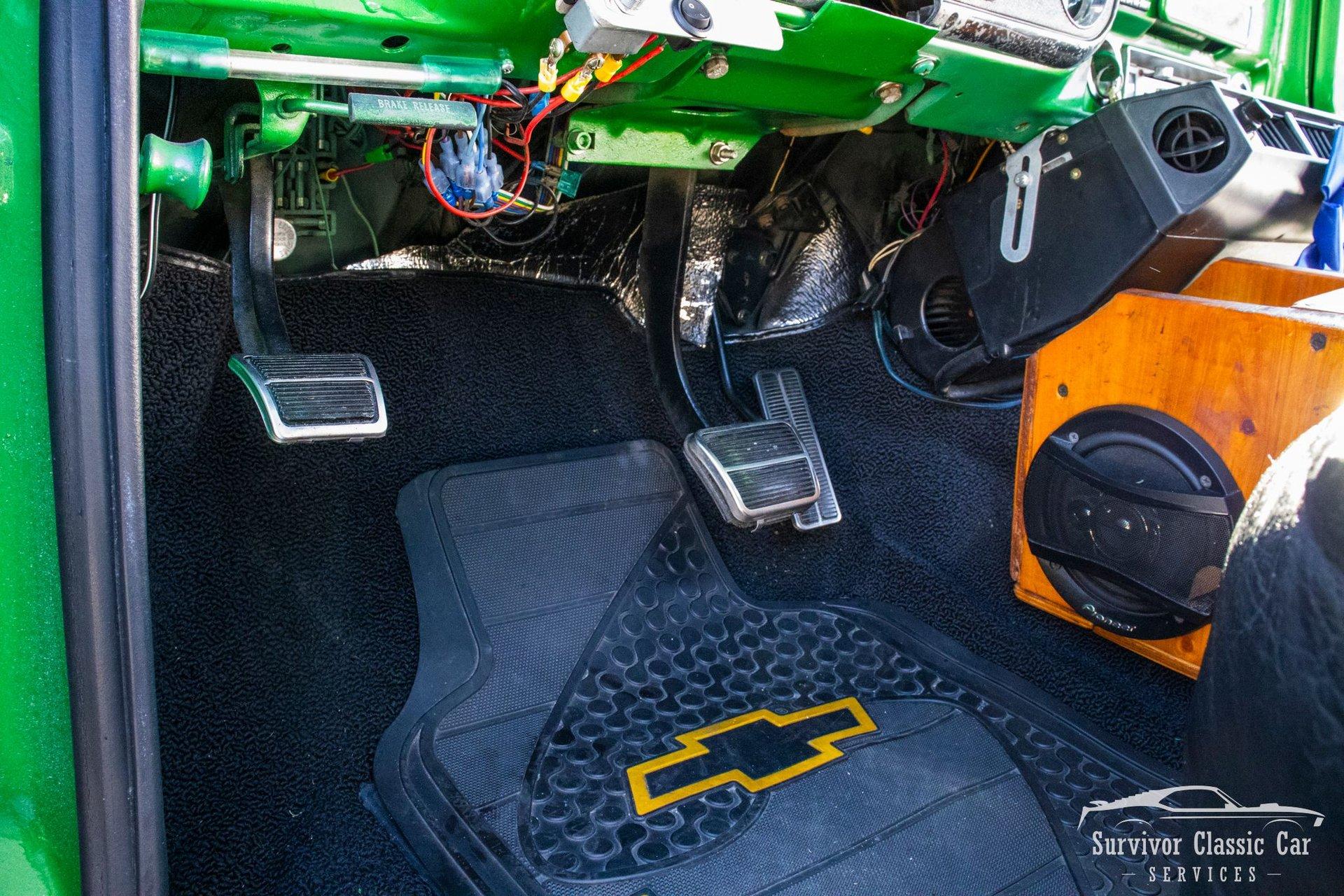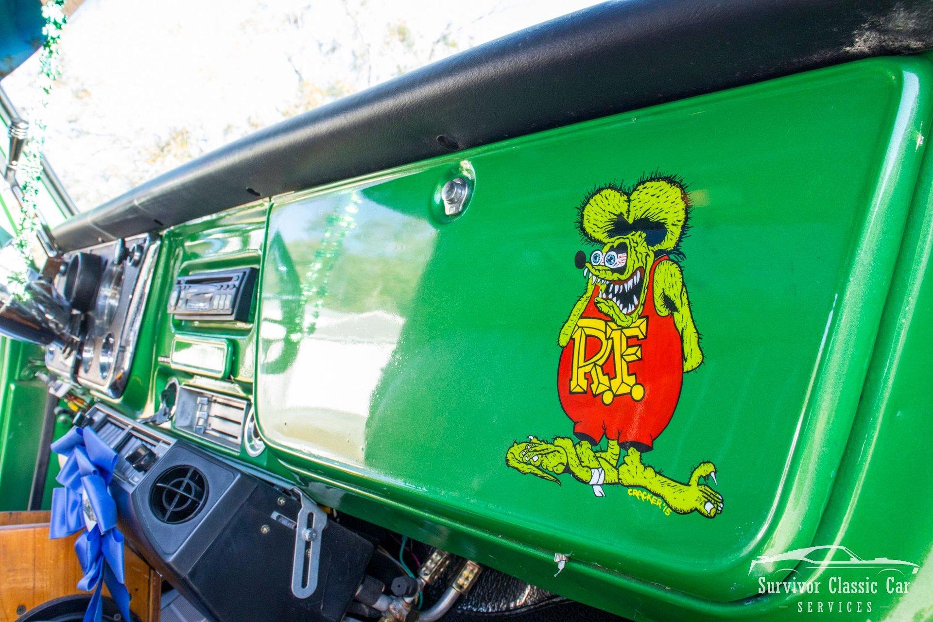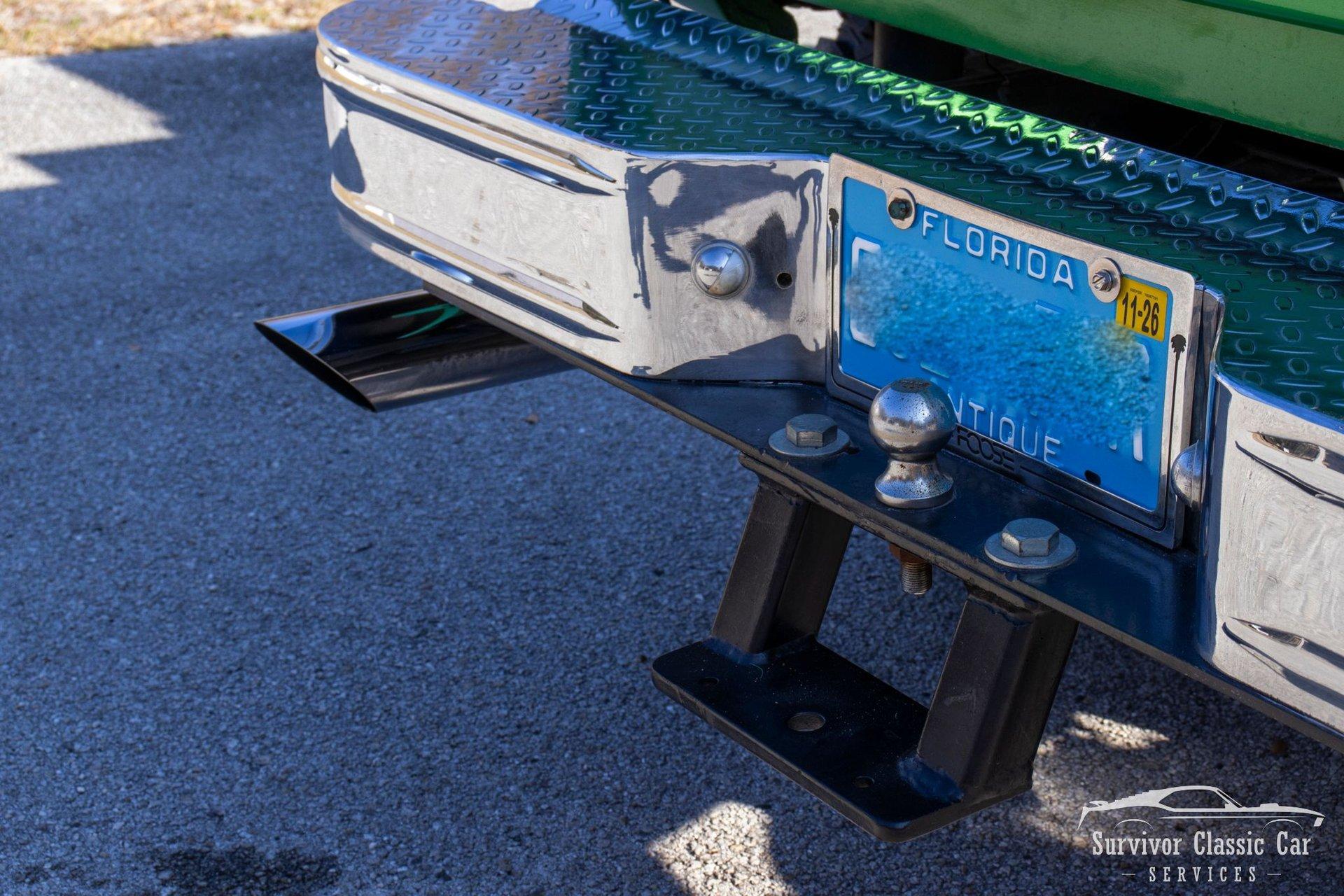 The Cabin matches the same styling as the exterior. From the Green Metallic painted dash to the Chrome Door Panels! The Steering wheel as been swapped over to a Forever Sharp Chrome 1/2-Wrapped with a Chrome Tilt Steering Column. Original Gauges for the Dash, but features a digital radio, an A/C Control Unit and a Custom handmade Wood Center Console.