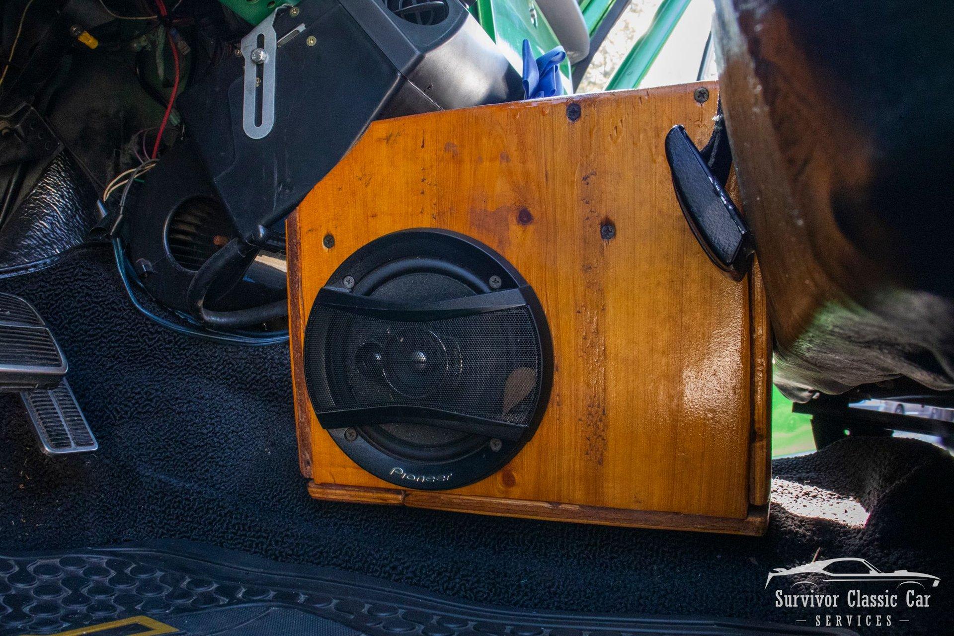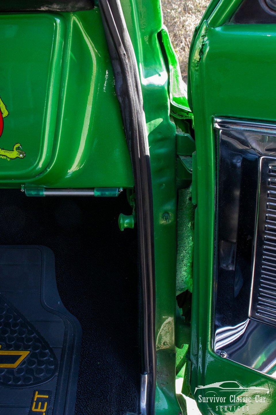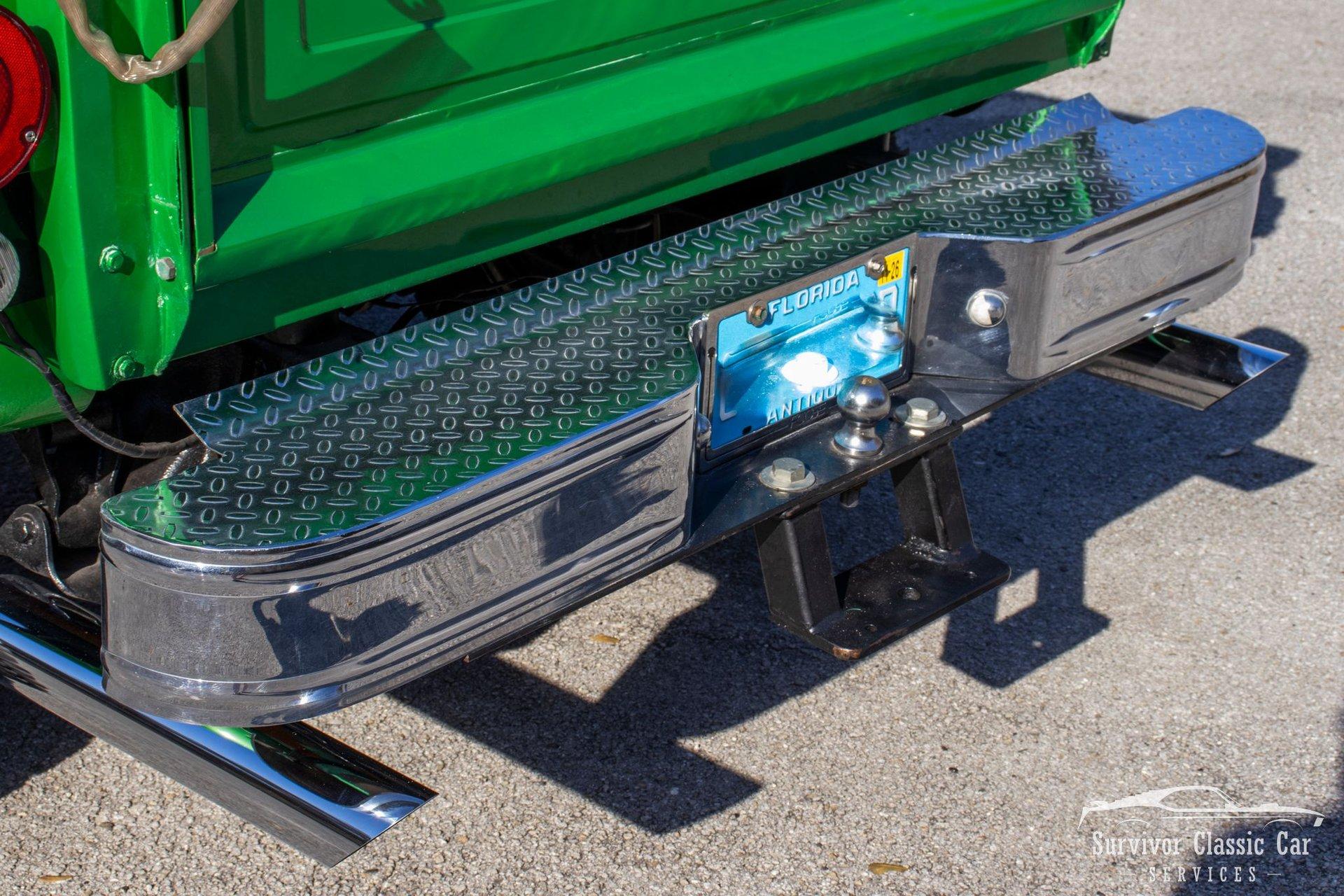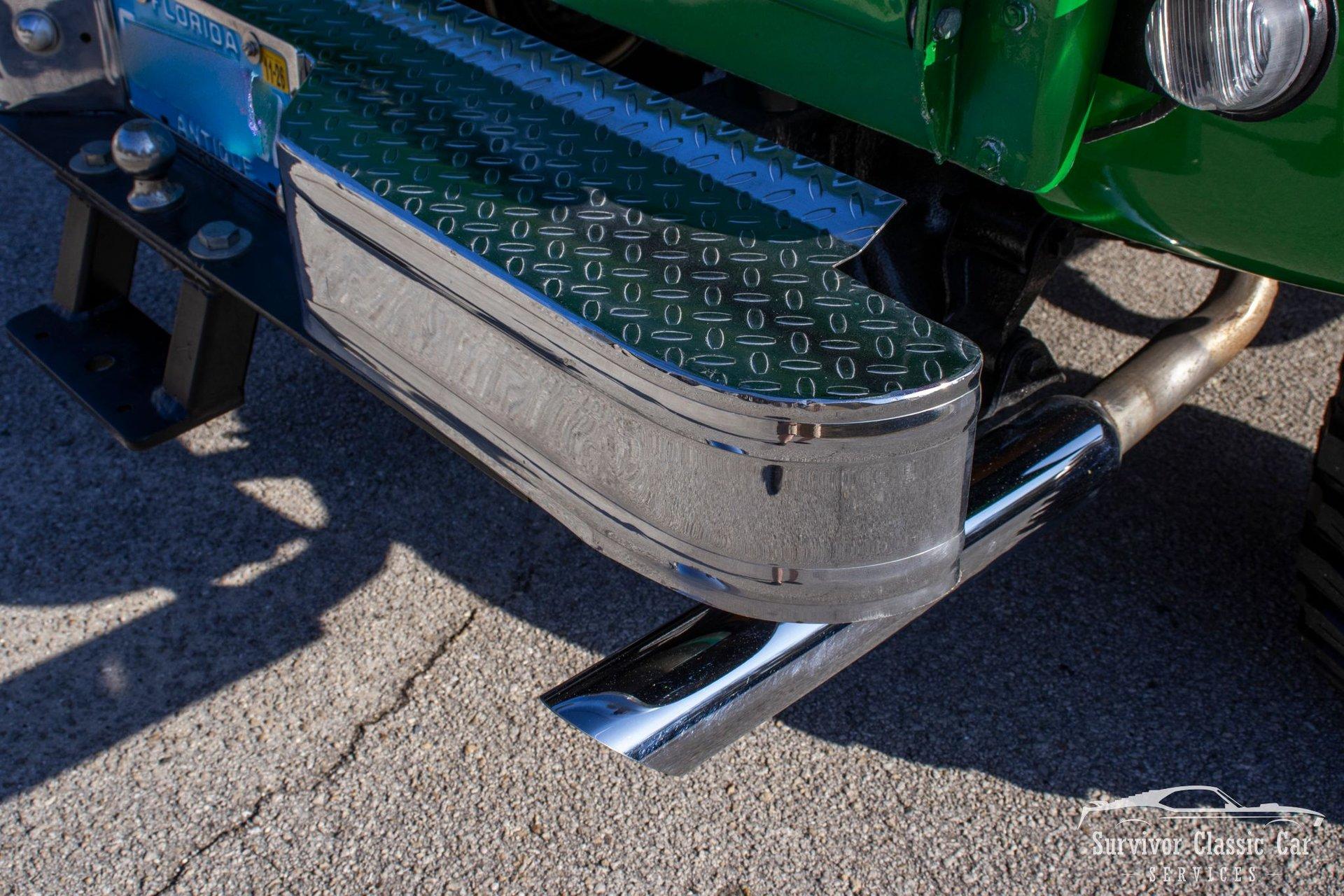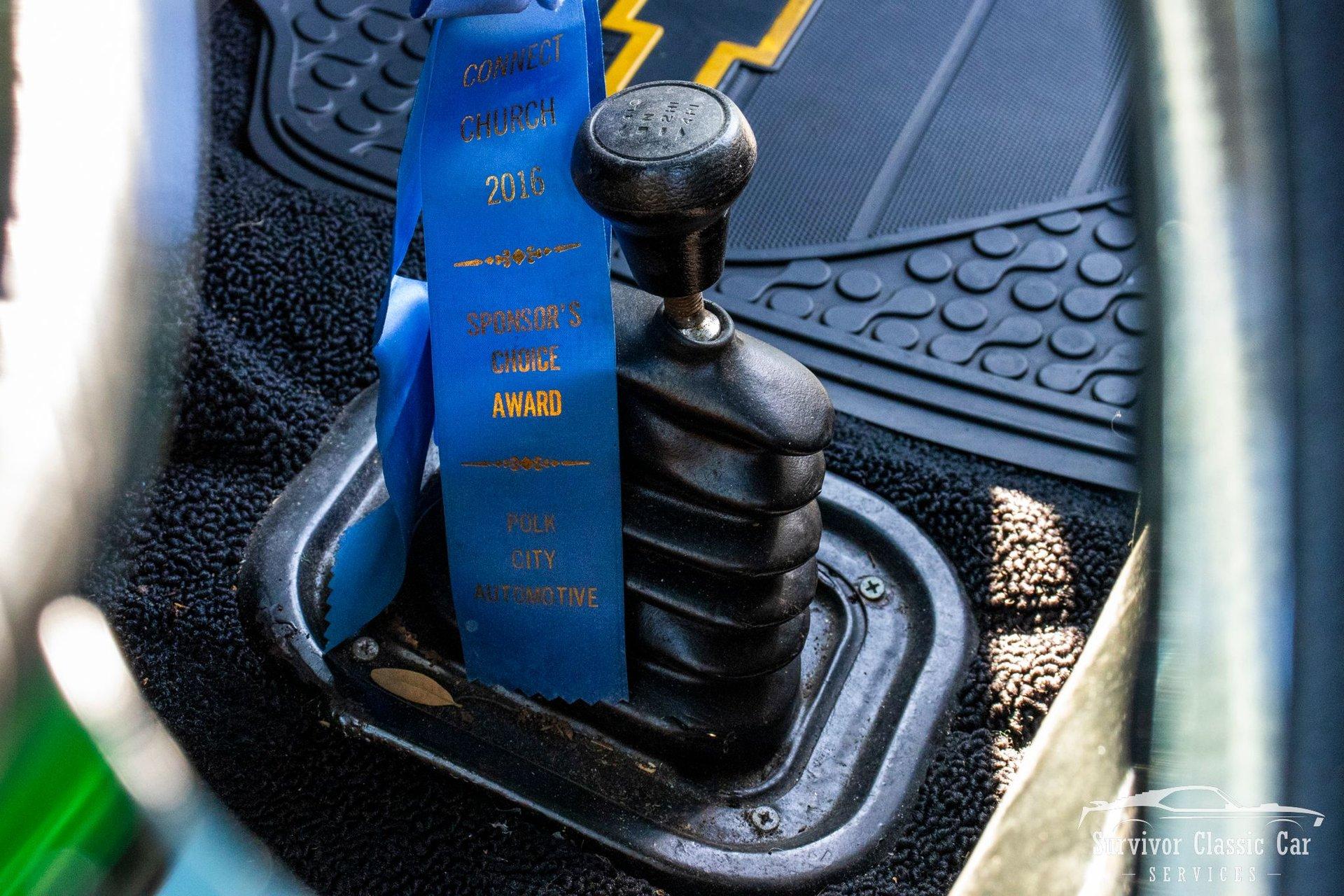 The Cabin matches the same styling as the exterior. From the Green Metallic painted dash to the Chrome Door Panels! The Steering wheel as been swapped over to a Forever Sharp Chrome 1/2-Wrapped with a Chrome Tilt Steering Column. Original Gauges for the Dash, but features a digital radio, an A/C Control Unit and a Custom handmade Wood Center Console.