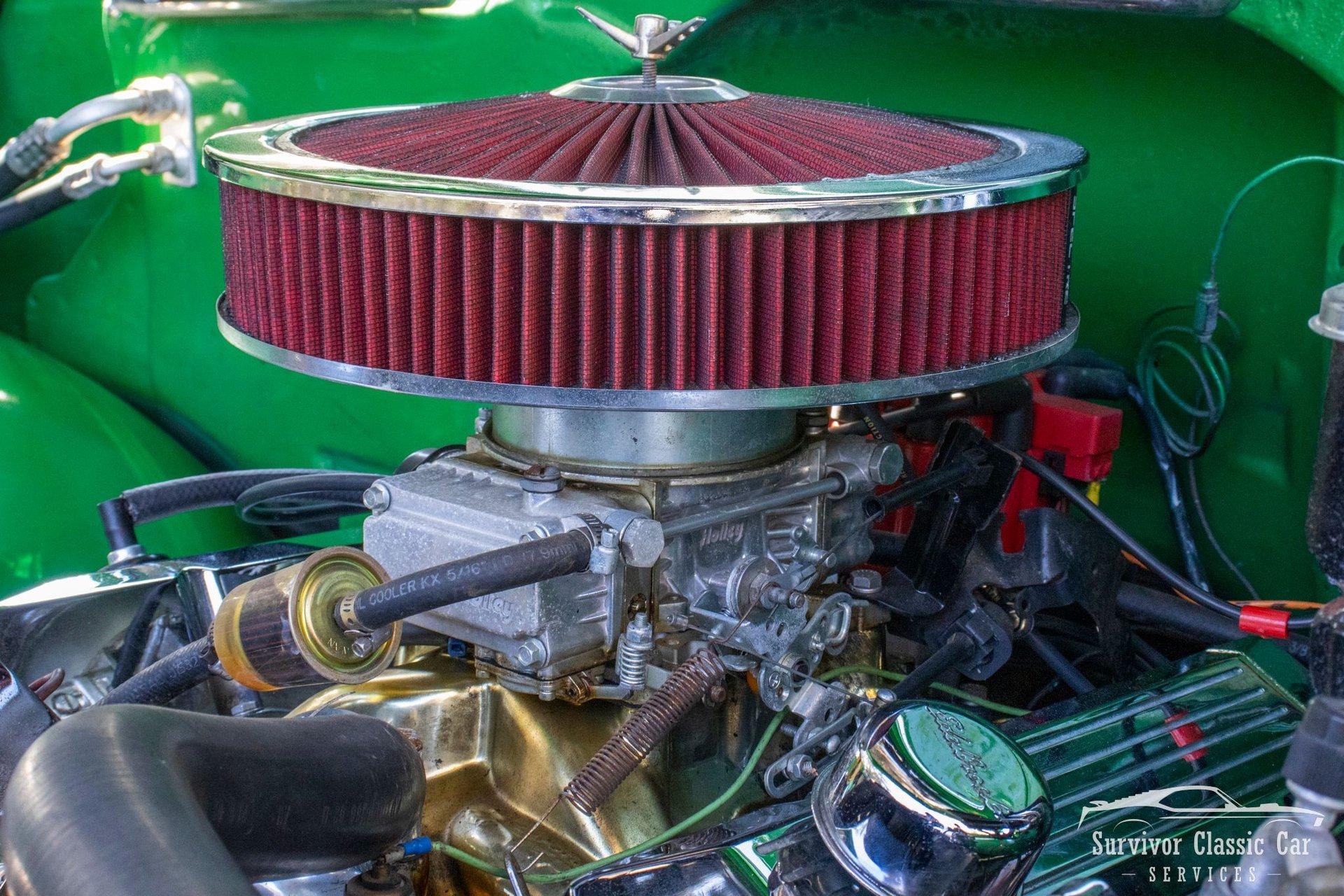 Under the hood is a fully dressed-up Billet & Chrome 5.7L 350 V8. Chrome Hi-Airflow Air Cleaner with a Holley 4BBL Carburetor. The Gold-Chrome: Edelbrock adds a little extra. A few updated features included are Power Steering, Powered Brakes & a larger Aluminum Radiator w/ an electric Fan mount on the front. This Truck will get down road smooth, but was built for show. Which is why the Underside of the hood is mount with a mirror to help show-off that engine!