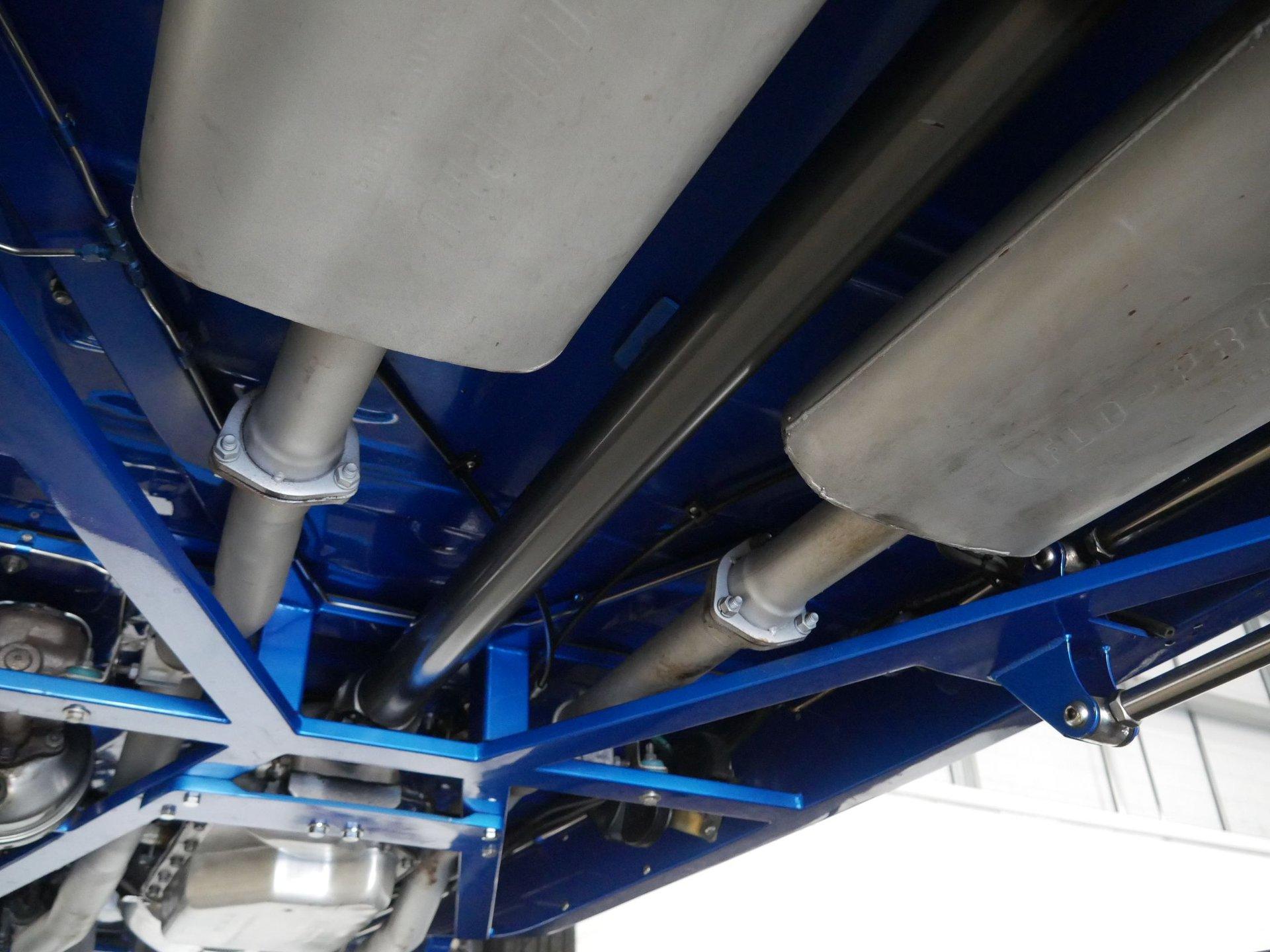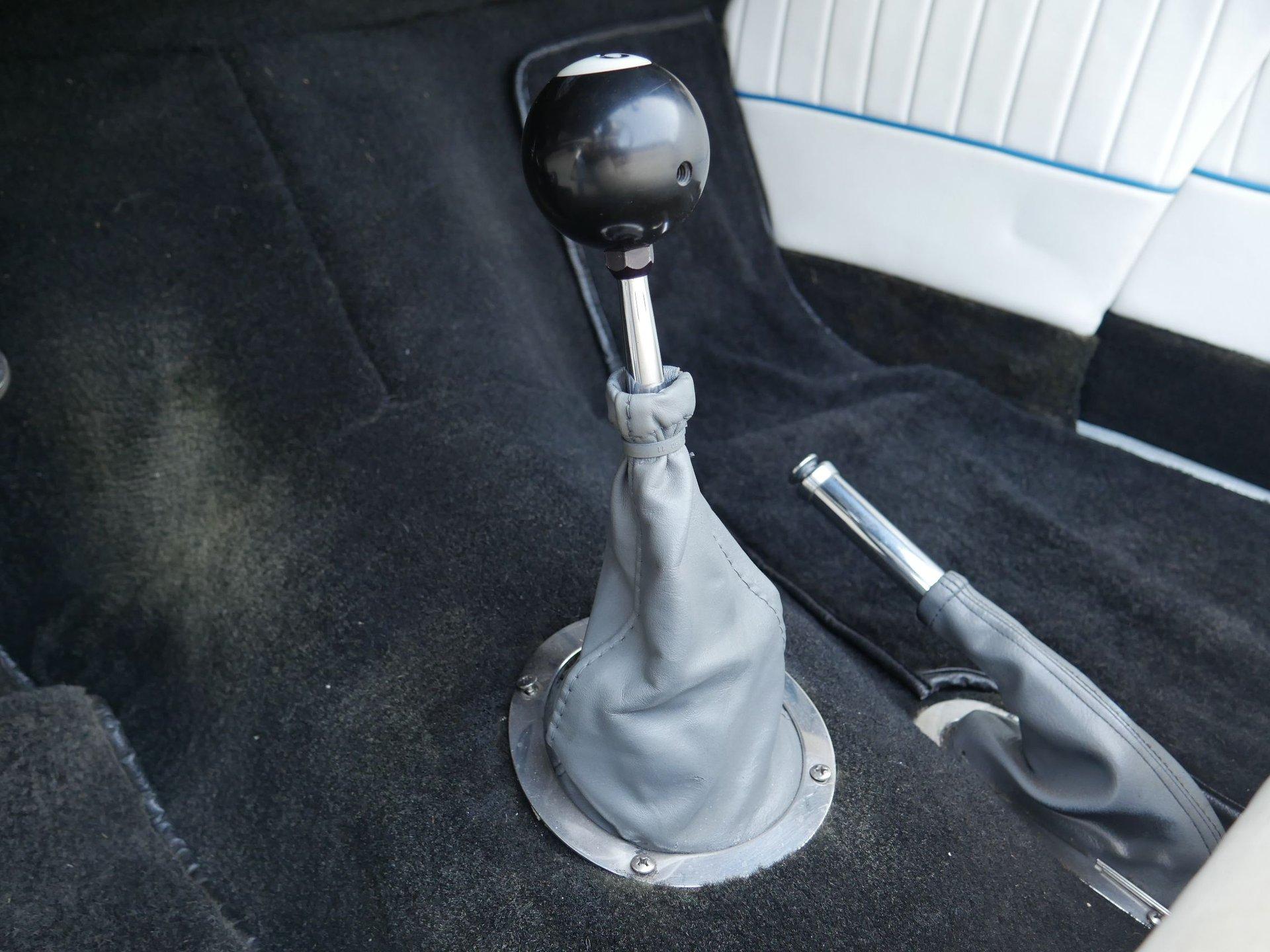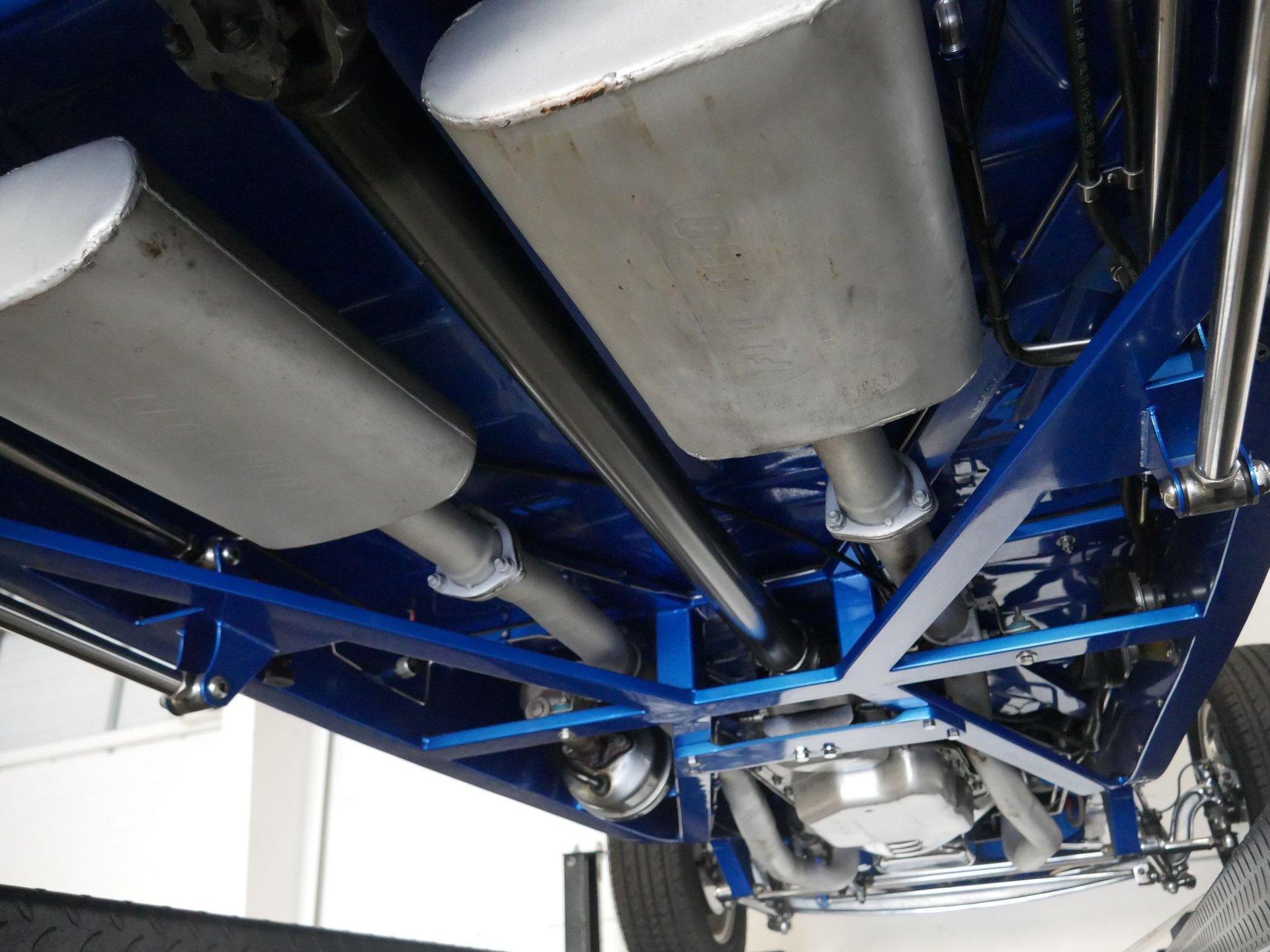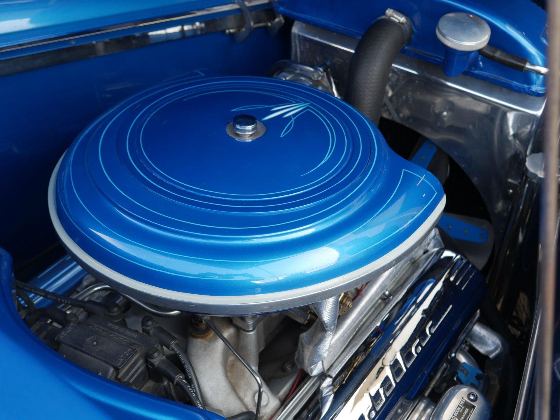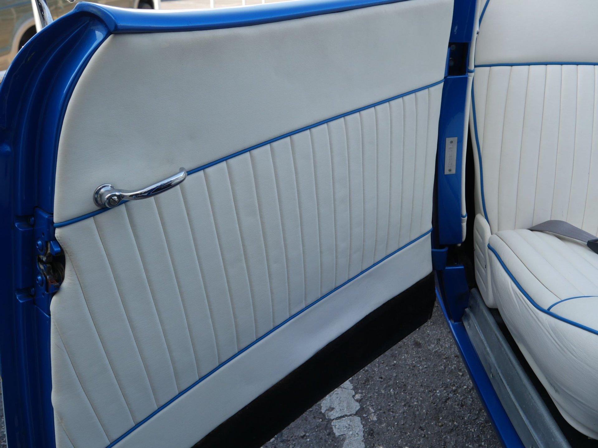 On the interior you are greeted by white ultraleather interior with matching blue piping, a tilt steering column, cruise control, a working glovebox, and seat belts! A Lokar shifter with 8-ball knob takes it to the next level! The dash is nicely painted and pinstriped with a full arsenal of gauges to keep an eye on the V8 under the hood!