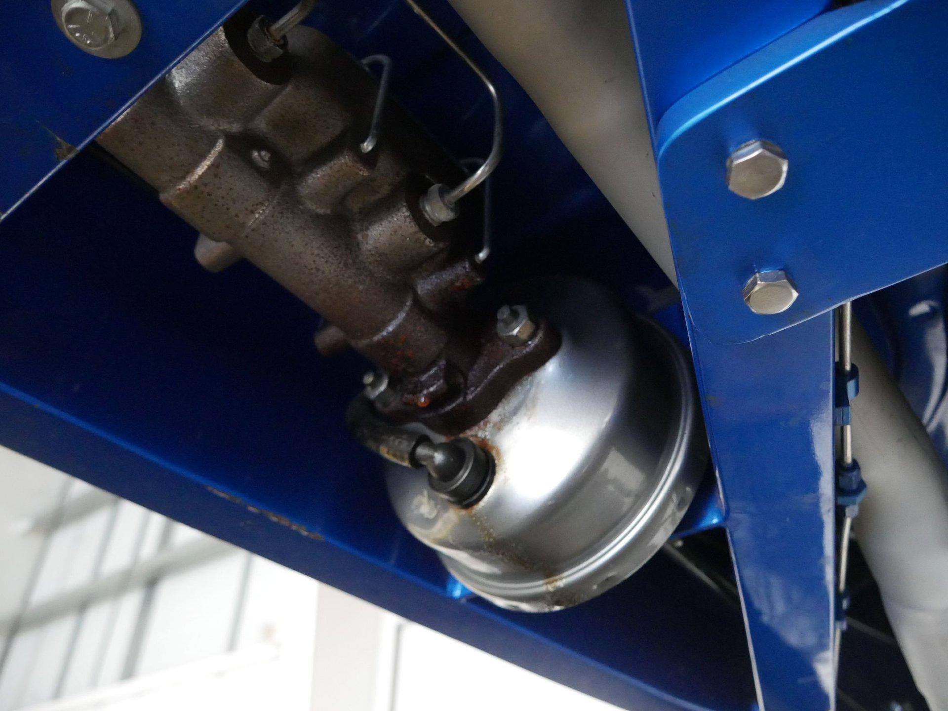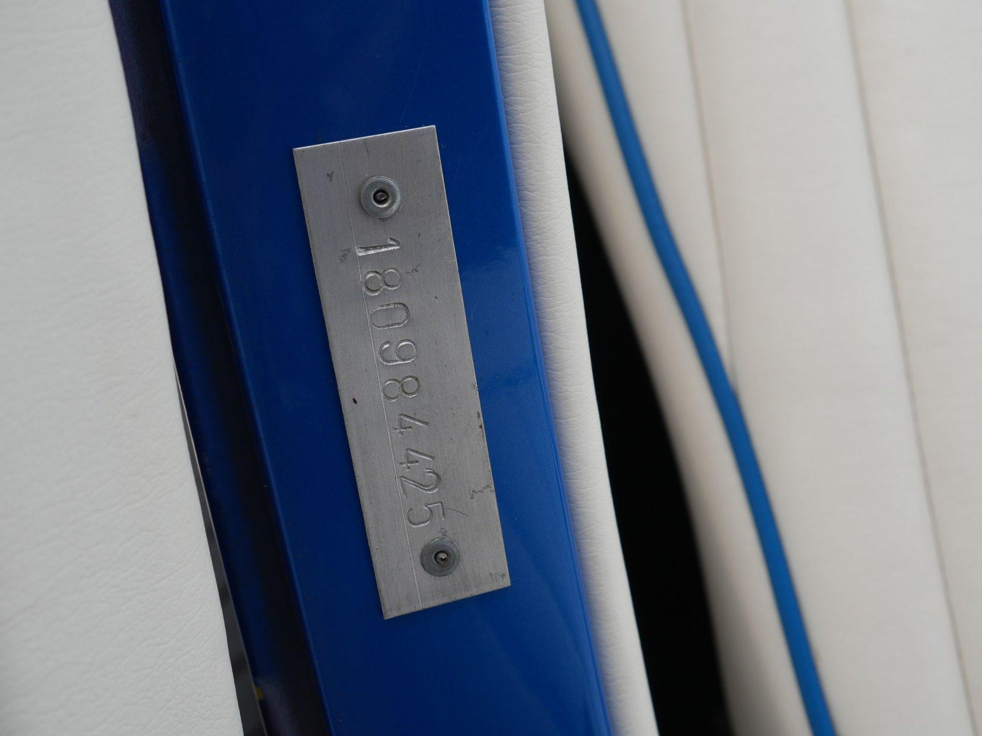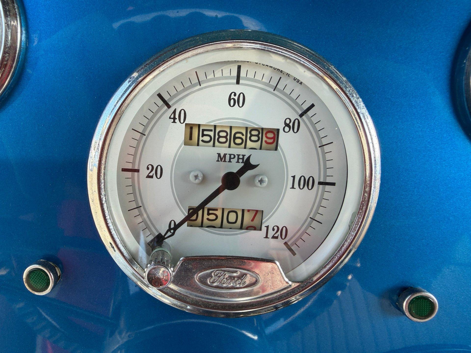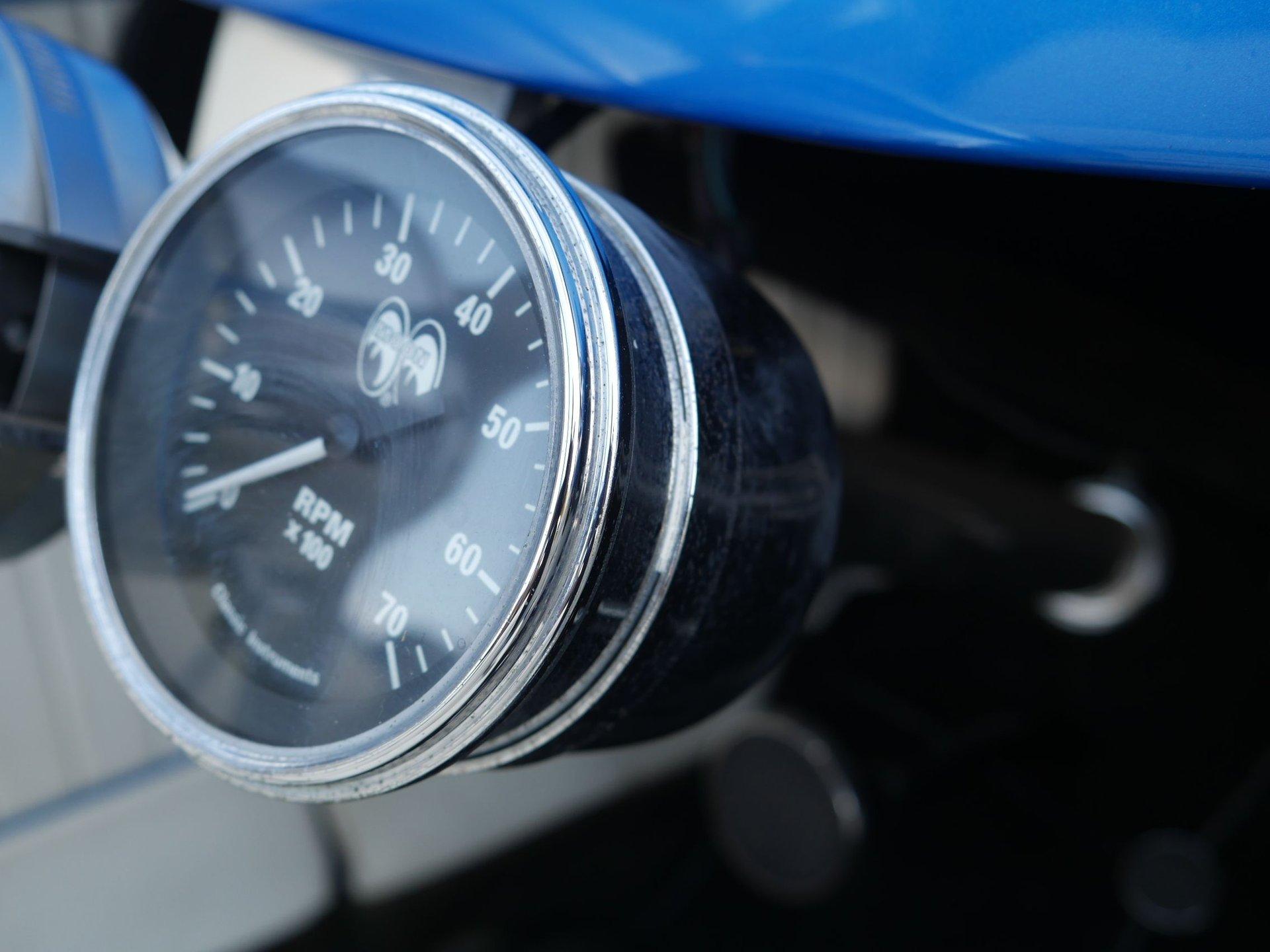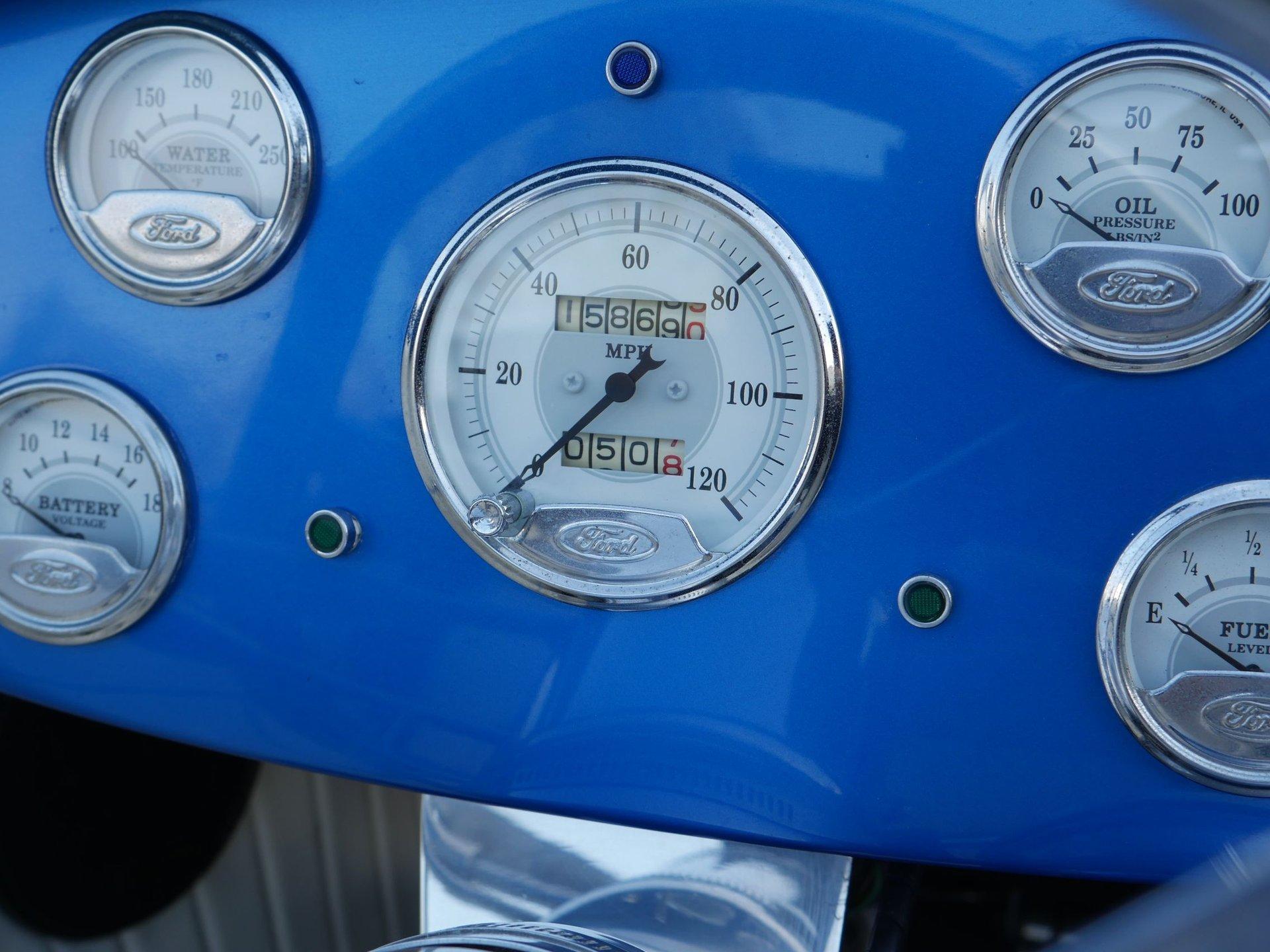 On the interior you are greeted by white ultraleather interior with matching blue piping, a tilt steering column, cruise control, a working glovebox, and seat belts! A Lokar shifter with 8-ball knob takes it to the next level! The dash is nicely painted and pinstriped with a full arsenal of gauges to keep an eye on the V8 under the hood!