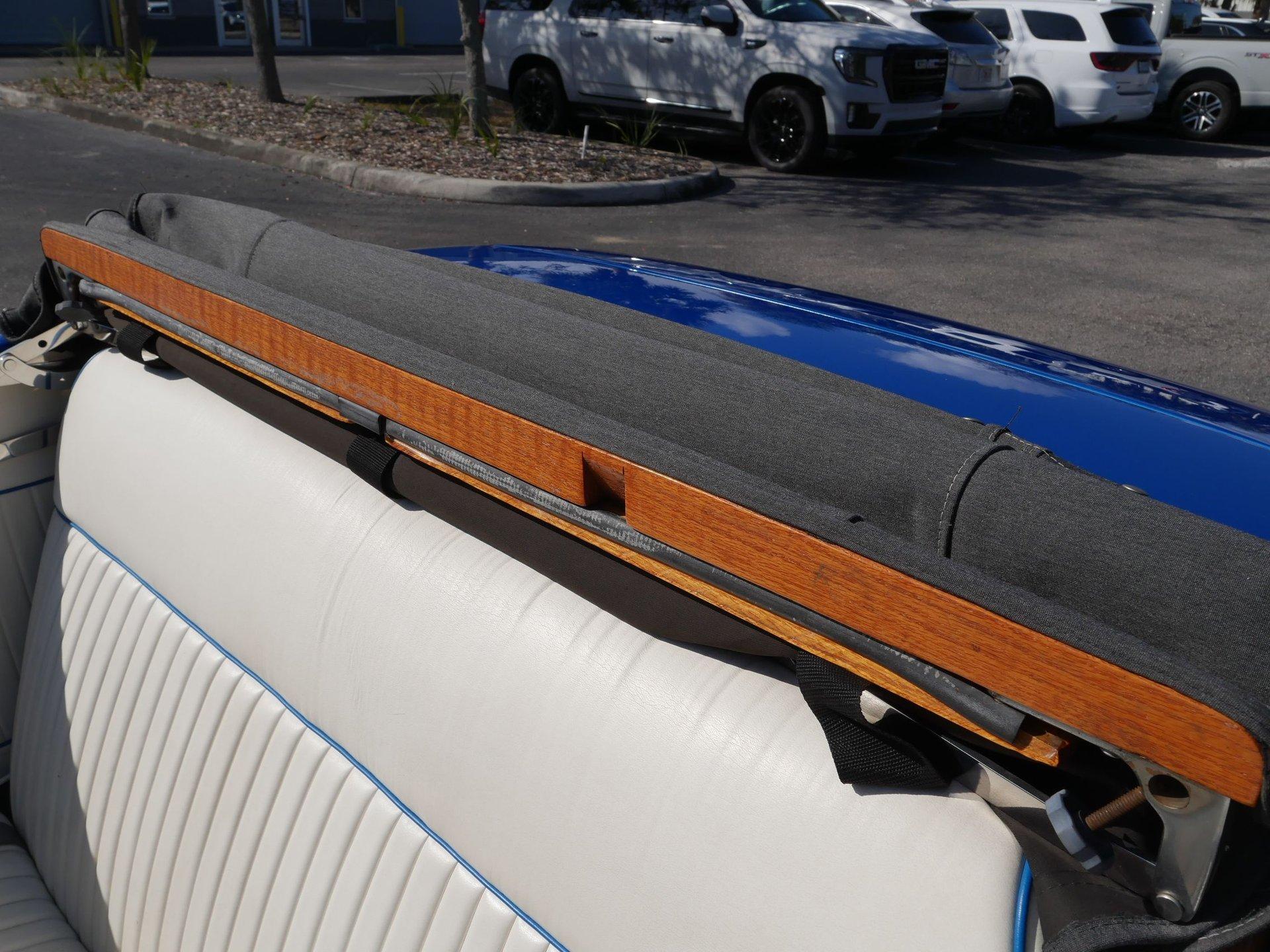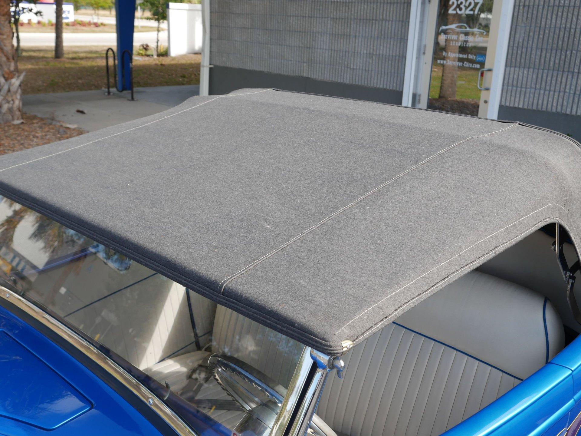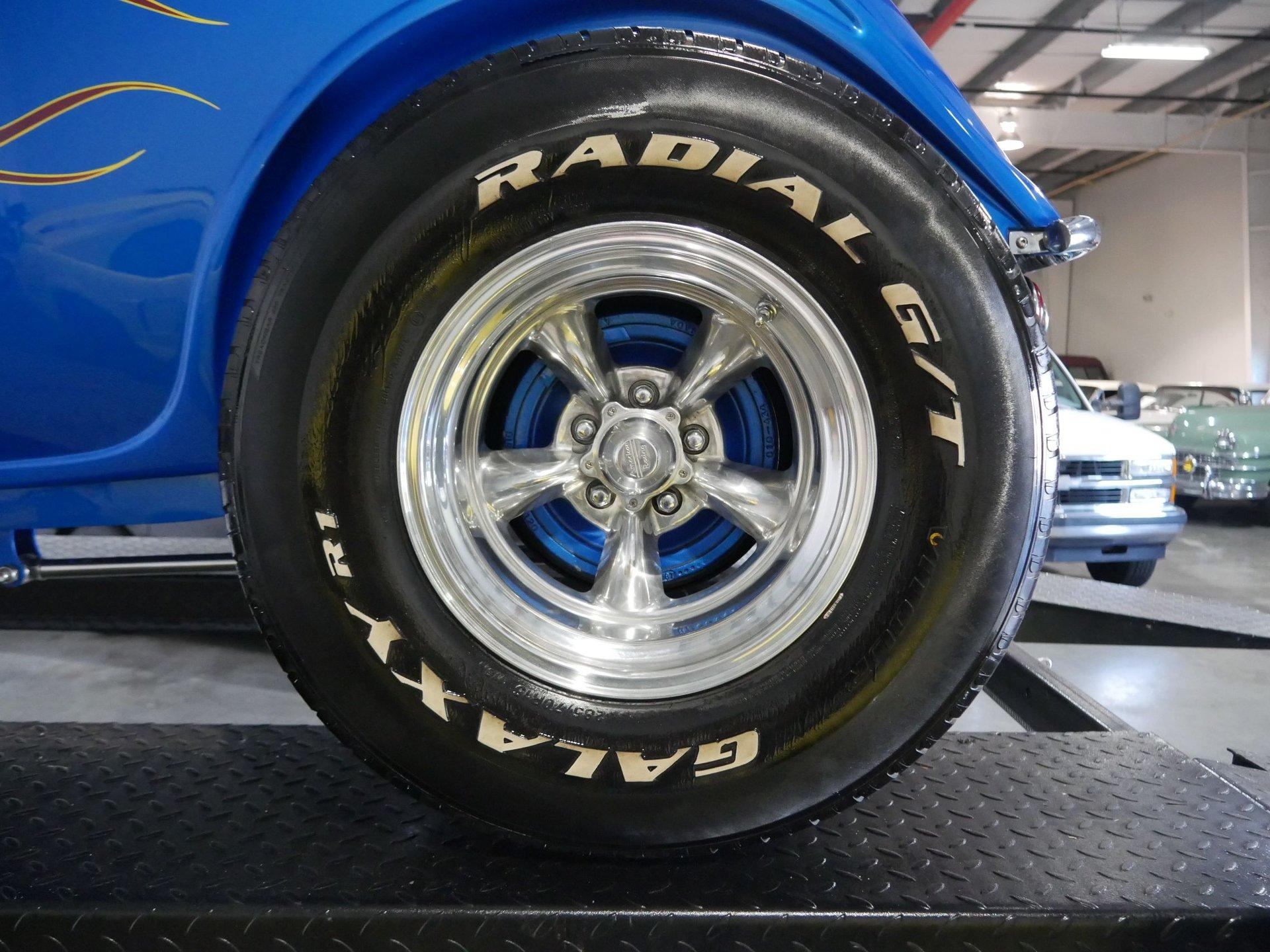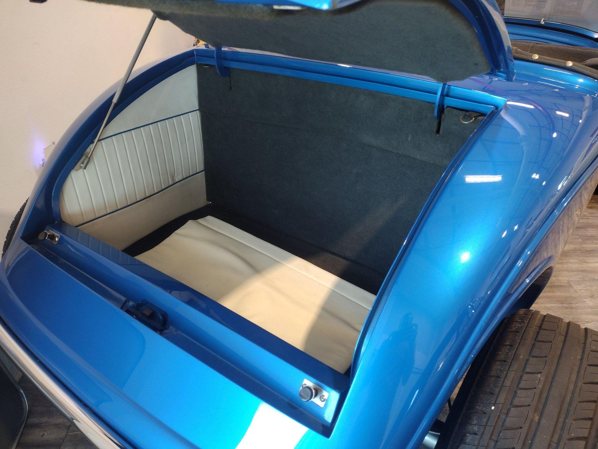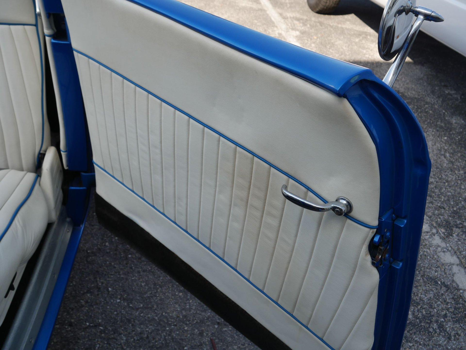 The exterior is a stunning Bright Blue Metallic (Custom PPG Oriental Blue) with hot rod flames in a classy white, fading to gray and plum. American Racing Torque Thrust wheels are wrapped in big and little radial raised white letter tires for a sporty look. Top up or top down, this roadster looks fantastic! The top also has a white vinyl boot to button it all up for shows.