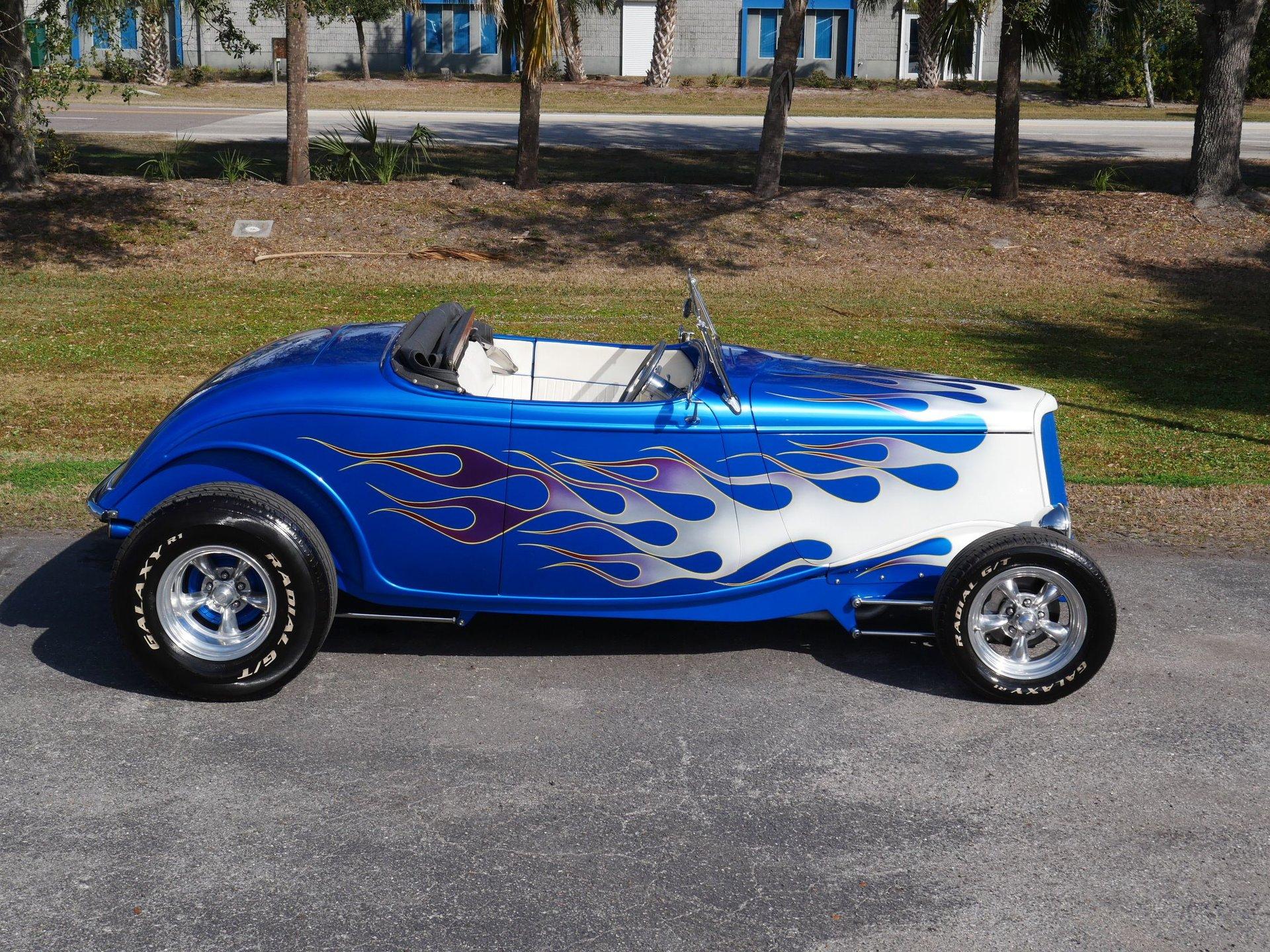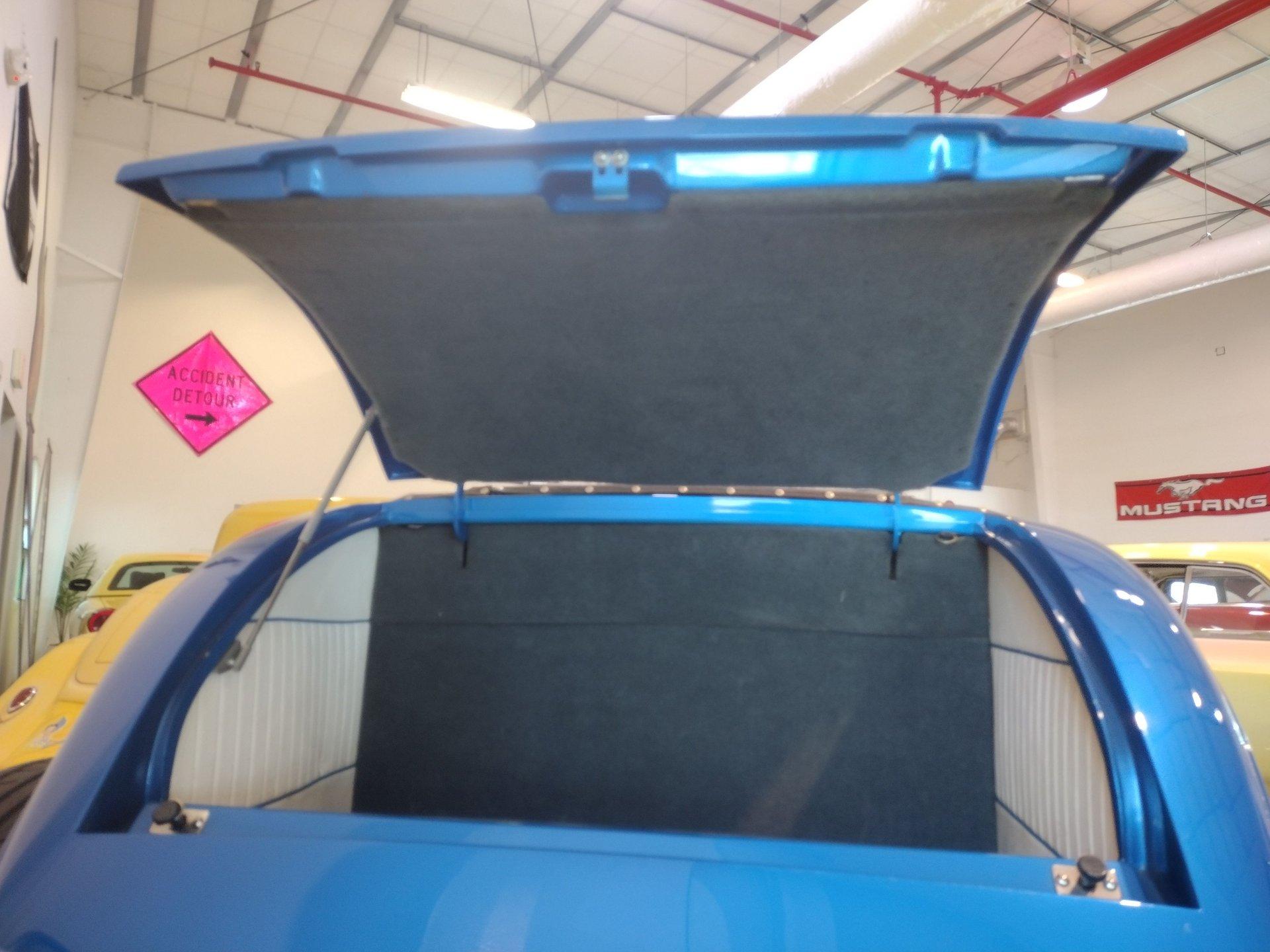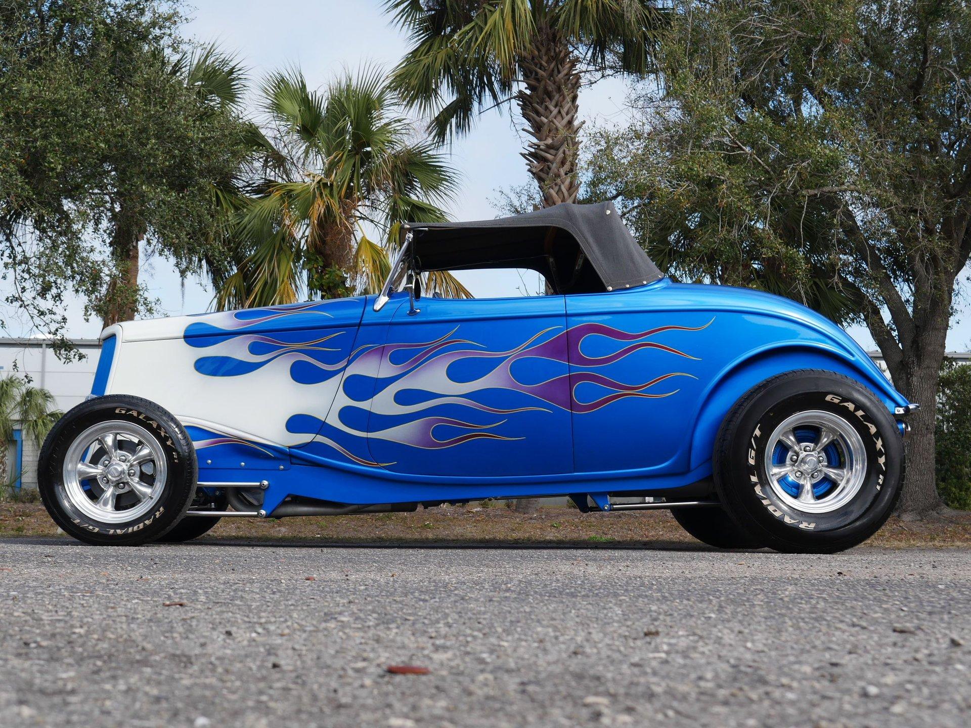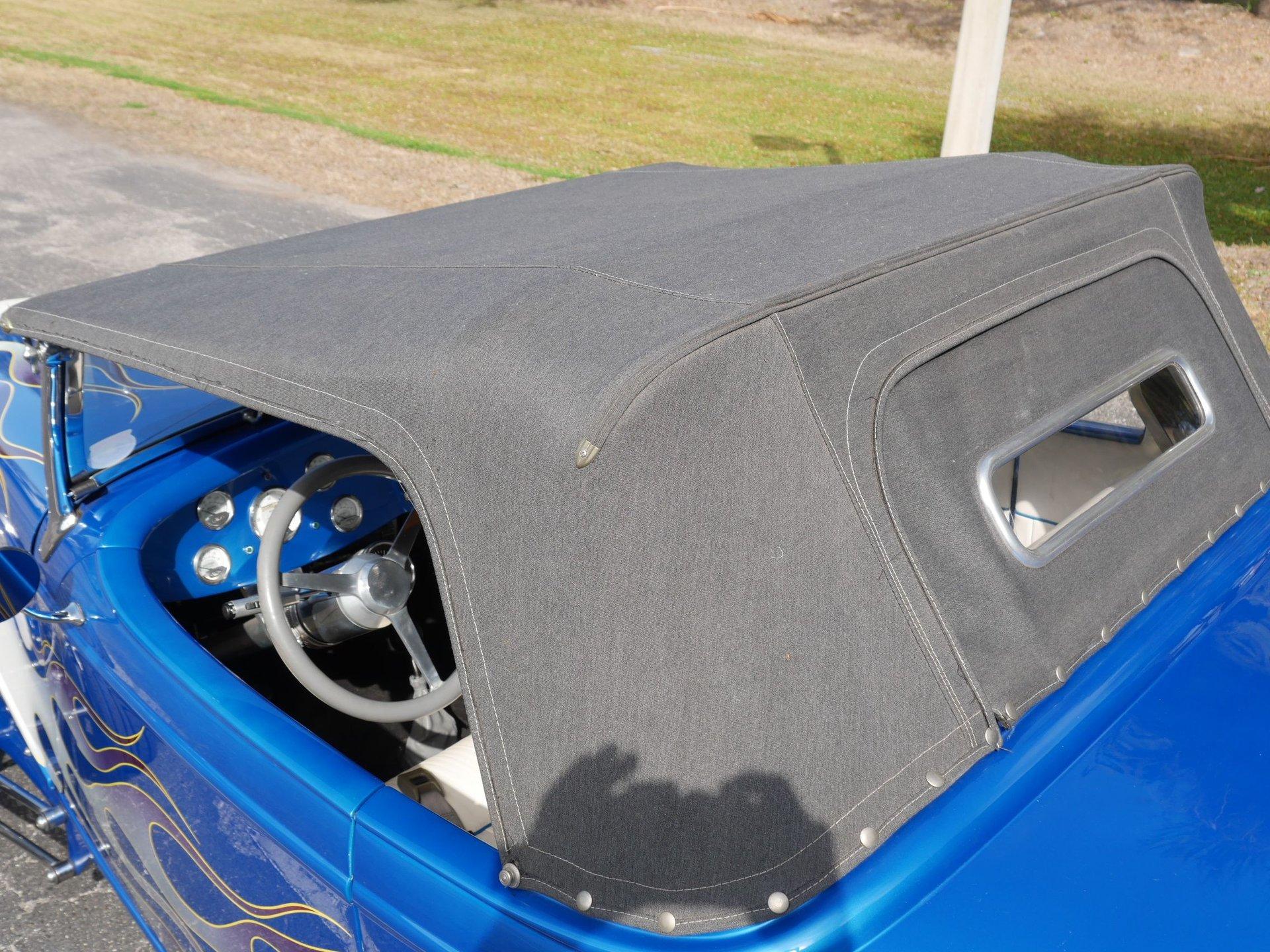 The exterior is a stunning Bright Blue Metallic (Custom PPG Oriental Blue) with hot rod flames in a classy white, fading to gray and plum. American Racing Torque Thrust wheels are wrapped in big and little radial raised white letter tires for a sporty look. Top up or top down, this roadster looks fantastic! The top also has a white vinyl boot to button it all up for shows.