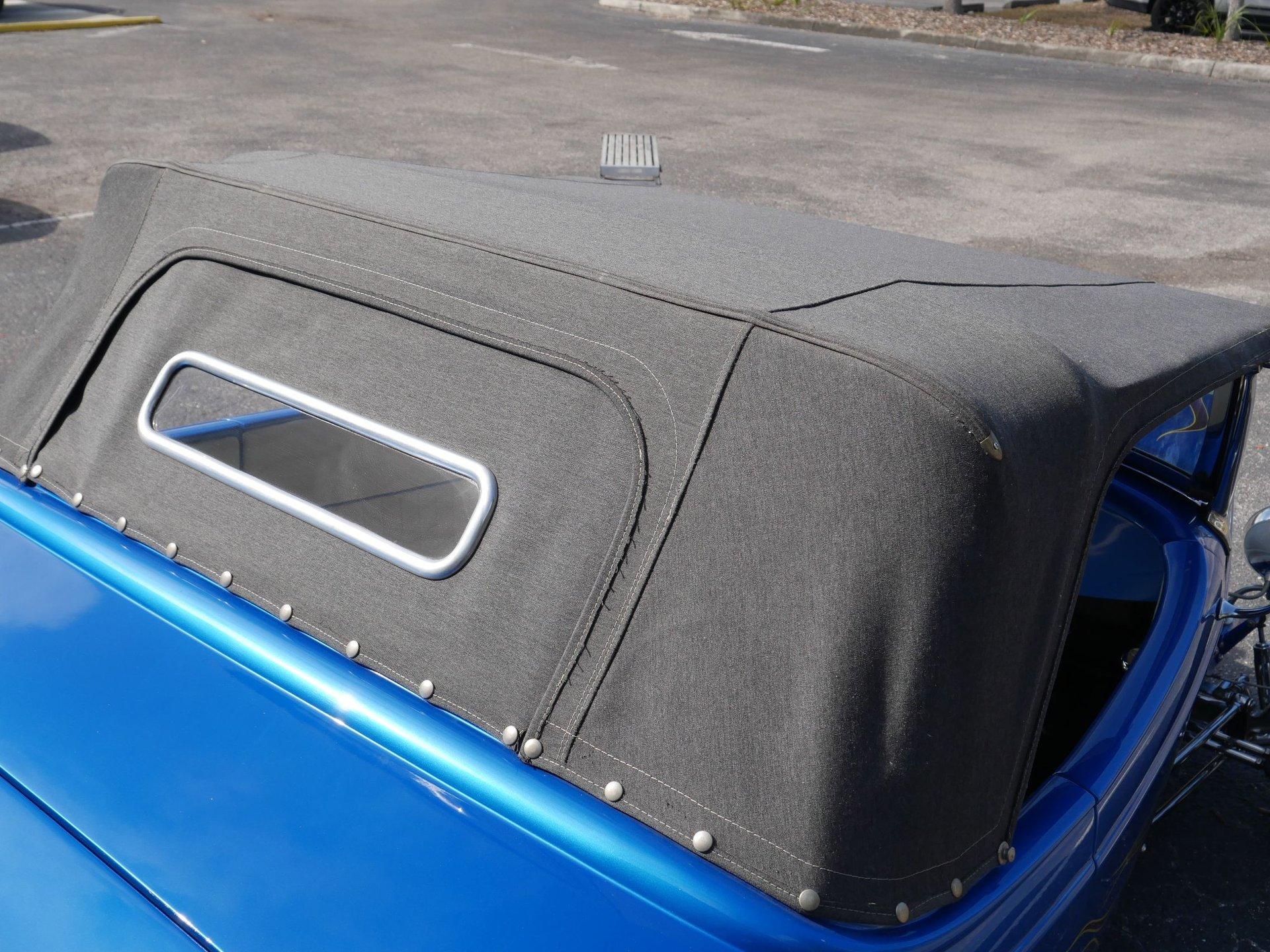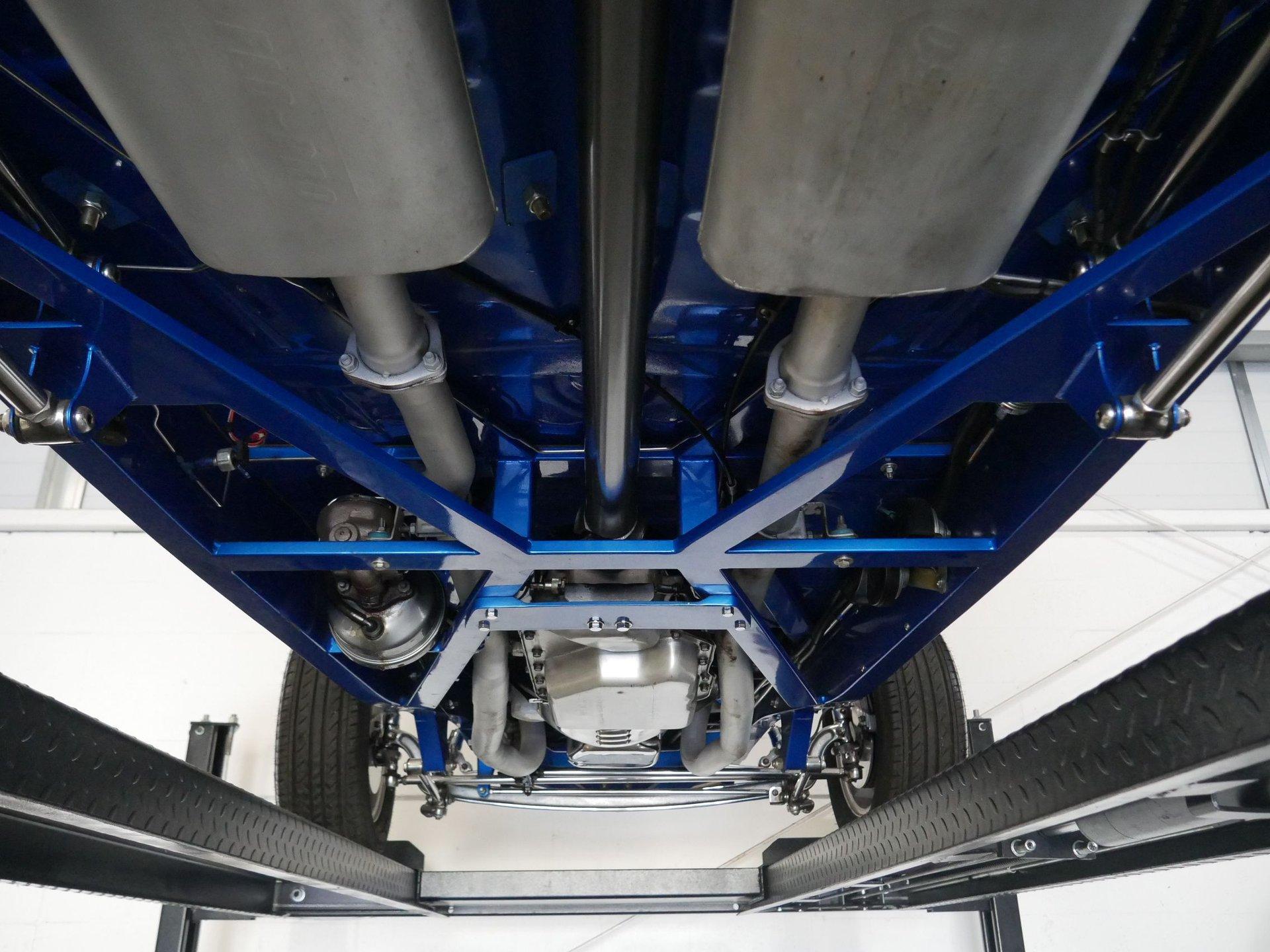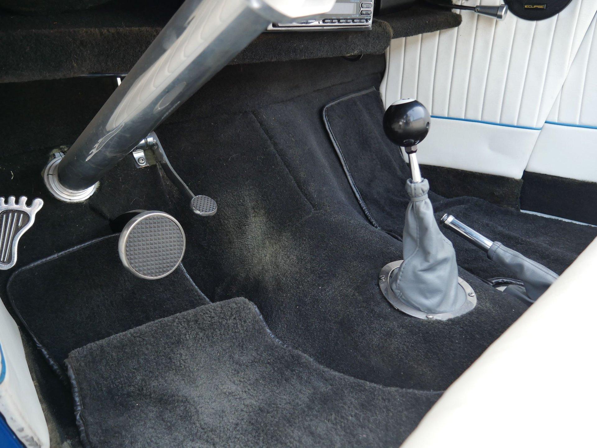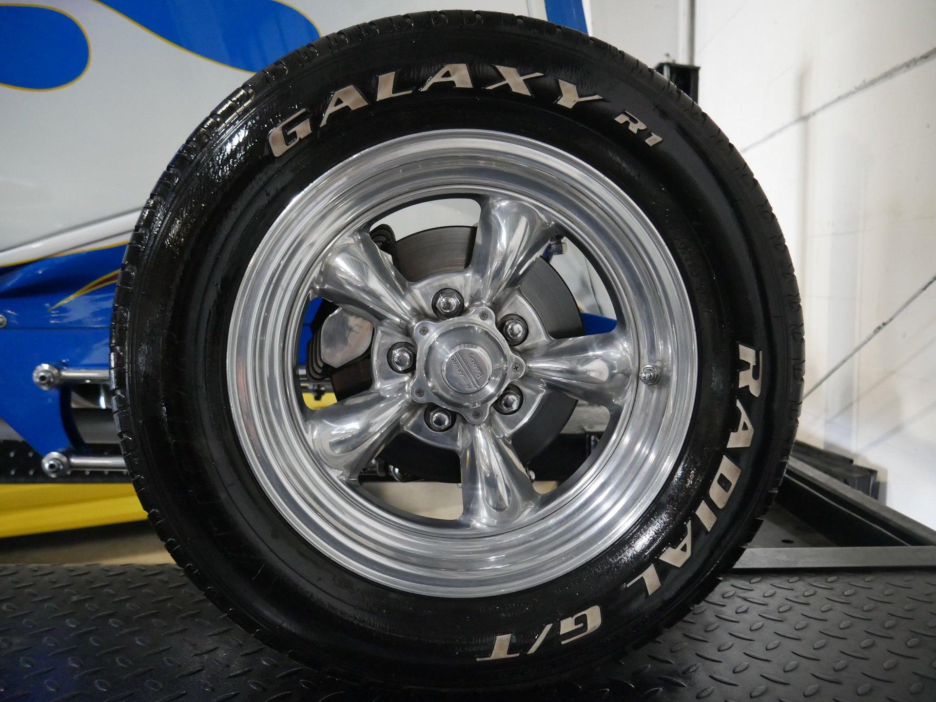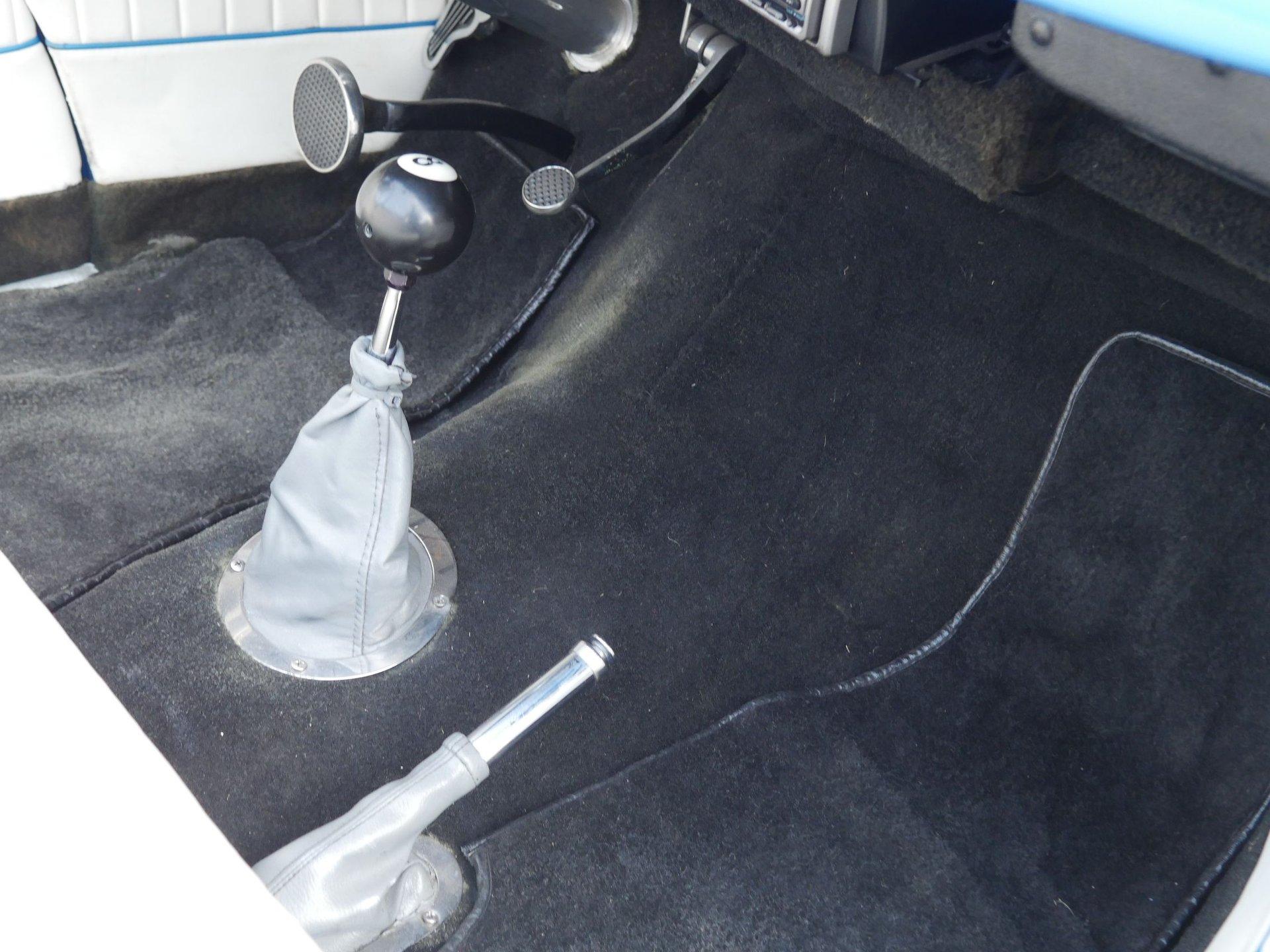 The exterior is a stunning Bright Blue Metallic (Custom PPG Oriental Blue) with hot rod flames in a classy white, fading to gray and plum. American Racing Torque Thrust wheels are wrapped in big and little radial raised white letter tires for a sporty look. Top up or top down, this roadster looks fantastic! The top also has a white vinyl boot to button it all up for shows.