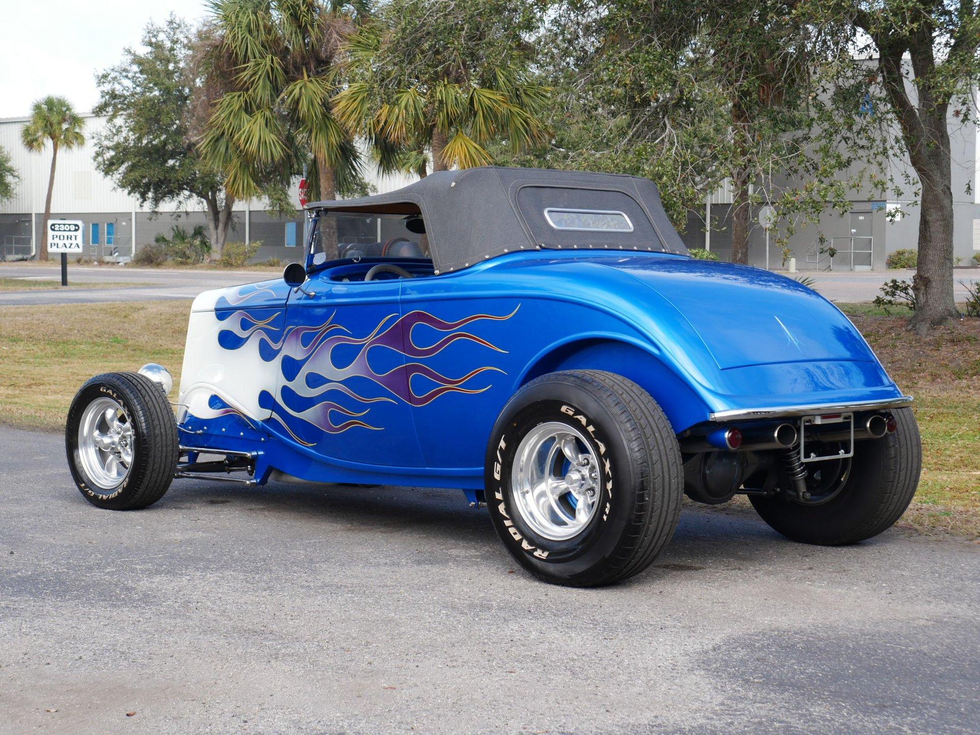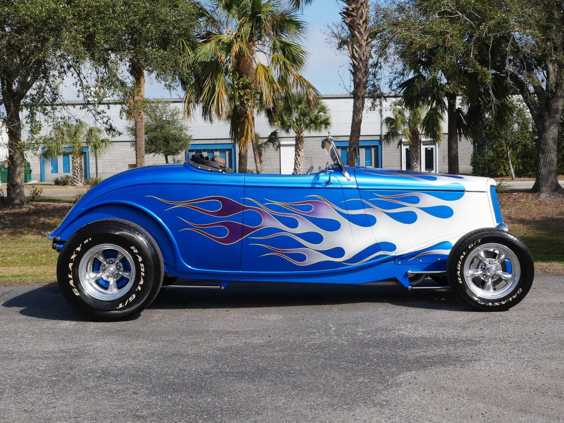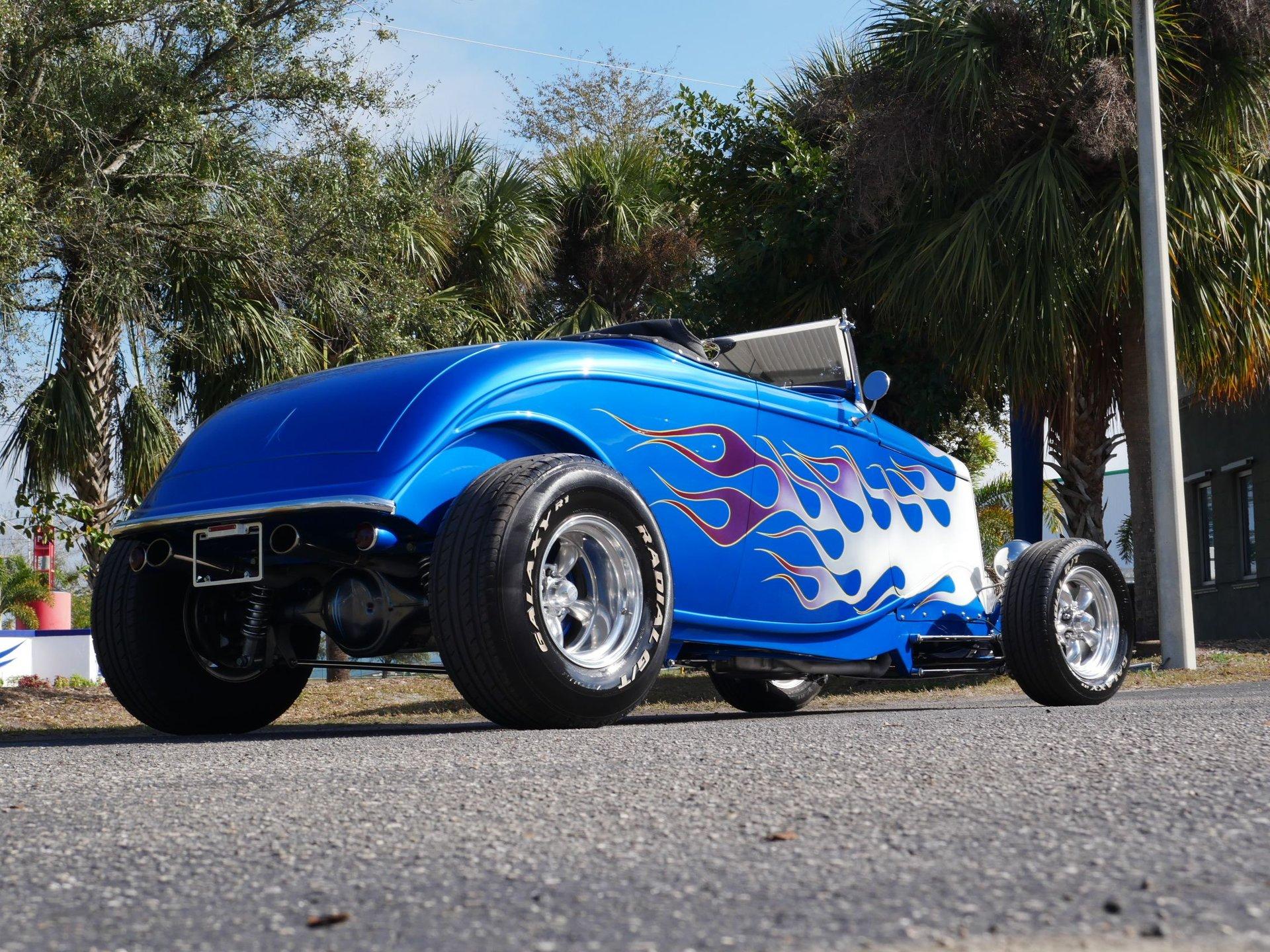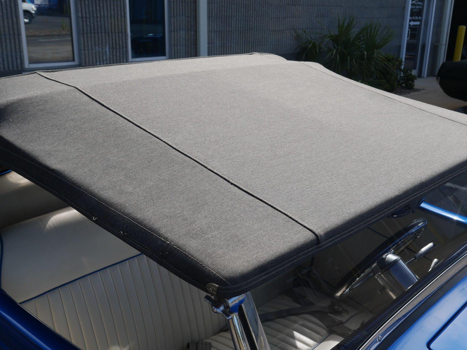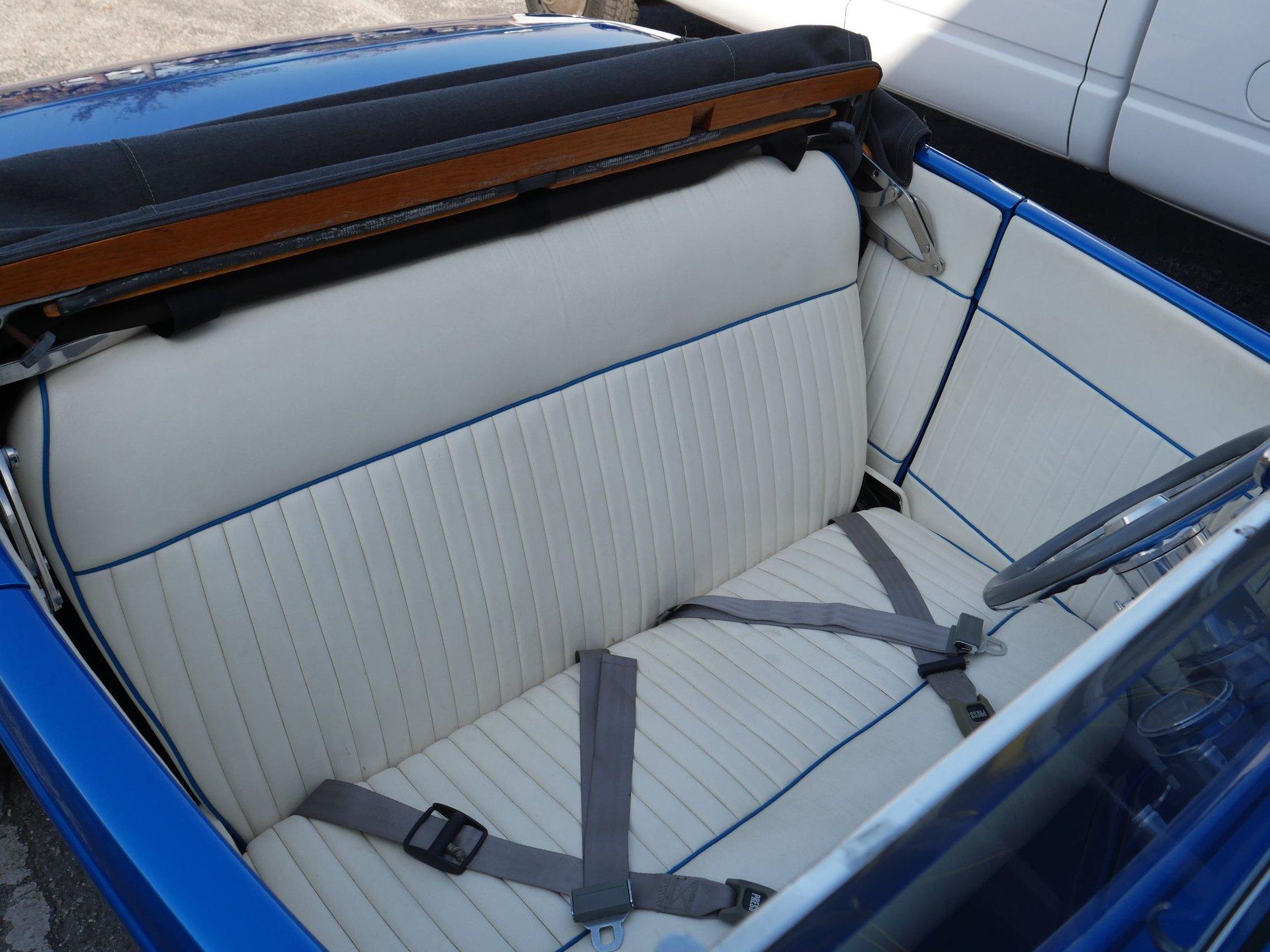 The exterior is a stunning Bright Blue Metallic (Custom PPG Oriental Blue) with hot rod flames in a classy white, fading to gray and plum. American Racing Torque Thrust wheels are wrapped in big and little radial raised white letter tires for a sporty look. Top up or top down, this roadster looks fantastic! The top also has a white vinyl boot to button it all up for shows.