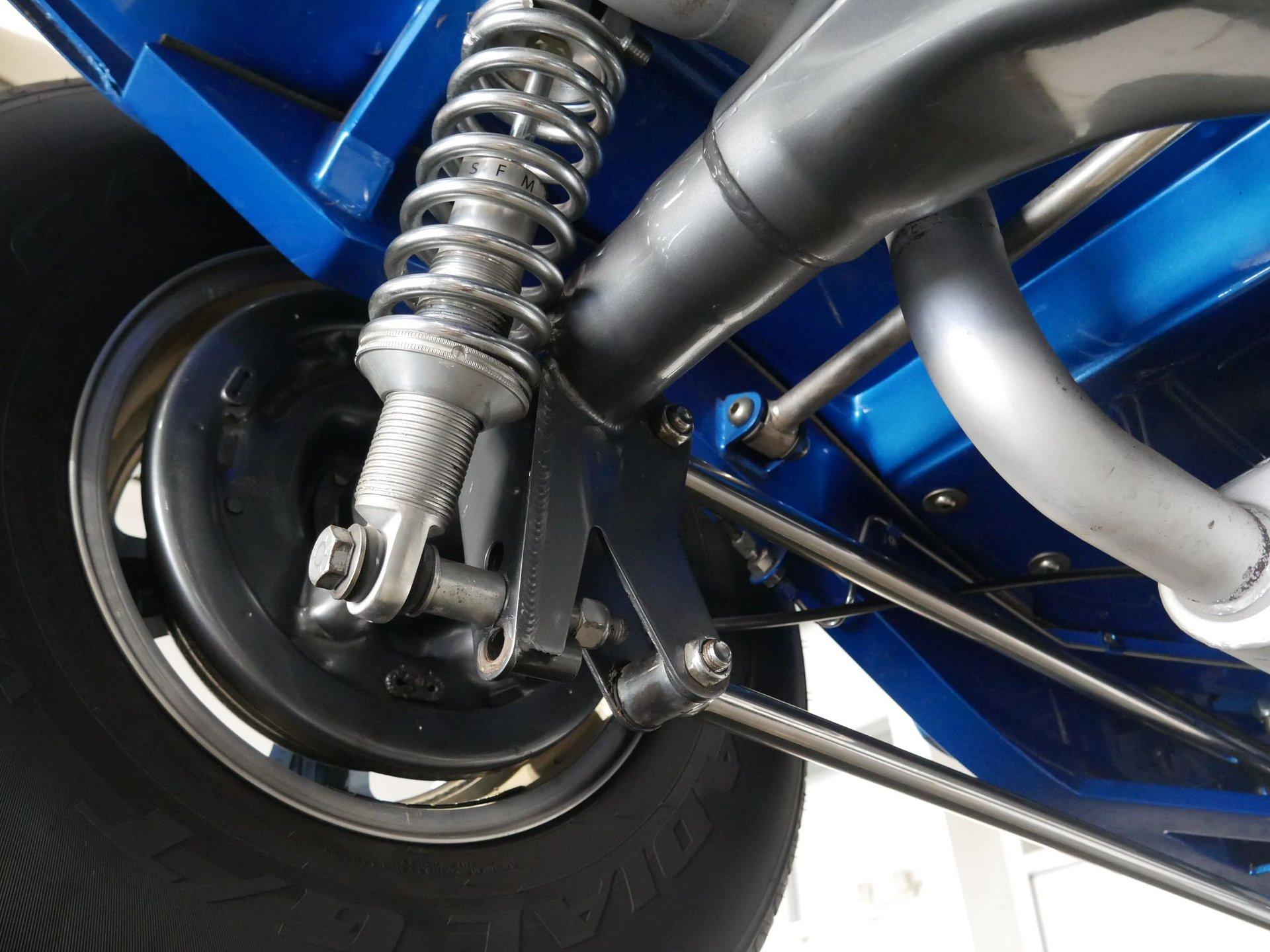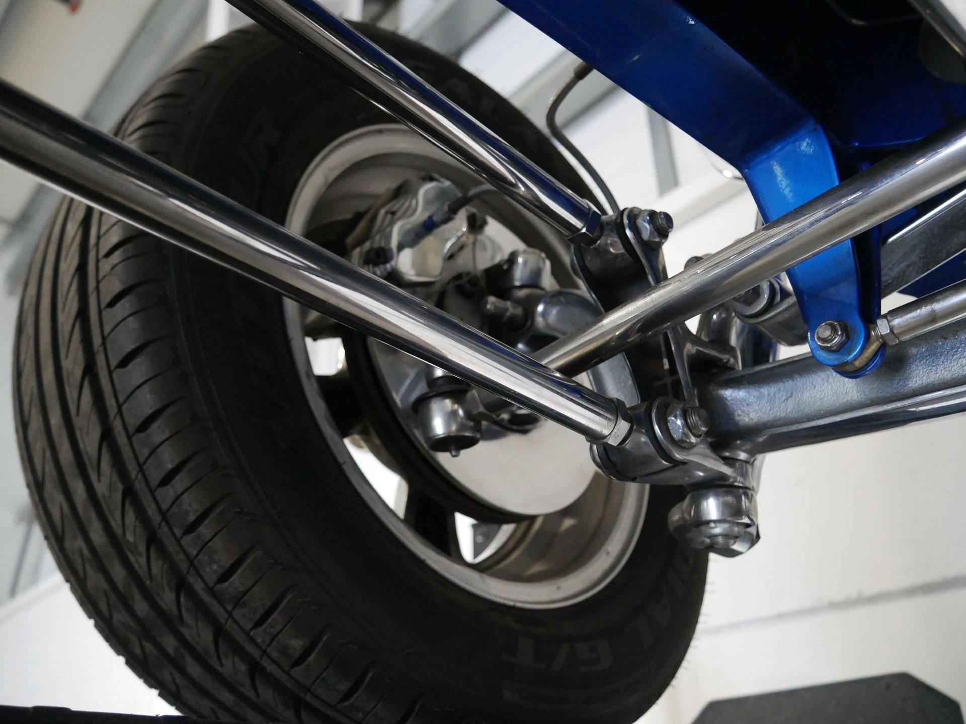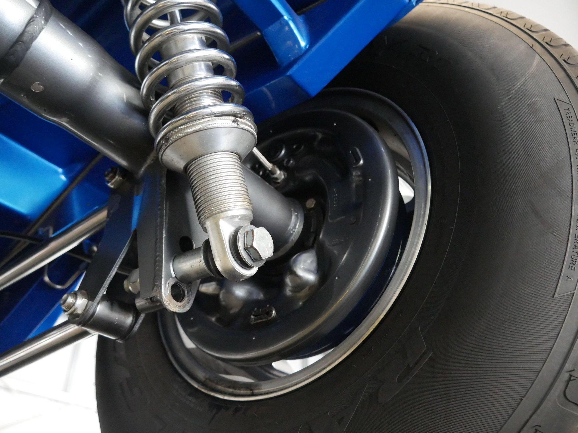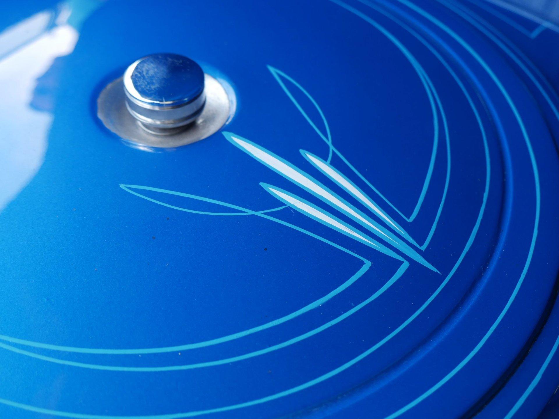 The exterior is a stunning Bright Blue Metallic (Custom PPG Oriental Blue) with hot rod flames in a classy white, fading to gray and plum. American Racing Torque Thrust wheels are wrapped in big and little radial raised white letter tires for a sporty look. Top up or top down, this roadster looks fantastic! The top also has a white vinyl boot to button it all up for shows.