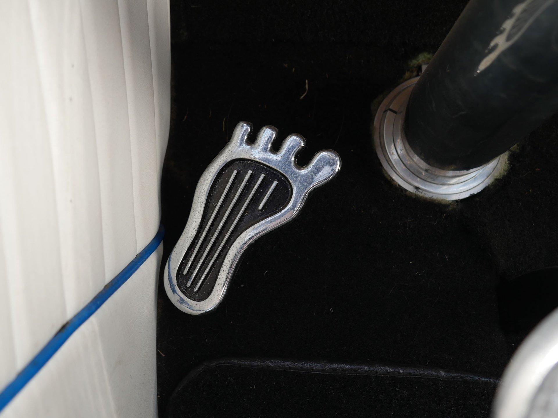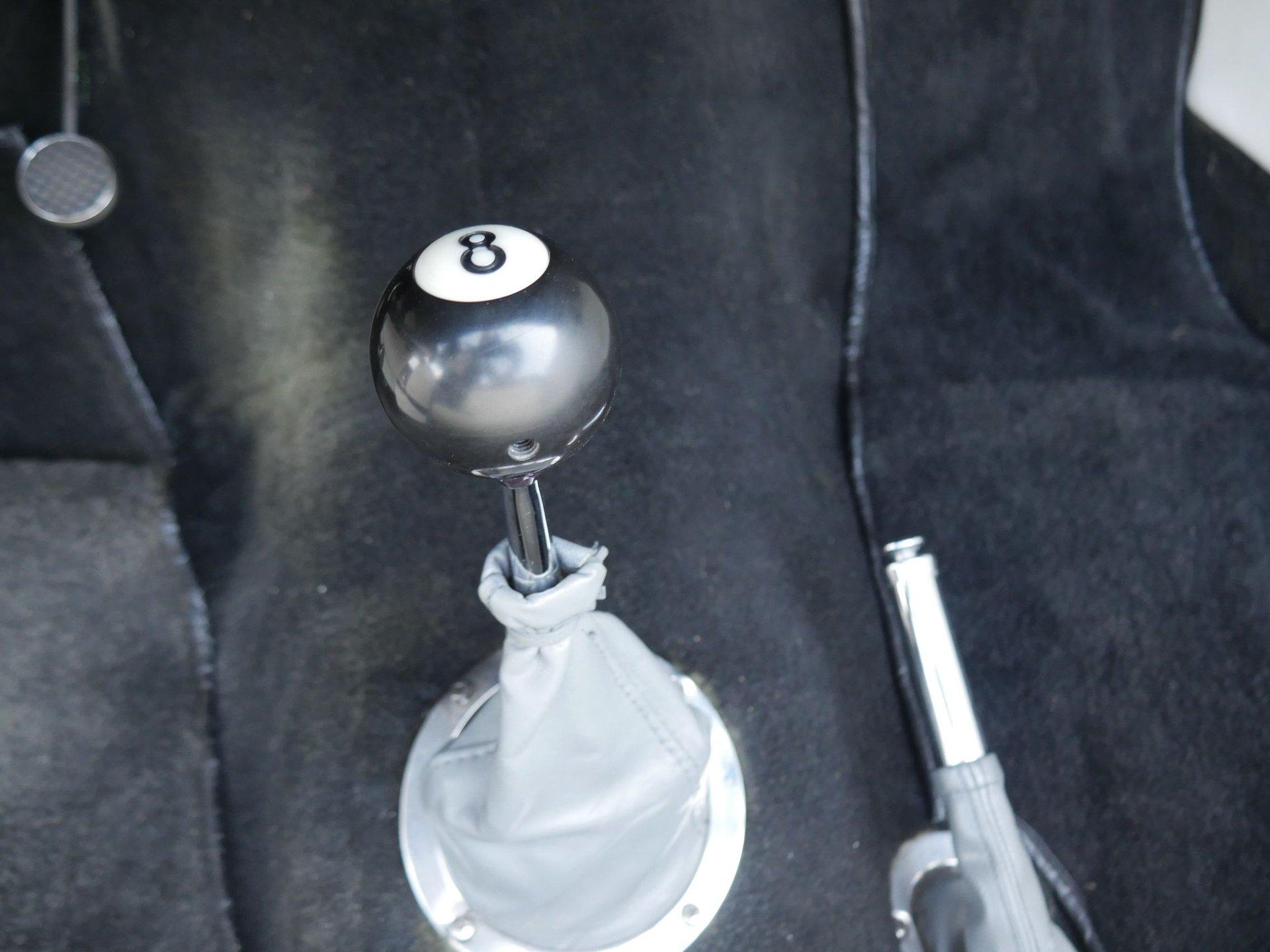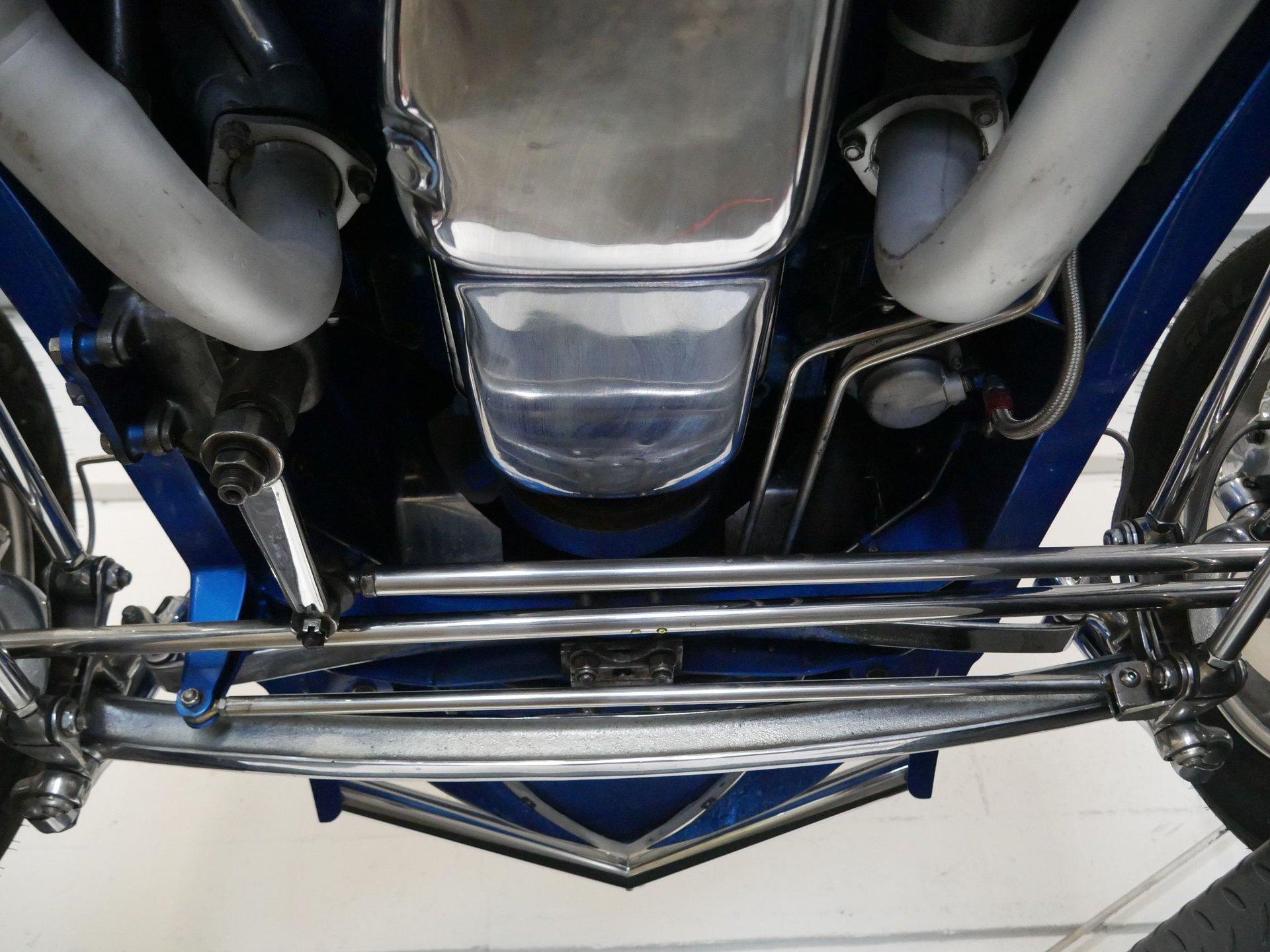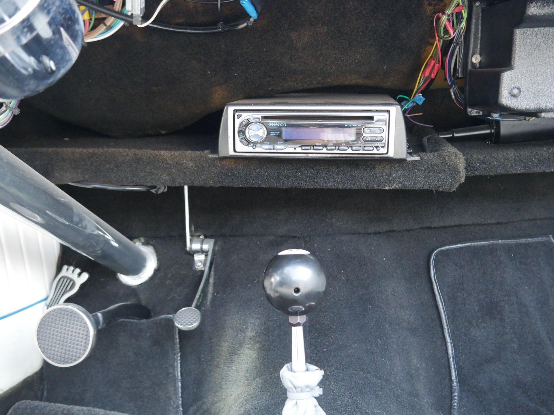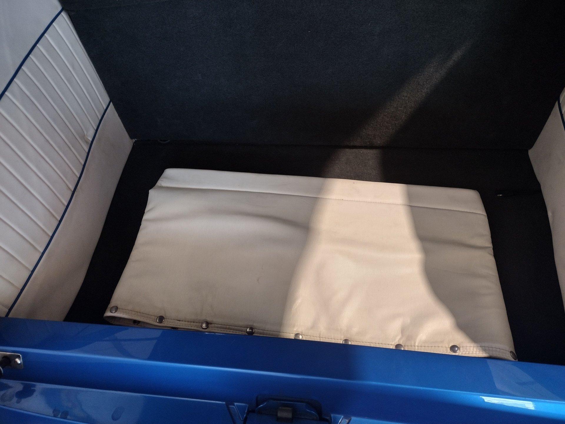 The exterior is a stunning Bright Blue Metallic (Custom PPG Oriental Blue) with hot rod flames in a classy white, fading to gray and plum. American Racing Torque Thrust wheels are wrapped in big and little radial raised white letter tires for a sporty look. Top up or top down, this roadster looks fantastic! The top also has a white vinyl boot to button it all up for shows.