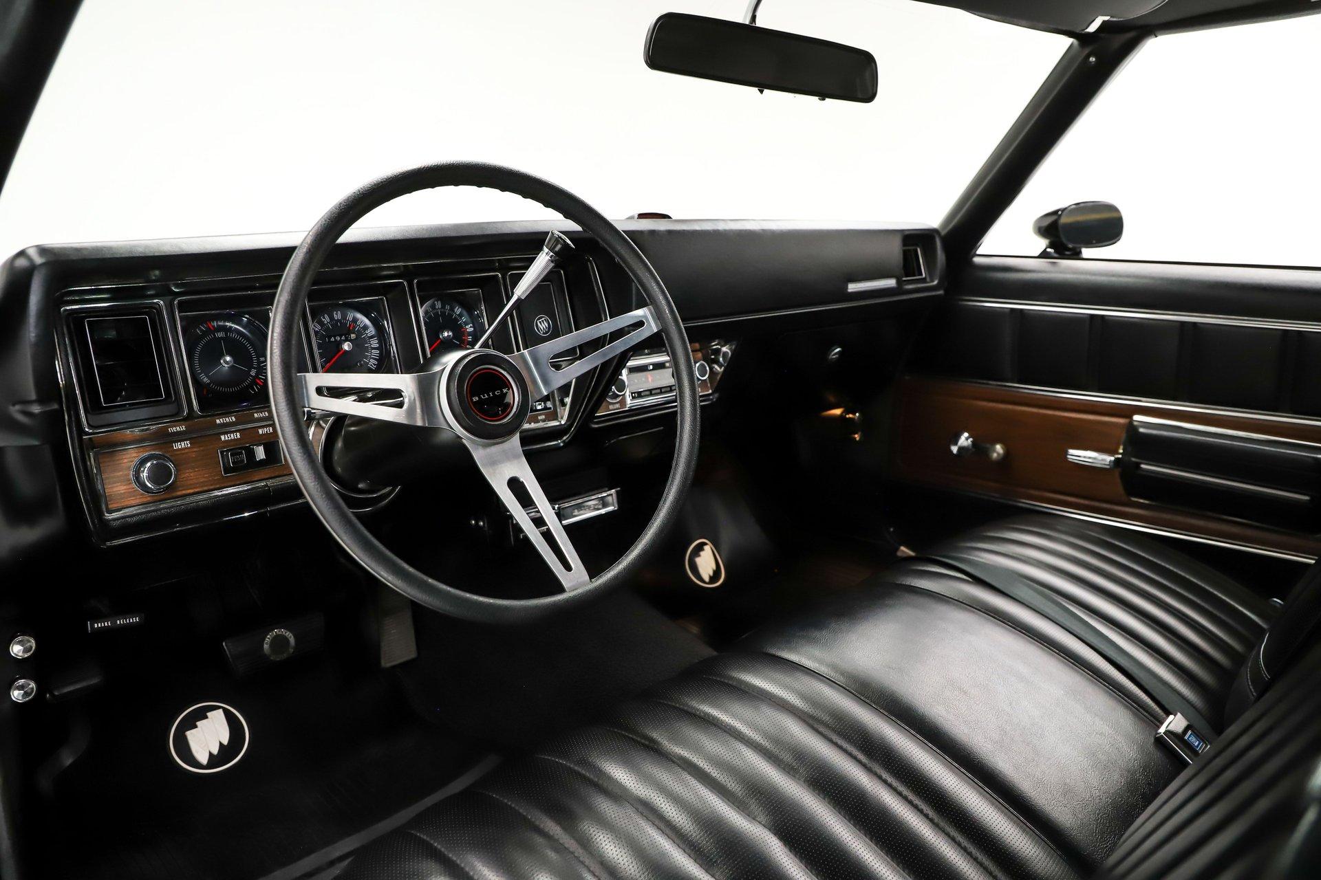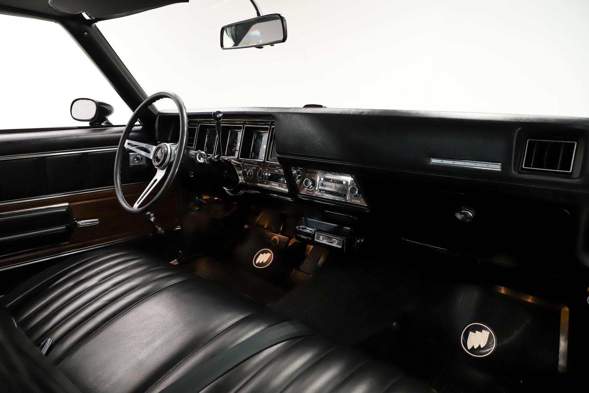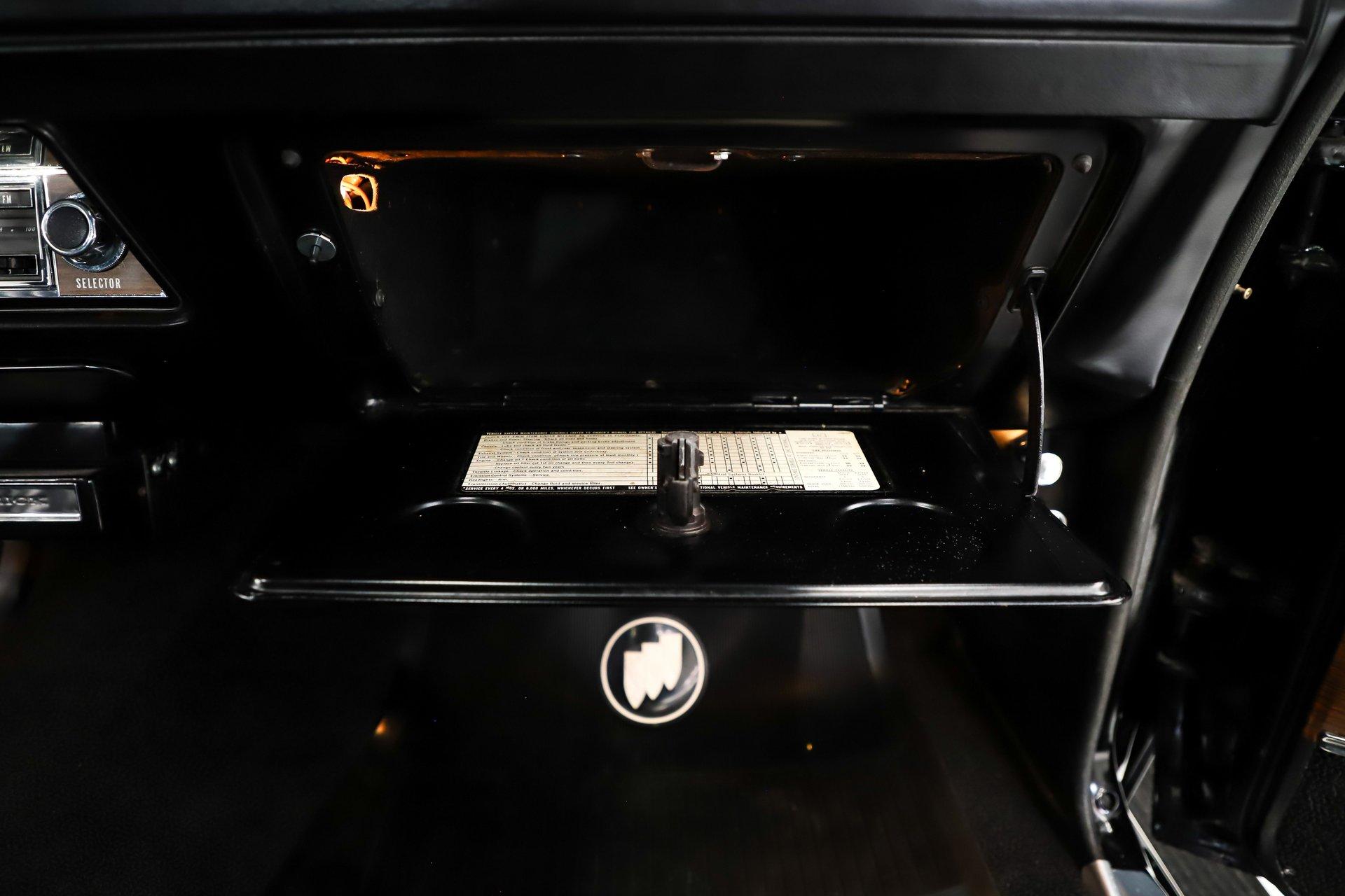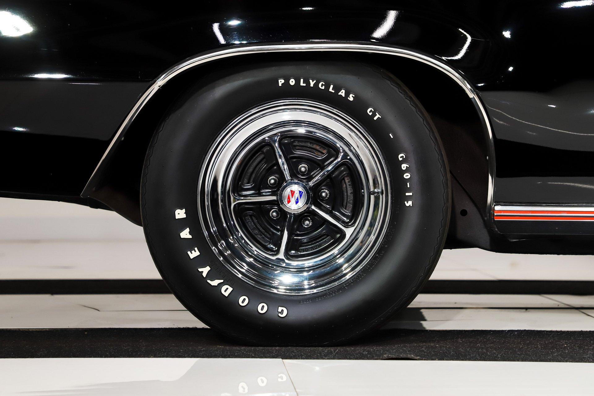 EXTERIOR: It is extraordinary that this car presents so sharply while remaining all original. It is absolutely rust free, retaining its original body panels, which are straight, undamaged, and fit exceptionally well. It is also claimed to wear its original paint and you would have to look very closely to find even the slightest imperfection. The black was a special order color costing $113 extra. It shows beautifully. All of the chrome and trim is bright, straight, and in excellent condition. The original vinyl top remains in outstanding shape. Even the original windshield is crystal clear, along with the rest of the glass. Some unique features include the ram air hood, red stripes on the rockers (unique to 455s), optional sport mirrors and the N25 rear bumper exhaust cutouts. It sits proudly on 15x7 chrome Buick mag wheels wrapped in Goodyear Polyglas GT tires, giving it an unmistakably period correct stance.