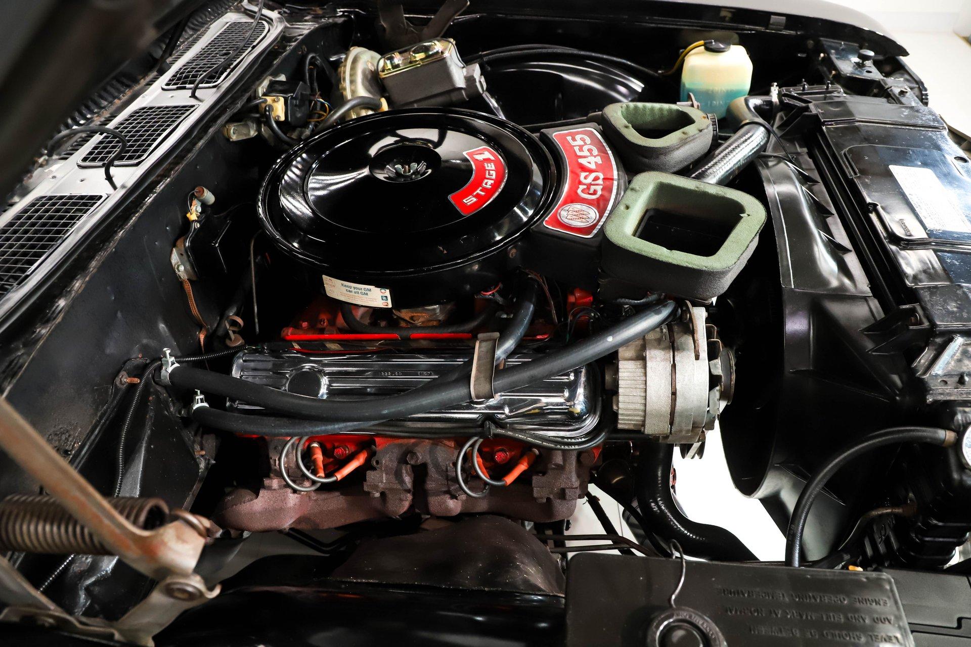 ENGINE COMPARTMENT: Under the hood lies the torque monster 455 Stage 1 engine, original to the car and never removed. It retains its original components, including the manifolds, carburetor, distributor, and more. Stage-1 models were uniquely dressed with chrome valve covers, and this one's Ram Air system is complete, right down to the heat riser tube. Additional features include power steering and power brakes. It appears to retain the original brake booster, with remnants of the factory tag and original paint markings still visible. The engine compartment presents as a very clean, well preserved original space that has been properly maintained as needed.