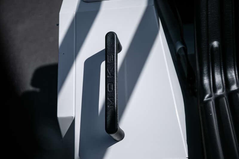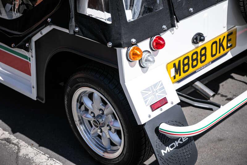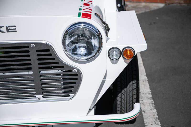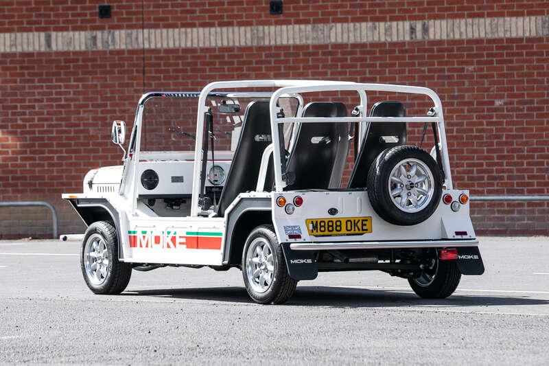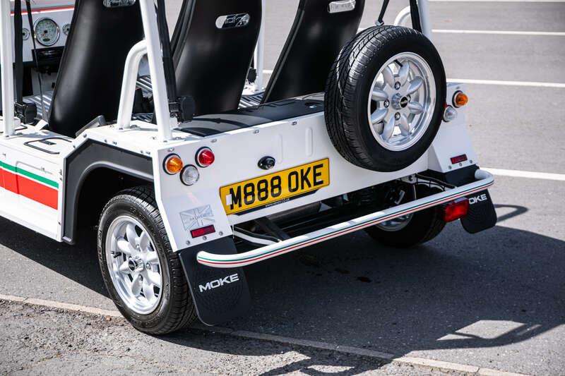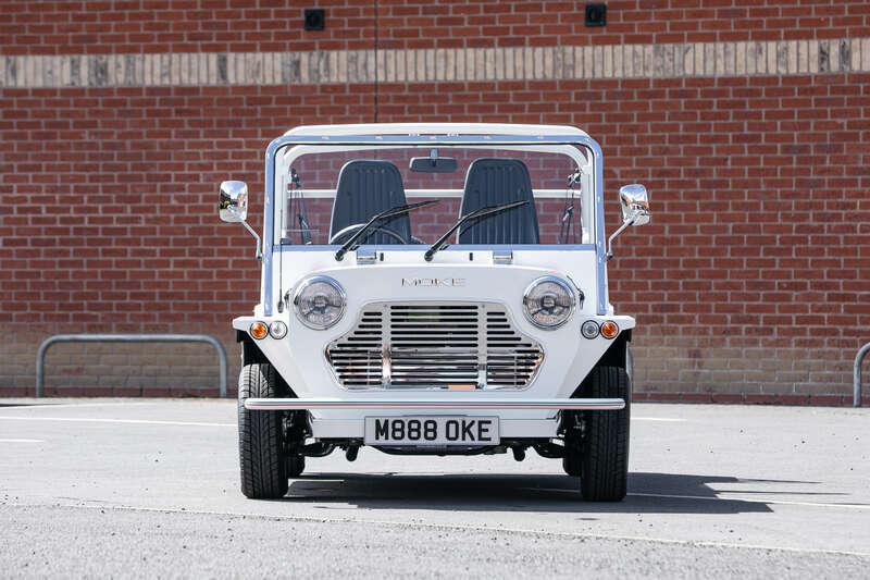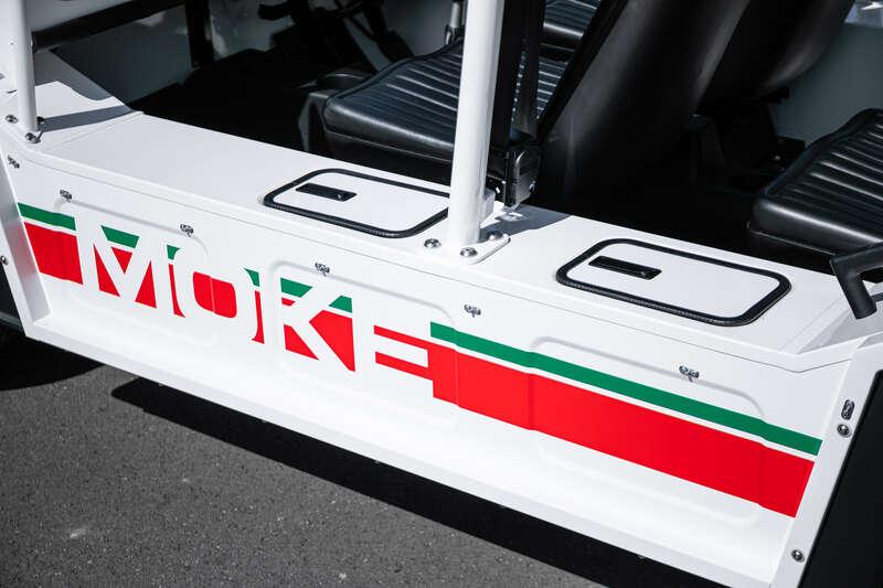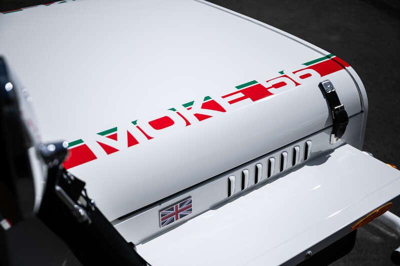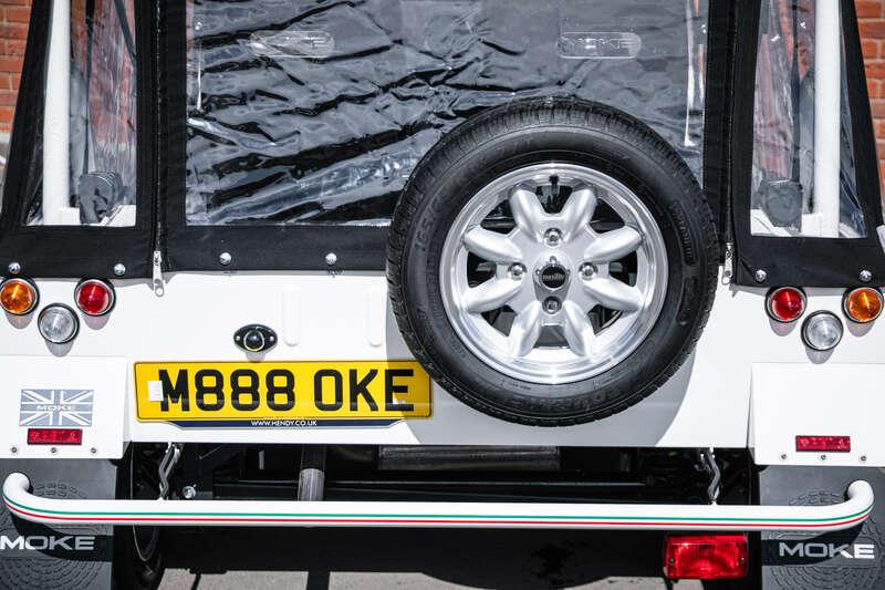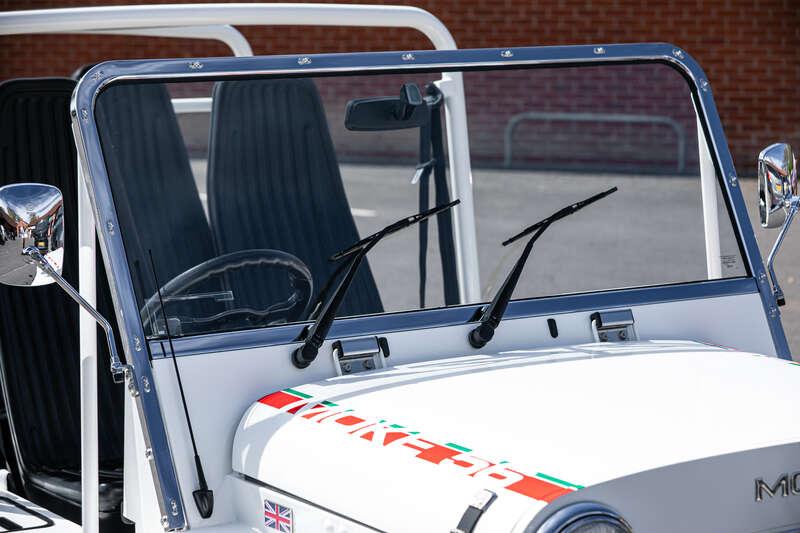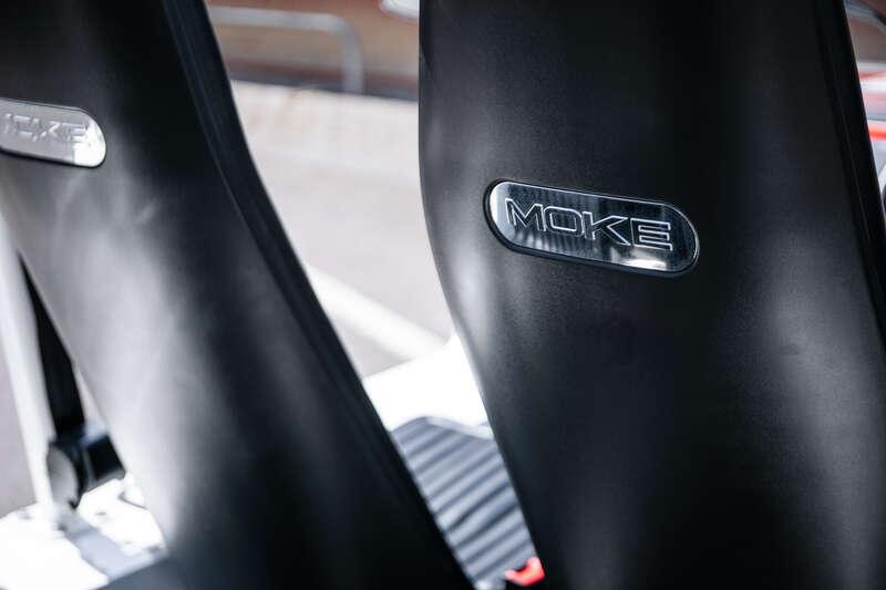 Finished in Coconut White with distinctive red and green ‘Moke’ graphics, the car presents with the unmistakable character and visual appeal that has made the modern Moke such a sought-after lifestyle vehicle. The interior continues the theme with a body-coloured dashboard, black vinyl upholstery and matching graphic detailing, complemented by chrome and brightwork elements including the front grille and windscreen surround.