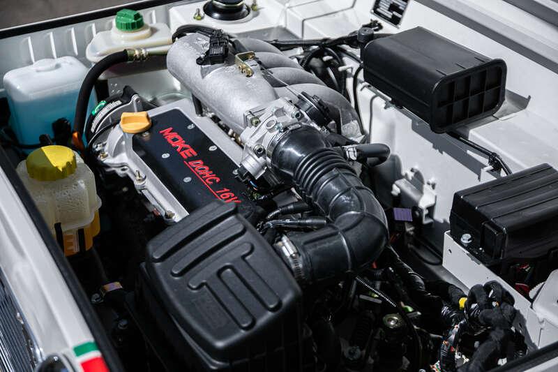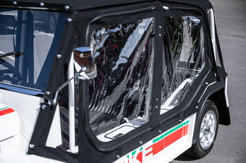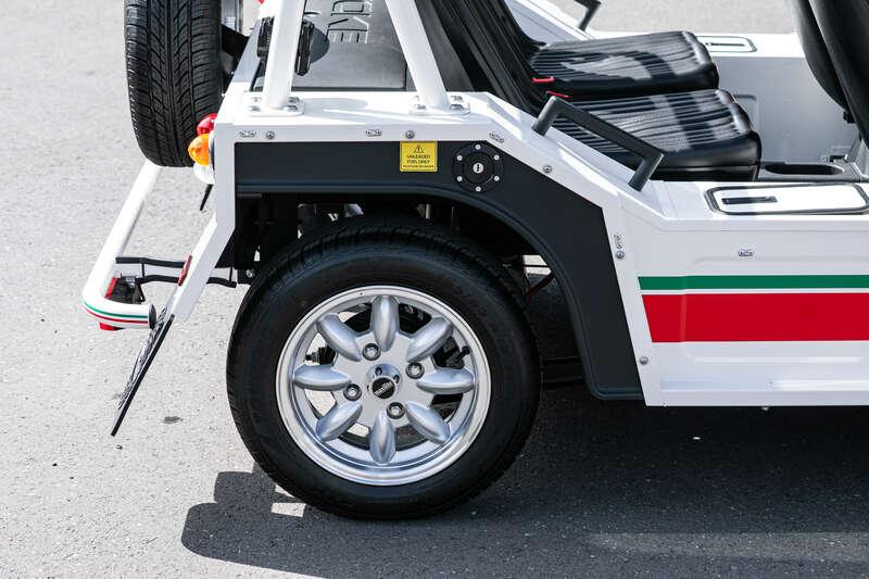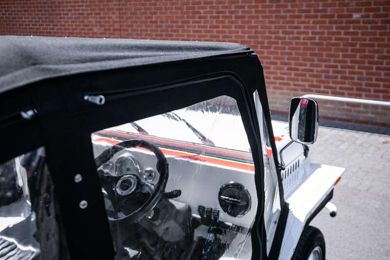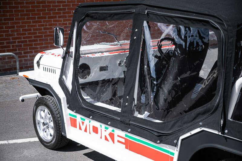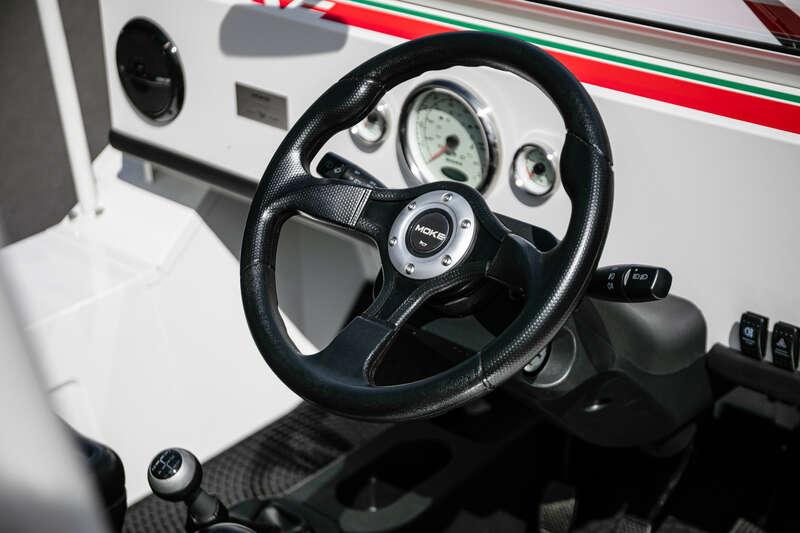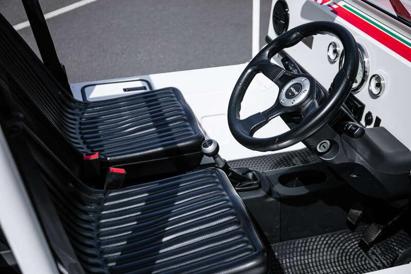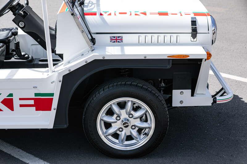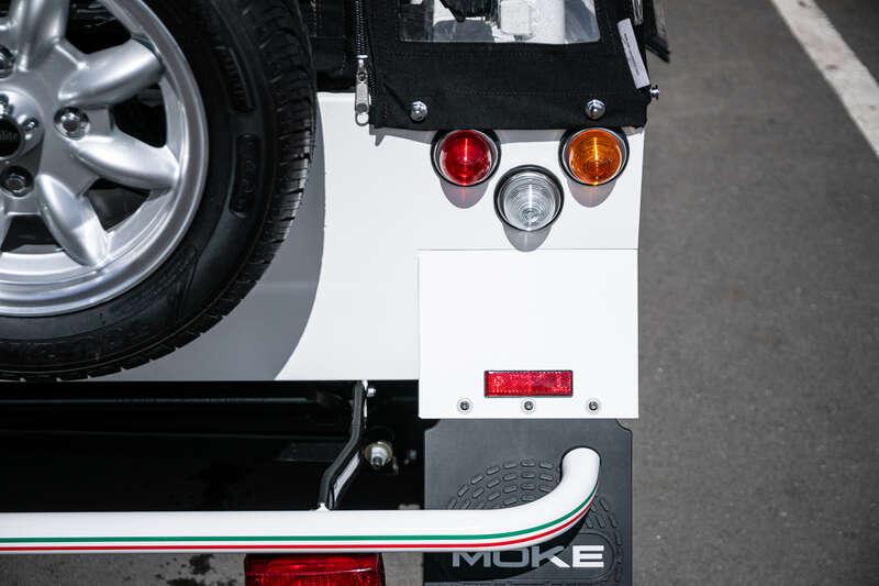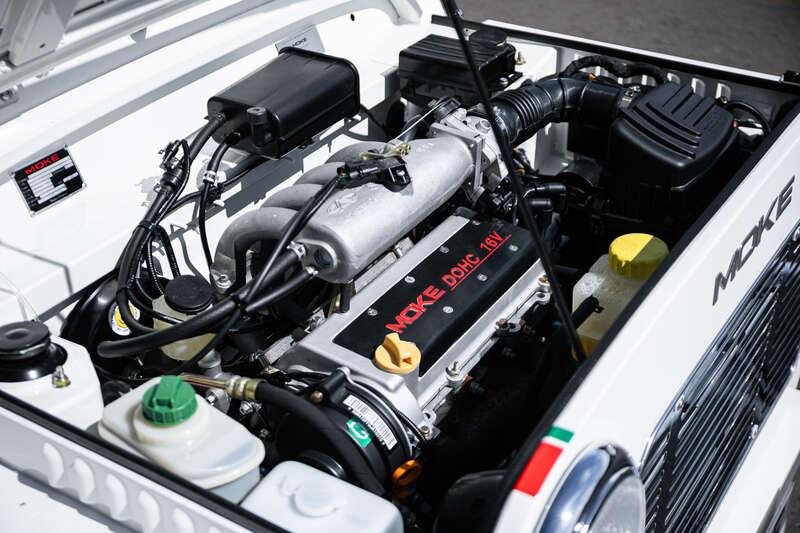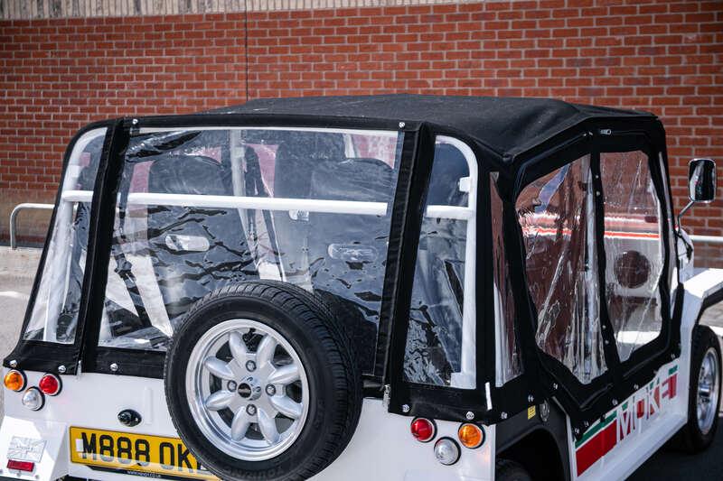 Finished in Coconut White with distinctive red and green ‘Moke’ graphics, the car presents with the unmistakable character and visual appeal that has made the modern Moke such a sought-after lifestyle vehicle. The interior continues the theme with a body-coloured dashboard, black vinyl upholstery and matching graphic detailing, complemented by chrome and brightwork elements including the front grille and windscreen surround.