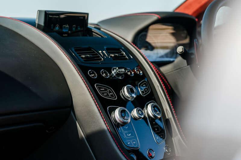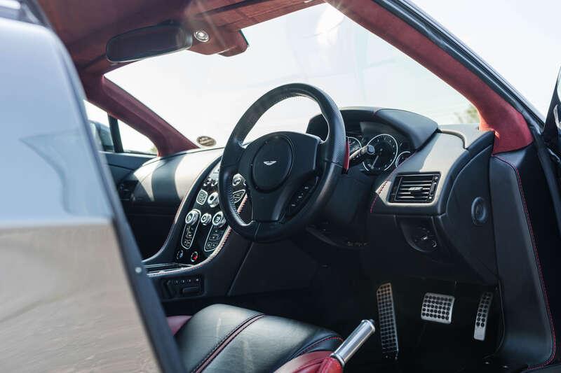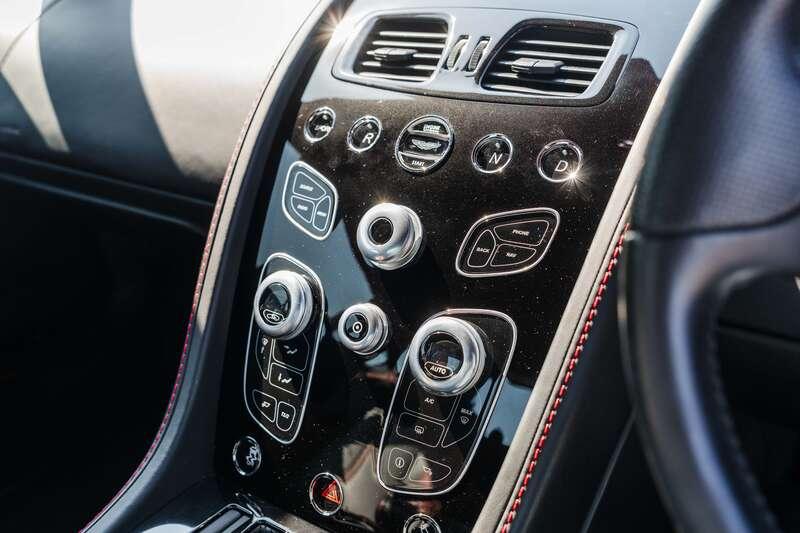 Finished in Meteorite Silver, the Aston presents superbly with 19” Satin Black alloy wheels, red brake calipers, and a carbon fibre front grille and bonnet louvres. The classic Aston interior is furnished in Obsidian Black and Chancellor Red leather with contrasting red stitching. Gloss Piano Black trim surrounds the centre consoles and touch points on the doors, interspersed with black and red elements there too, and the Alcantara headlining is finished in the same shade of red you'll see throughout. It’s a typical Aston cockpit and a rather special place to be.