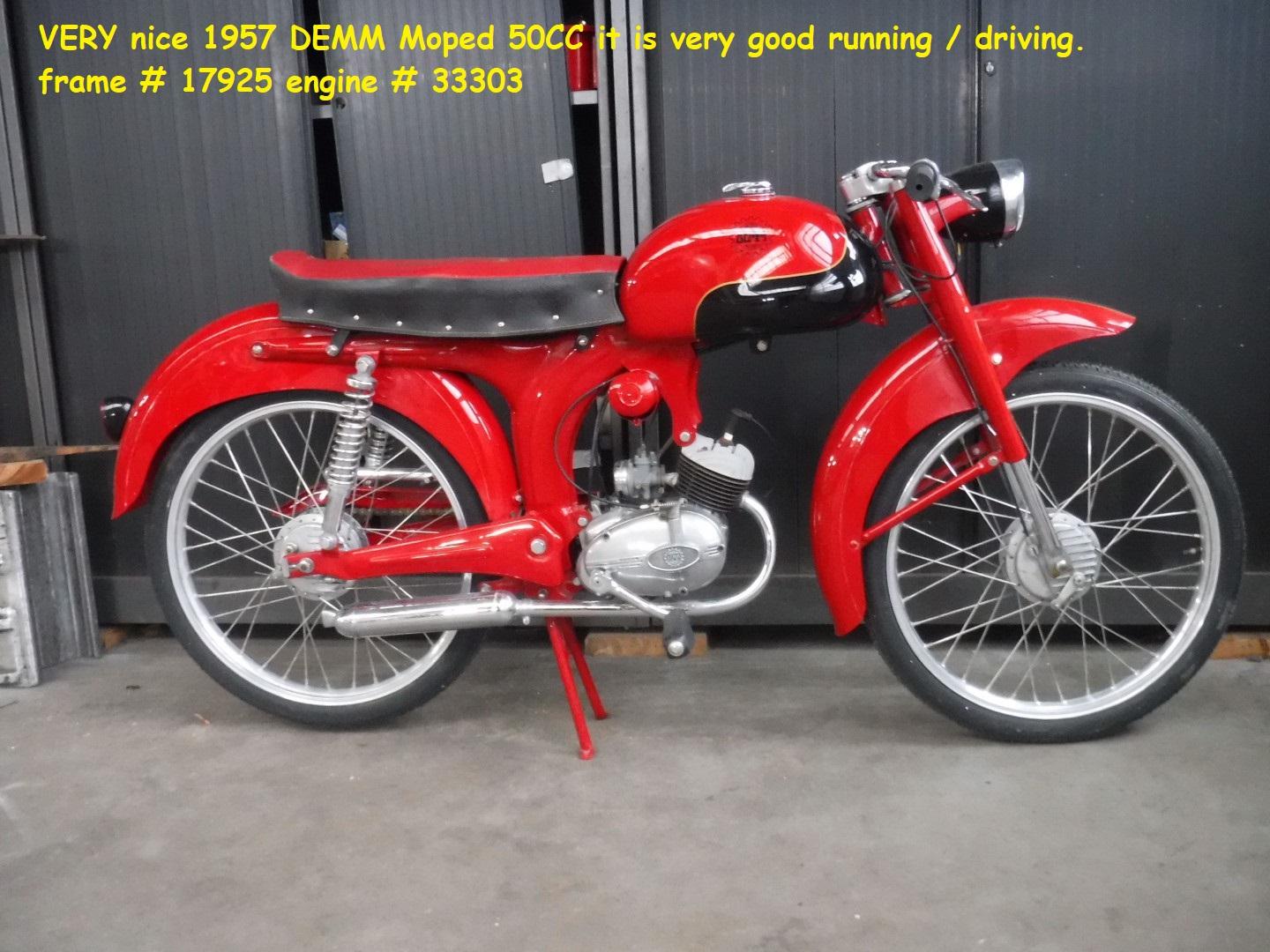 Vehicle Overview Technical Specifications Very nice 1957 DEMM Moped 50CC , It is very good running / driving. frame # 17925 engine # 33303 Exterior ColourRed Interior Colour