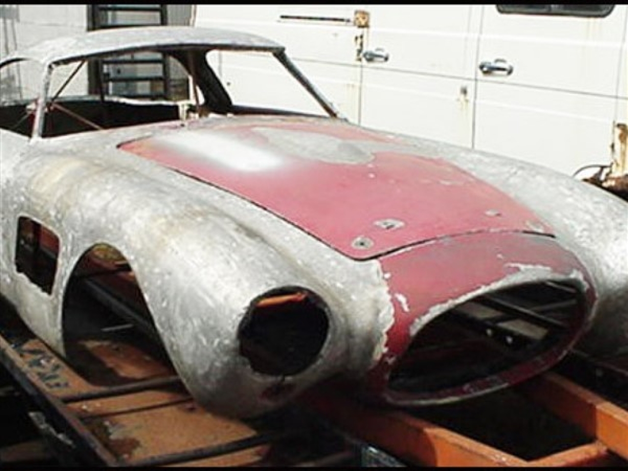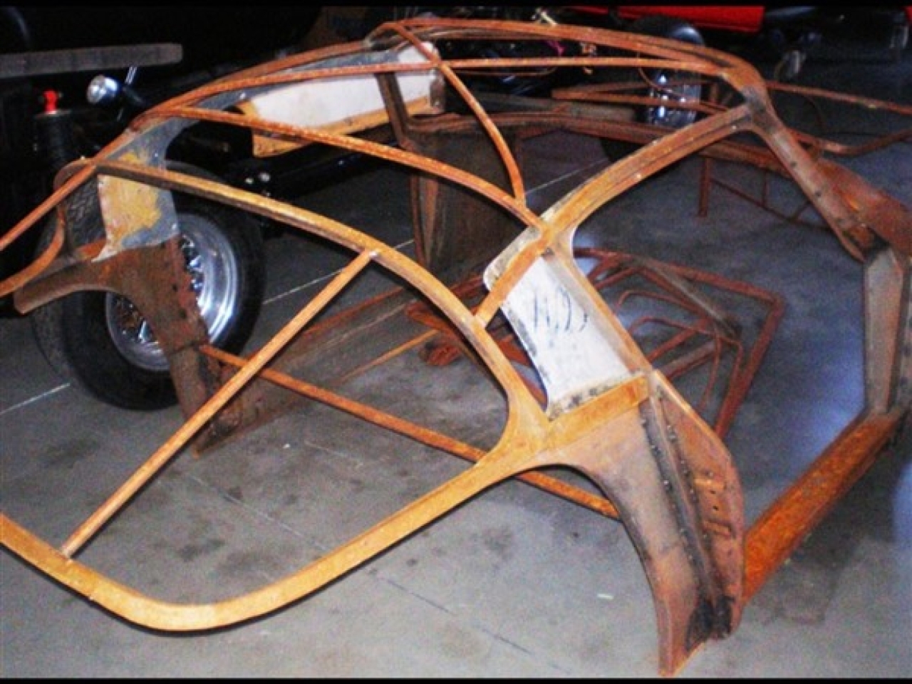 parking lights, one seat frame and seat track, original heater and remote fan, original 250 wiring harness, battery box, plastic mount plate, windshield post and all hardware, levers for the top latches, original horn set (disassembled), floors are installed, front brakes and rotors, hood and deck latches, side trim and jack plugs, wiper motor, Fiberglass dash is included. The car will be furnished with the doors and body mounted on a temporary basis for shipping.